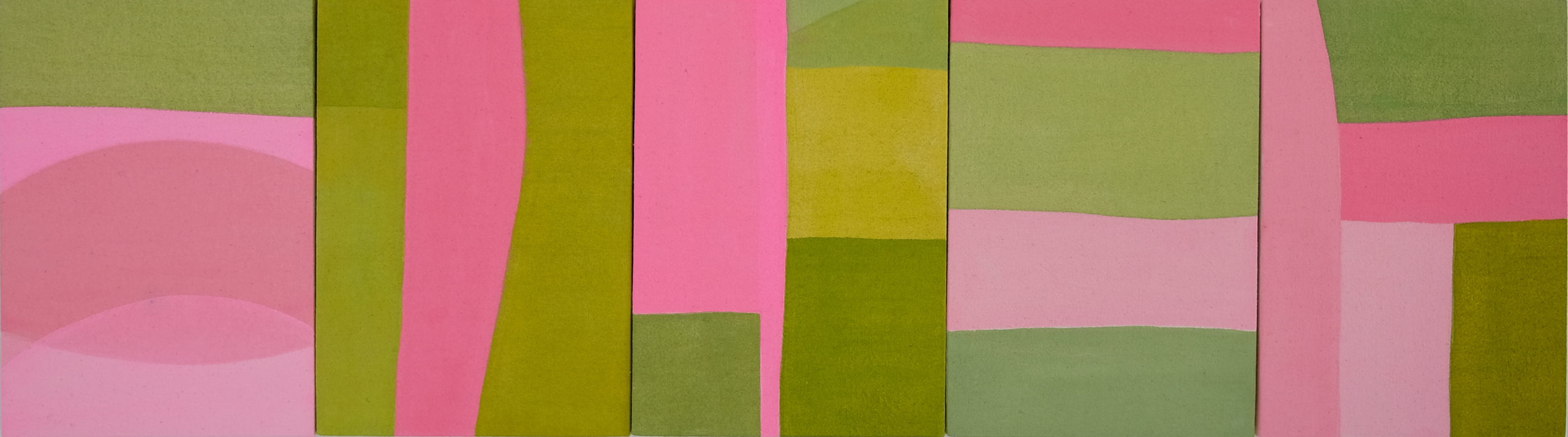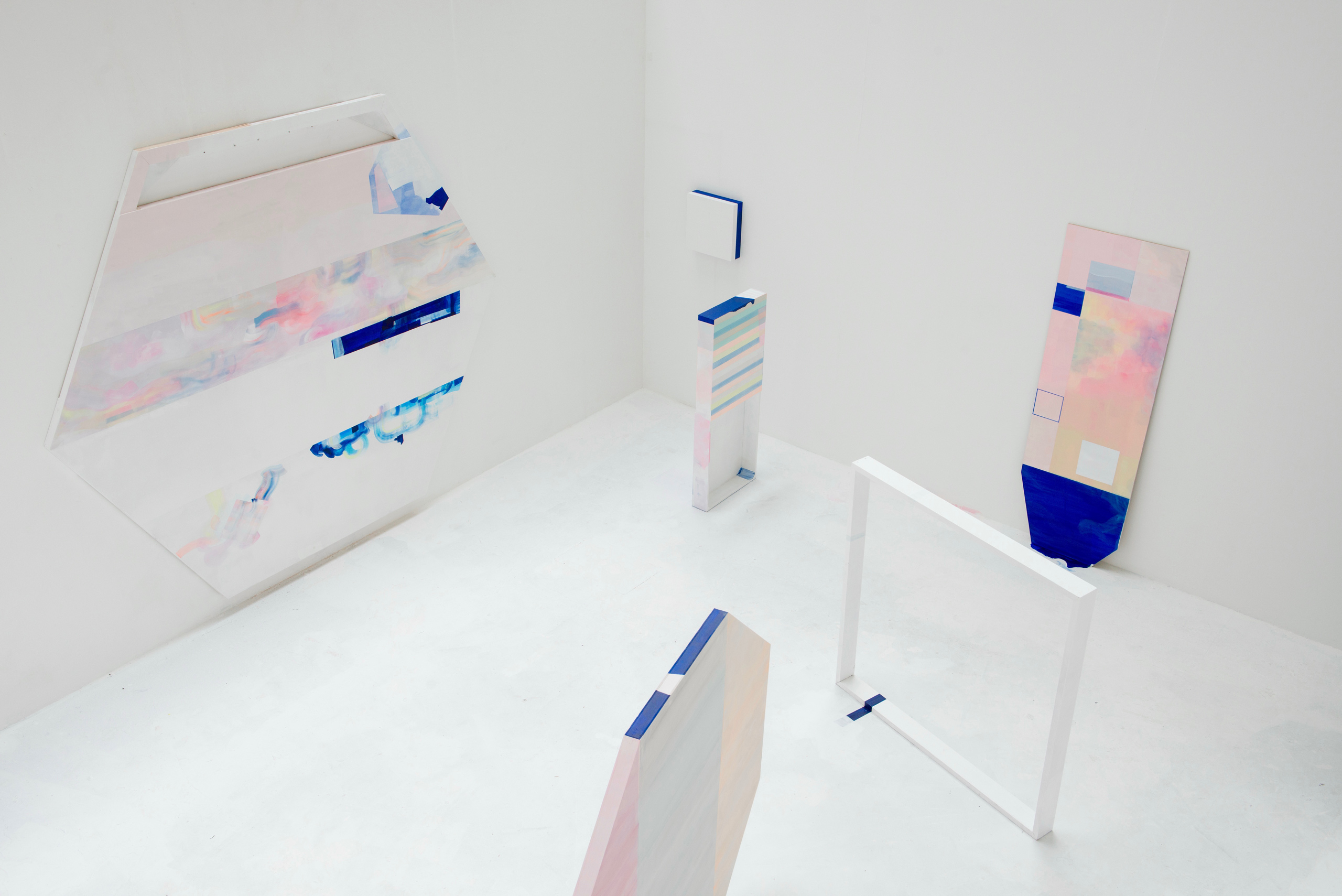 2016년 작업한 ‹수영장에서 그린 그림(Painting from Large Bath)›이 가장 먼저 떠오르네요. 런던에서 사용하던 작업실이 과거에 수영장이었다는 이야기를 들었어요. 매우 높은 유리 천장에서 강한 빛이 쏟아지곤 했는데, 누군가 수영을 즐기던 곳에서 그림을 그리고 있다는 사실이 매우 흥미롭게 다가왔죠. 같은 해에 완성한 ‹A Package›는 석사 졸업 전시를 위해 준비했던 작업이에요. 제게 주어진 공간 전체를 하나의 페인팅으로 만들고 관람자가 능동적으로 그림을 경험할 수 있도록 구성했죠. 작년에 작업한 ‹홈메이드 별장(Homemade Villa)›은 초록색의 테니스 코트와 핑크빛 타일의 수영장이 있는 공간을 상상하며 그렸어요.