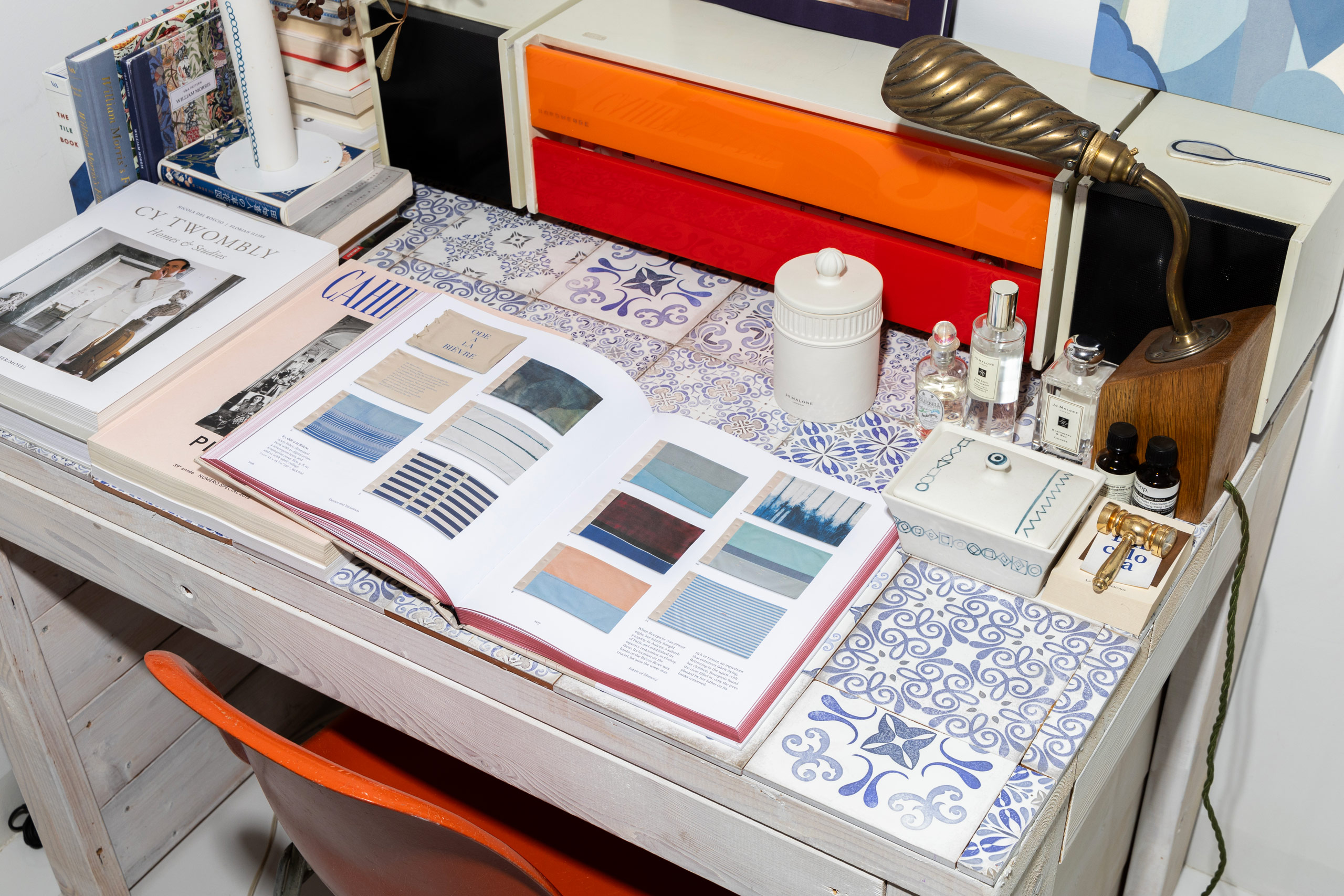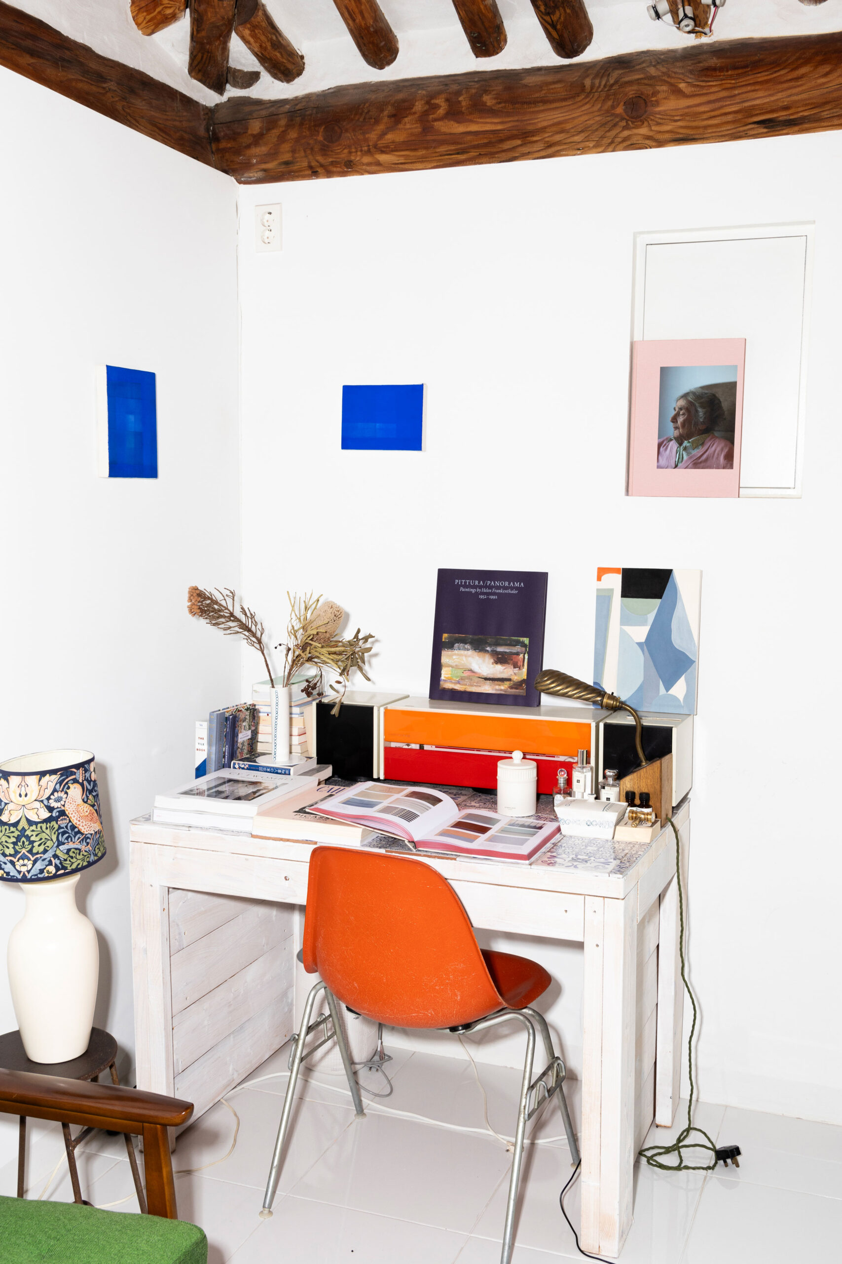 저만의 기준은 없어요. 필요할 때마다, 마음에 드는 아이템이 생길 때마다, 하나씩 구입했어요. 처음 작업실을 시작할 당시에는 거의 텅 빈 상태였고, 하나둘씩 채우다 보니 5년이 흘렀네요. 서양 빈티지 가구와 한국 고가구, 현대 가구가 모두 한데 섞이게 됐어요. 부엌에 있는 싱크대와 서재의 책상은 목공소에서 제작한 후 그 위에 직접 타일을 붙였어요. 책상 앞에 놓인 오렌지색 임스 체어는 제가 처음으로 구입한 빈티지 가구라서 특히 기억에 남아요.