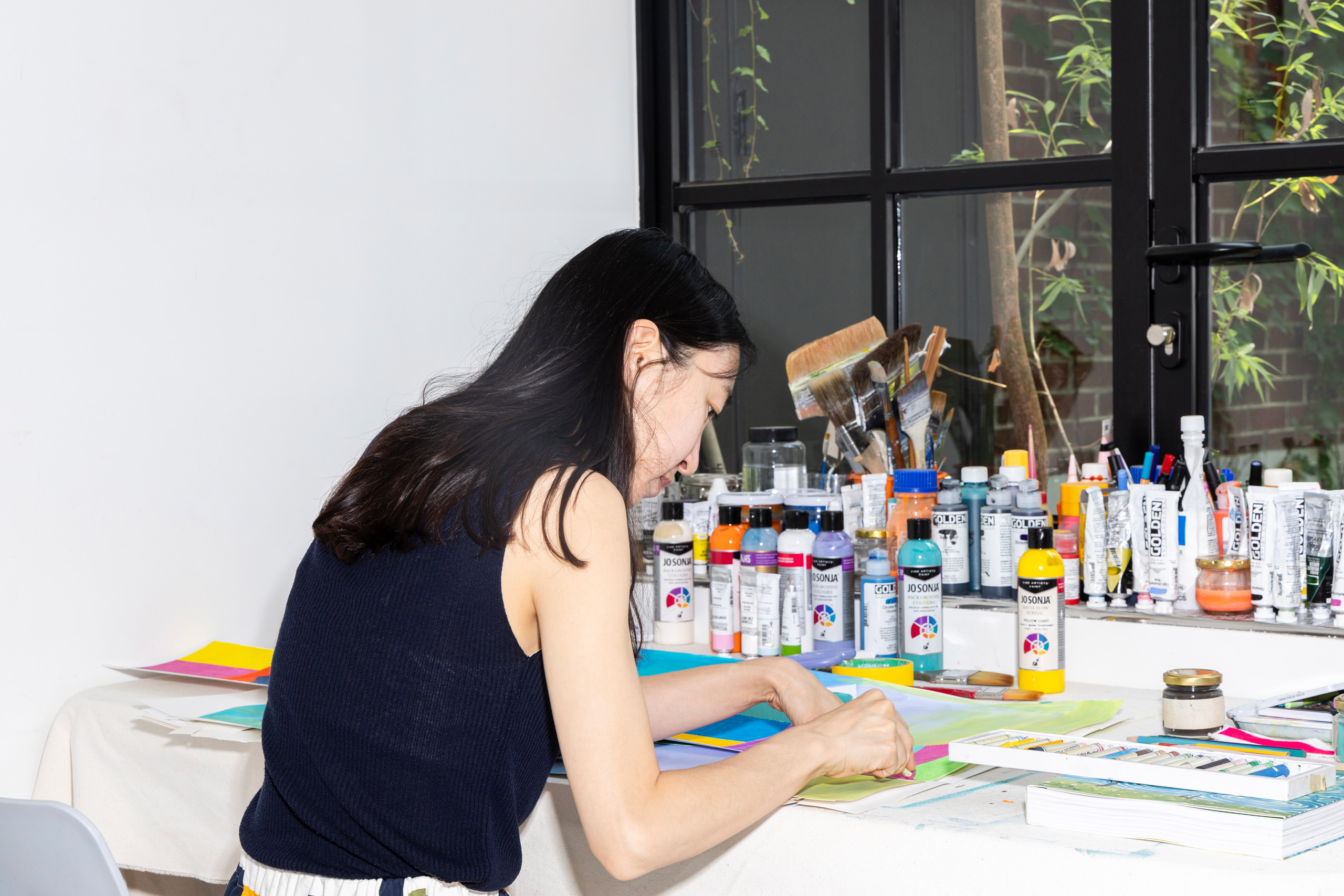 전시를 준비하며 한지를 보러 갔다가 동양화에 쓰이는 분채를 발견했는데, 색이 너무 곱고 예뻤어요. 서양 물감과는 다른 색의 세계를 본 것만 같았죠. 우선 몇 가지만 샀는데 사용해 보니 더욱더 마음에 들어서, 다른 색상도 전부 써보고 싶어졌어요.