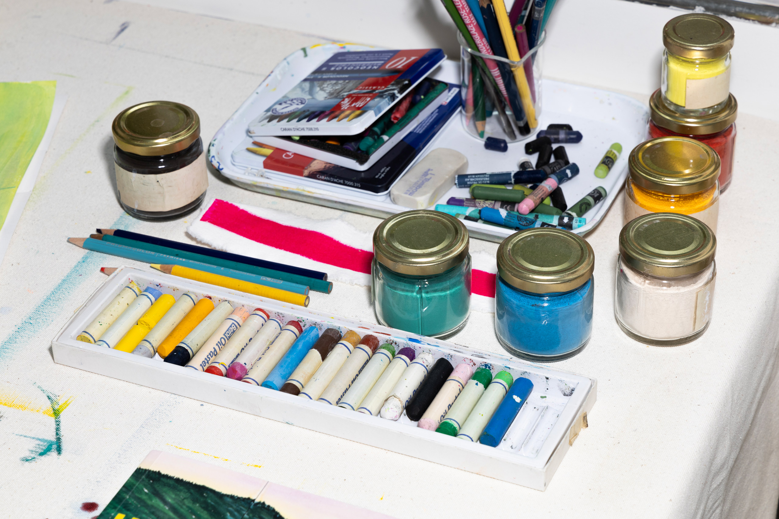 안료가 물감보다 훨씬 선명해요. 칠할수록 그 색의 느낌이 분명하게 다가오죠. 물감을 쓰면서 물로 농도 조절을 할 수 있지만, 안료와 바인더의 비율을 조절하며 사용하는 게 더 편하게 느껴져요. 아이와 함께 그림을 그리면서, 물감과는 다른 크레파스와 색연필의 매력도 알게 됐어요. 페인팅은 작업실에서만 하고 집에서는 고체 재료를 사용해 작업하는데요. 색연필은 섬세한 표현이 가능하고, 크레파스는 그릴수록 칠의 표면이 뭉그러지거나 특유의 텍스처가 살아나는 게 마음에 들어요.