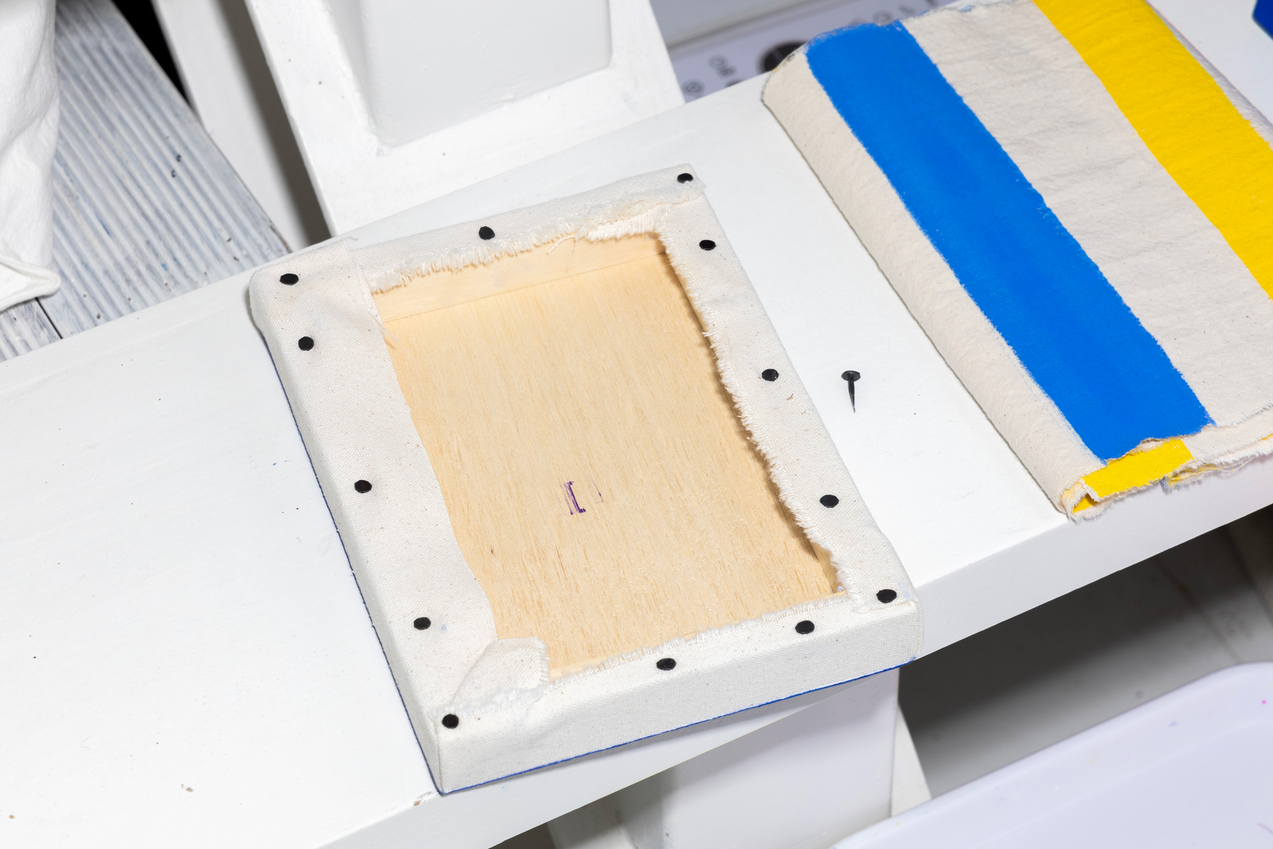 대부분 기성품으로 나온 캔버스를 구입하지만, 저는 페인팅에 필요한 캔버스를 직접 만들어요. 기성품에는 미리 제소를 발라 놔서 안료가 천에 스며들지 않거든요. 직접 만들 경우에도 보통 건 태커Gun Tacker로 캔버스를 틀에 고정하는데, 저는 망치와 작은 못을 사용해요. 외국에서 바닥 카펫을 시공할 때 사용하는 못인데요. 시카고에서 공부할 때 학생들은 자기가 쓸 캔버스를 직접 다 만들어야 했거든요. 그때 습득한 방법입니다. 패브릭은 화방에서 파는 캔버스 천이나 광목을 두루 사용해요.