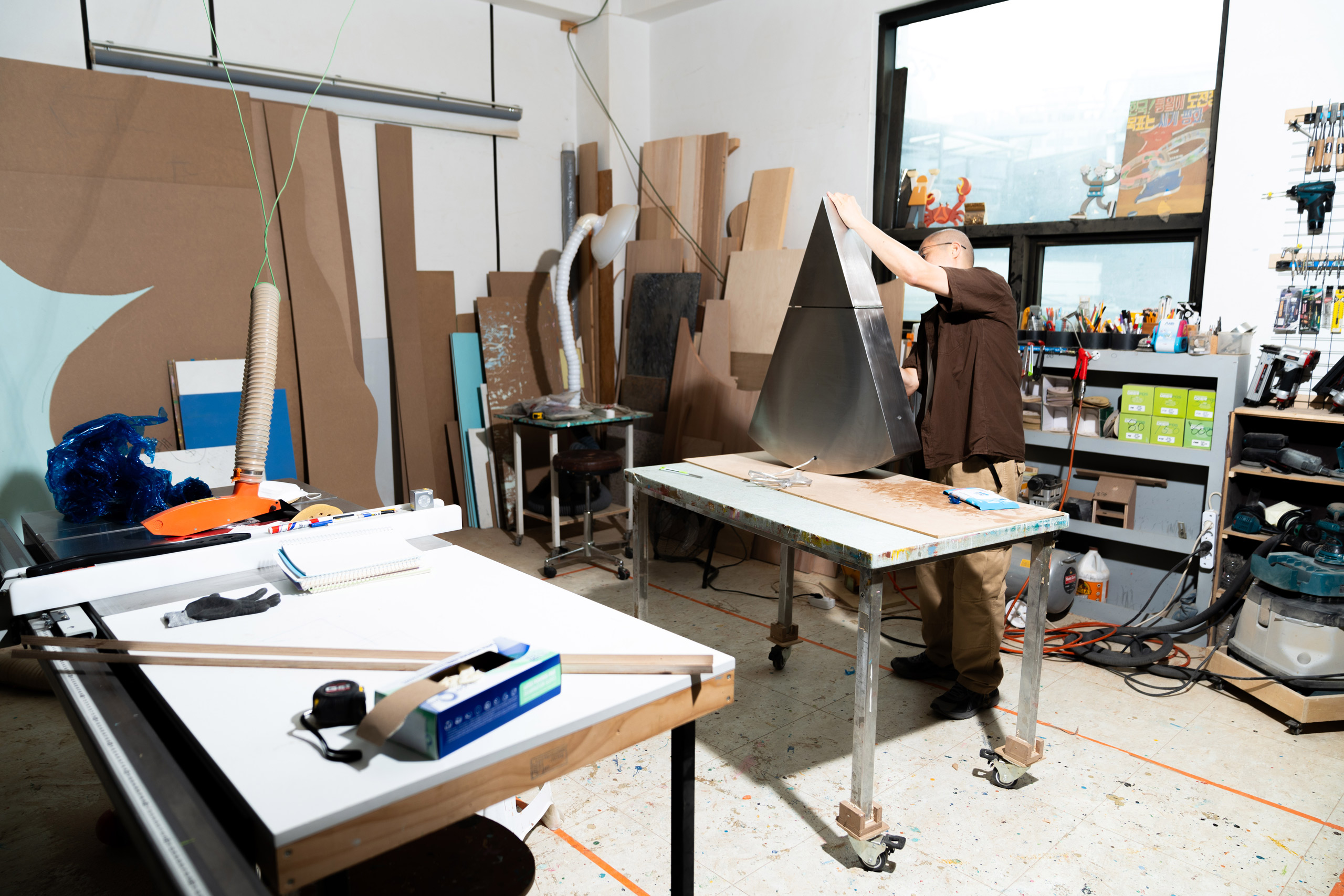 가장 큰 장점은 필요한 재료를 빠르게 구할 수 있고, 아크릴이나 금속 제작 거래처에 가까워 오가기 편하다는 거예요. 반면, 도매시장 한복판이라서 저녁 6시부터 자정까지만 작업실 쪽으로 차를 진입할 수 있는 건 단점이죠. 그래서 백화점 디스플레이를 진행할 때 사실 가장 힘들어요. 백화점은 매장 문을 닫은 후에야 설치 및 철거 작업이 가능하잖아요. 근데 자정이 지나면 작업실 쪽에 주차할 수가 없으니까… 양측의 시간을 맞추는 게 쉽지 않죠. 골목 입구에서 작업실이 있는 건물로 접어드는 도로가 좁고 울퉁불퉁해서 짐 옮기는 일이 힘들기도 하고요. 그래서 크고 단단한 바퀴가 달린 수레를 여러 개 제작했어요.