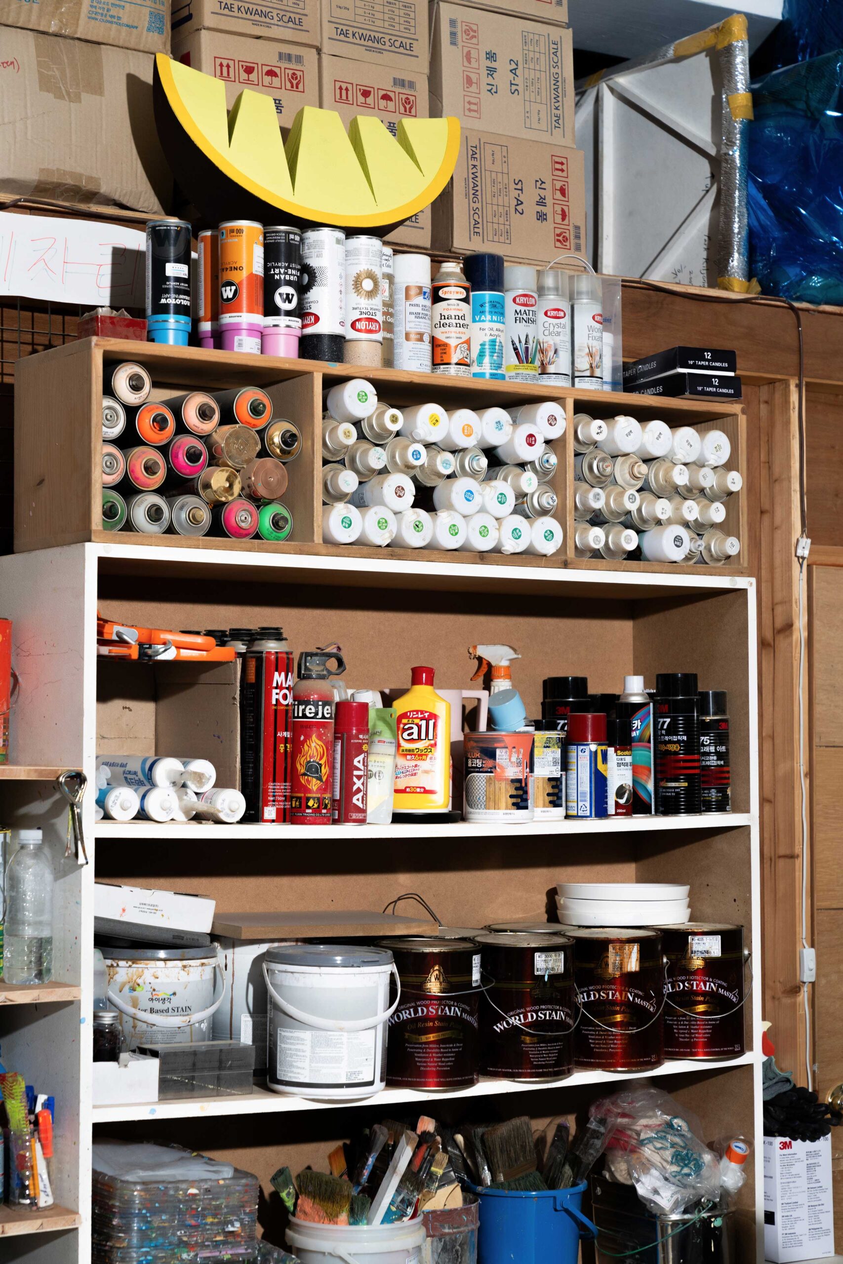 구입한 건 거의 없어요. 산책하다가 길에서 발견해서 주워 오는 경우도 있고요. (웃음) 필요한 게 생기면 보통 저나 멤버들이 만들어요. 그래서 작업실의 분위기나 공간 구조가 수시로 바뀌는 편이에요. 여기 작업실 한가운데 있는 수납장도 얼마 전에 만든 거예요.