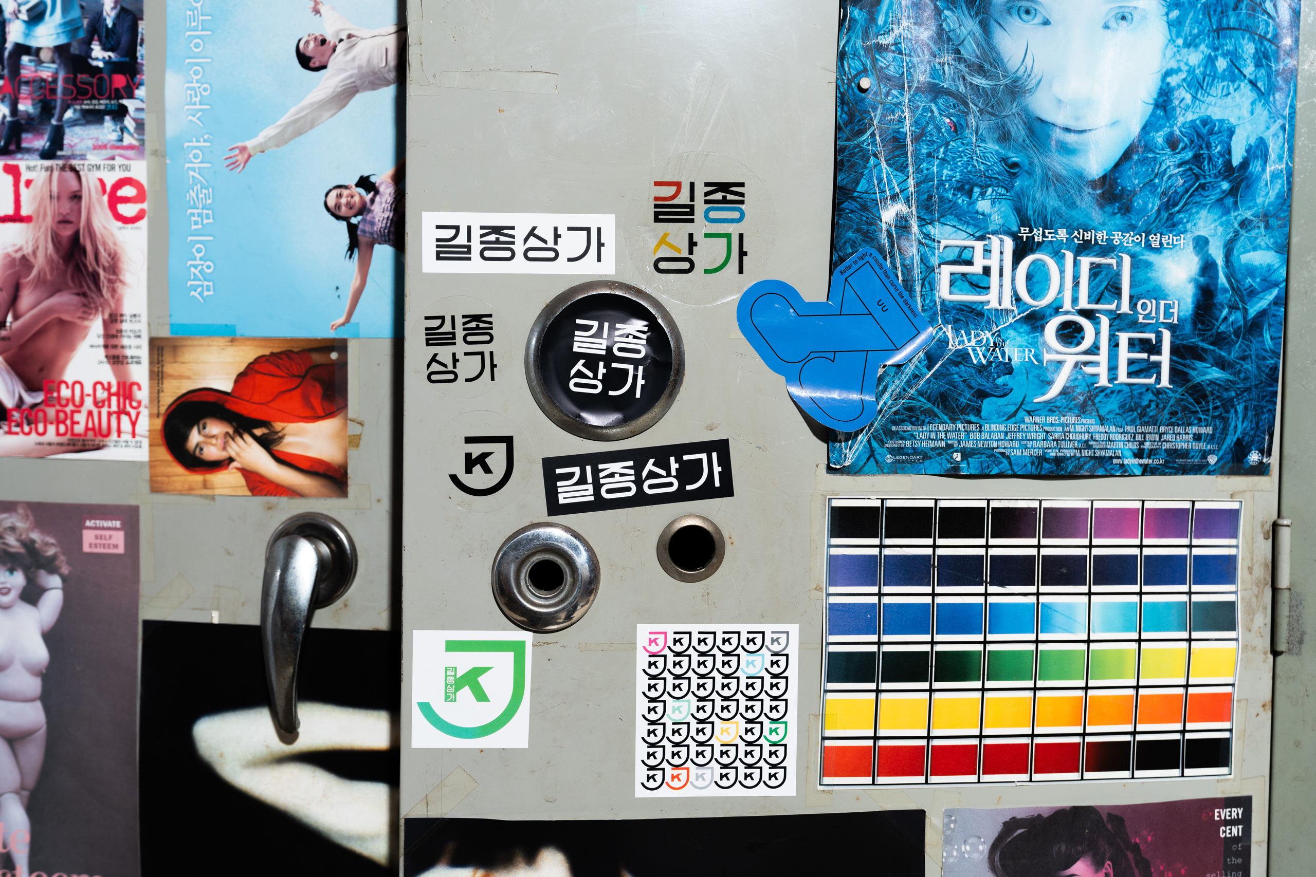 오래된 영화 포스터, 엽서, 이미지가 잔뜩 붙은 철제 캐비닛이 눈에 띄네요.