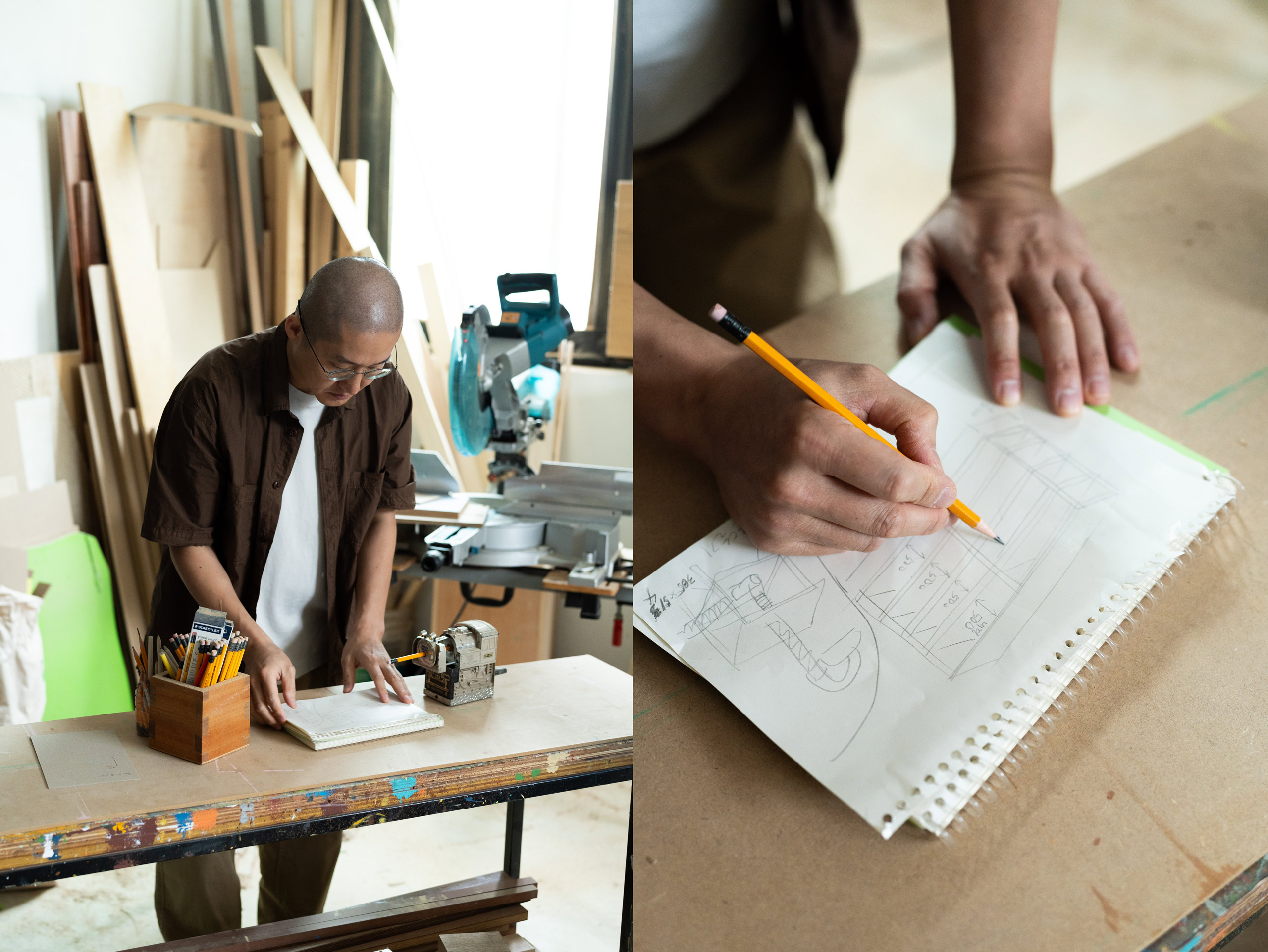 프로젝트를 위한 스케치뿐 아니라 수시로 머릿속에 떠오르는 것을 메모하듯 스케치해요. 나중에 살펴보면 좋은 영감의 도구가 되더라고요. 공동 작업에 들어가기 전에 다 같이 모여서 브레인스토밍을 할 때도 유용해요. 스케치를 통해 서로의 생각을 발전시킬 수 있거든요. 그래서 연필과 연습장이 정말 많이 필요해요. 작업실에도 손 뻗으면 닿을 자리에 항상 연습장을 비치해 둬요. 학창 시절부터 크로키와 드로잉을 많이 했는데, 그때 단련한 기술이 지금 많은 도움이 되고 있어요.