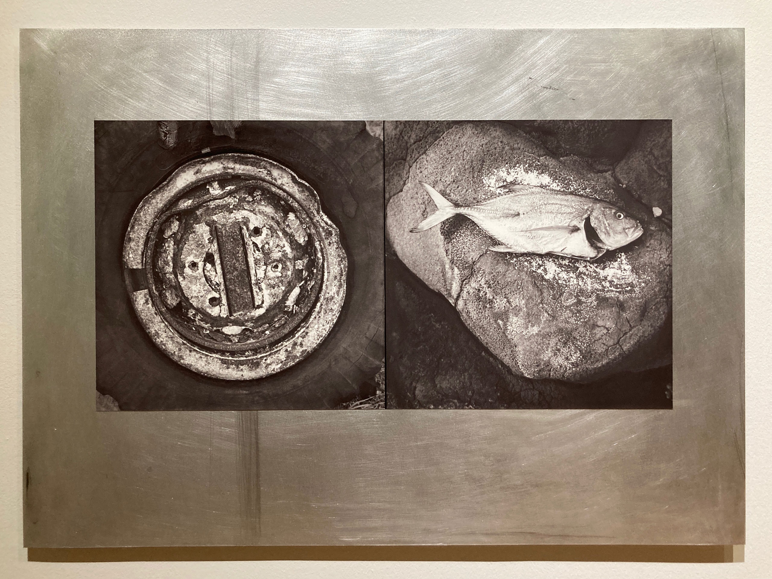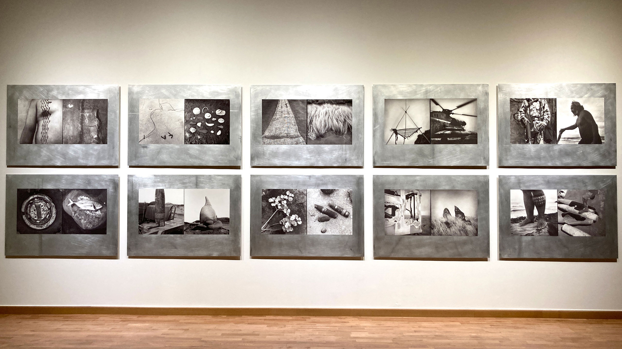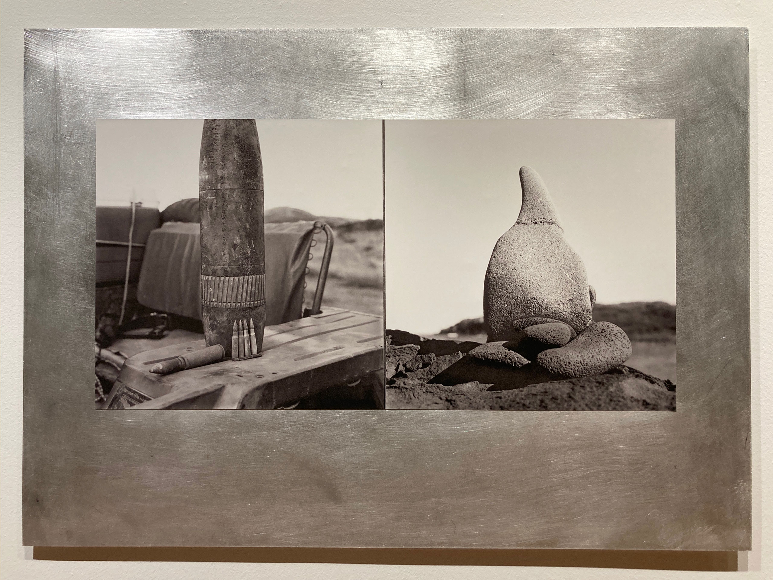 이탈리아계 미국인 프랑코 살모이라기는 1968년부터 하와이대학교에서 학생을 가르치며 하와이의 자연환경과 정신적 가치를 지키려는 이들을 사진으로 기록해왔다. ‹Tortured Metal, Broken Stone› 연작은 하와이에서 신성한 섬으로 여기는 카호올라베섬에서 촬영한 것이다. 카호올라베섬에는 고고학적 유적이 많이 있었지만, 1941년 미국 연방 정부가 차지해 포격 연습장으로 사용하며 황폐해졌다. 운동가들의 노력과 헌신으로 20여 년 만에 군부대가 철수하며 섬이 반환되었는데, 살모이라기는 반환 직후부터 꾸준히 섬에 들러 폭력의 흔적과 그 와중에 다시 피어나는 연약한 생명의 흔적을 병치한 사진 작업을 진행했다. 이 두 가지 사물과 풍광은 하나의 알루미늄판에 배치했는데, 의미적·조형적으로 너무 멀지도 가깝지도 않은 거리에 있는 두 컷을 붙여 자신의 목소리를 드러낸다.