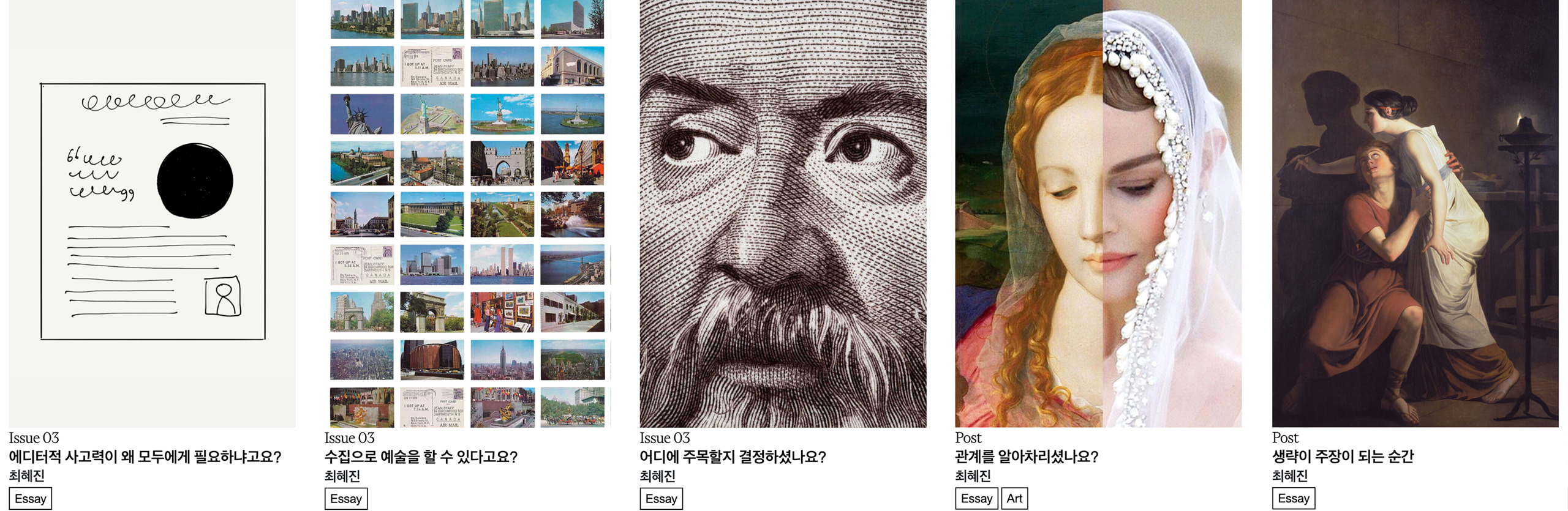 ‘편집으로 창작하기’를 6개월째 연재하면서 ‘편집이란 무엇인가? 에디터적 사고력이란 정확히 어떤 능력인가?’라는 질문을 스스로 집요하게 던지고 있다. 편집자 타이틀을 가진 여러 사람―이를테면 일간지와 주간지의 편집 기자, 문예지와 단행본 편집자, 패션 라이프스타일 잡지 에디터, 다양한 플랫폼의 콘텐츠 에디터, 영상 편집자 등―이 하는 공통적인 행위에 관심이 간다. ‘글과 이미지 모두에 적용가능한 편집의 작동 원리를 설명할 수 있다면 편집이 가진 창조성을 정확히 이해할 수 있지 않을까? 이미 존재하는 재료에서 새로운 가능성을 발견하는 힘을 더욱더 기를 수 있지 않을까? 궁극적으로 정보를 해석하는 주체로서 에디터십을 가지고 자기 삶을 바라볼 수 있지 않을까?’ 하는 궁금증을 지니고 연재를 이어가는 중이다.