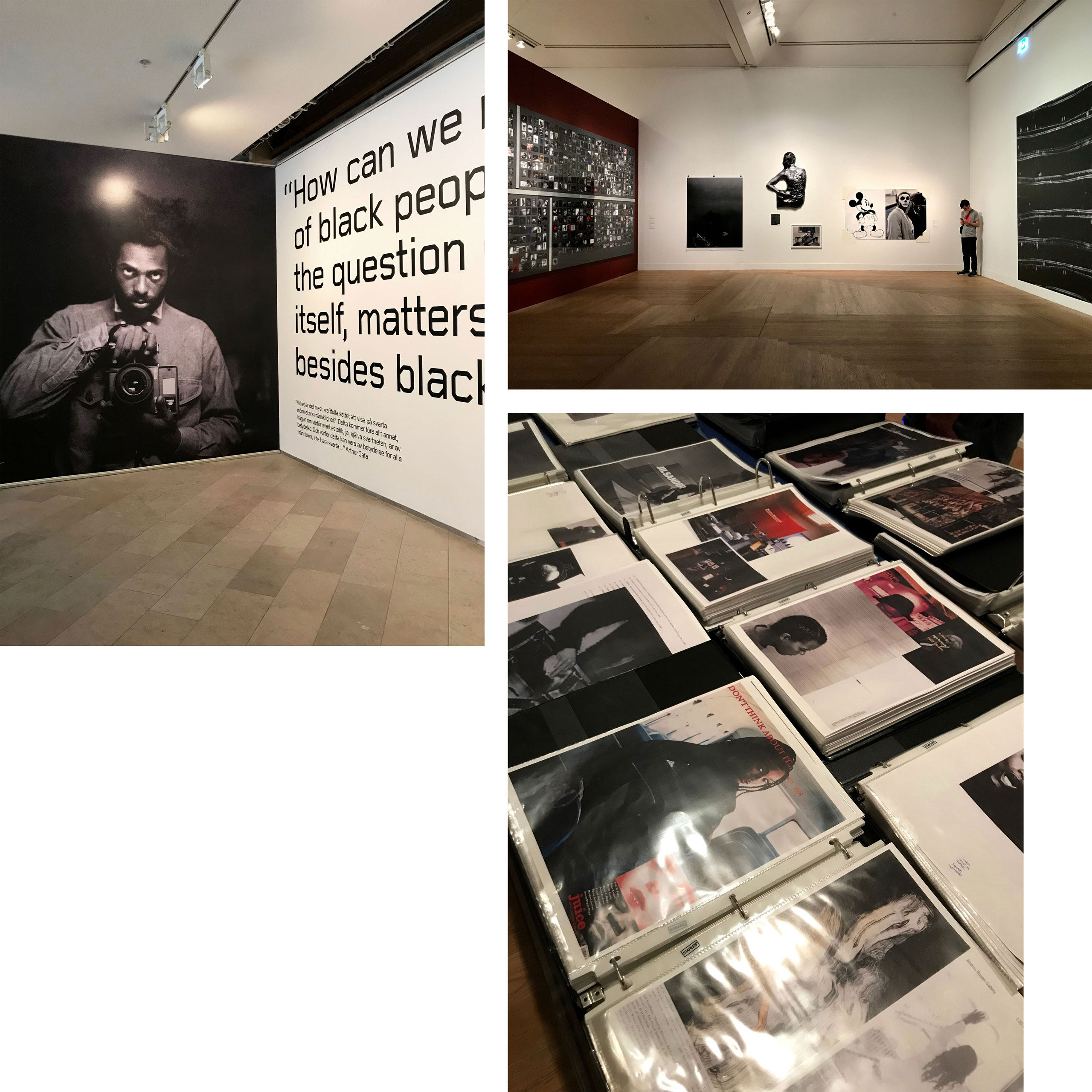 아서 자파의 개인전이 열렸던 스톡홀름 현대미술관(Moderna Museet) 전시장 풍경. 전시장 한쪽 벽에는 자파가 컴퓨터에 저장한 디지털 이미지의 출력본을 빼곡히 붙여두었고, 전시장 중간 테이블 위에는 어마어마한 양의 스크랩 북을 놓았다. 아프리카계 미국인을 미디어에서 재현하는 방식이나 흑인 문화의 흔적과 관련한 이미지, 작가를 매혹한 낯선 이미지가 뒤섞인 상태였다. © 최혜진