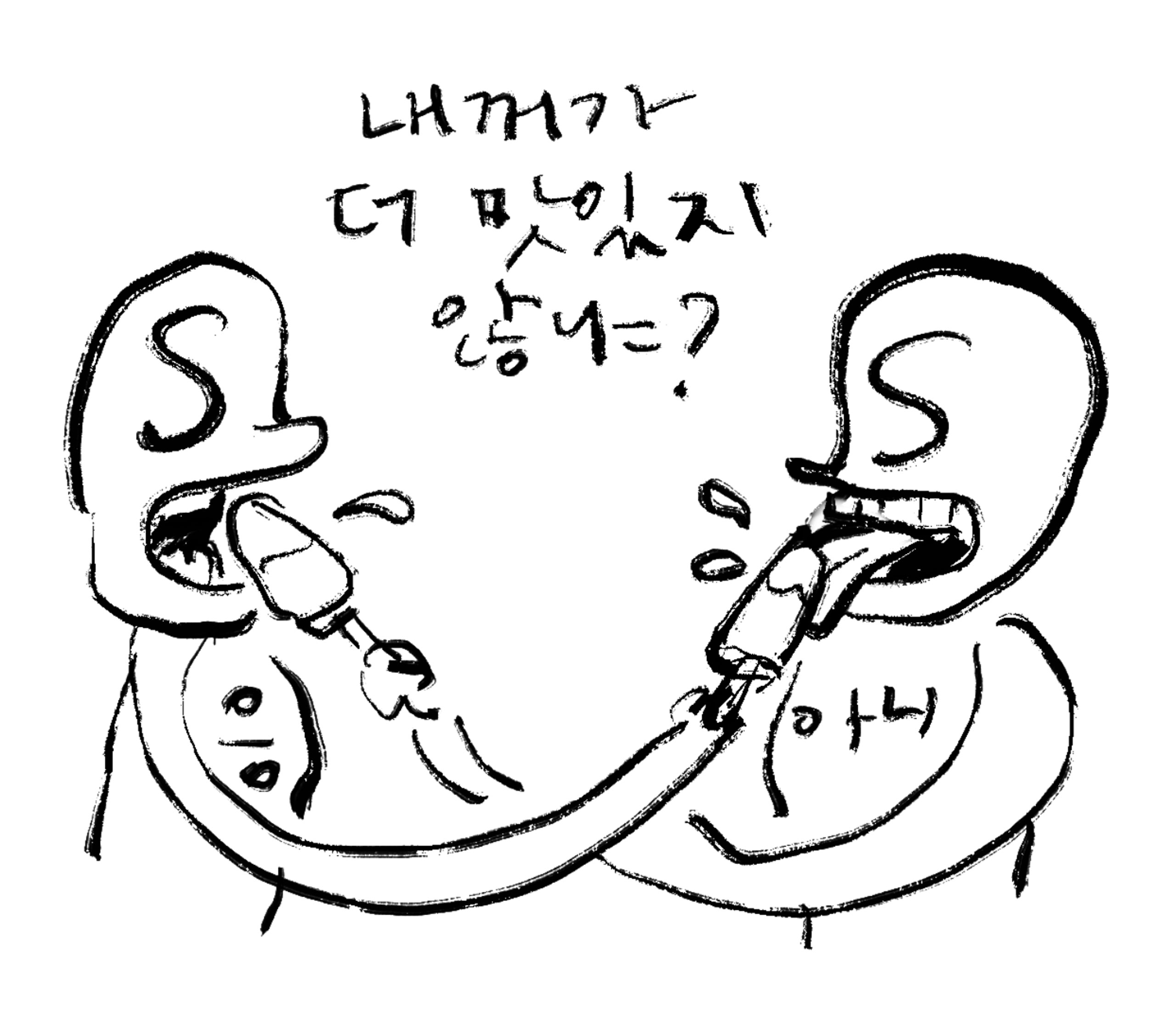 스 : 저희 둘이 처음에는 가까이 붙어 있었잖아요. 센스 님~ (오래전 빙하기 이전 시대를 상상하는 듯한 표정으로) 인간들이 처음 이 땅에 태어나서는 저희 둘을 구분도 안 되게 막 버무려 사용해 줘서 센스 님도 킬킬 웃고 저도 많이 웃고 그랬는데요. 인간 어린이들이 젓가락질 기술을 배울 때도 기어코 자기 멋대로 해보려고 막 그릇 채 입을 대면서 경이로운 다툼을 하잖아요. 엄마 인간들은 기어코 어른들의 세상을 (뭐가 좋다고) 물려주려고 손가락 위치와 각도를 가르치고 애쓰면서요.