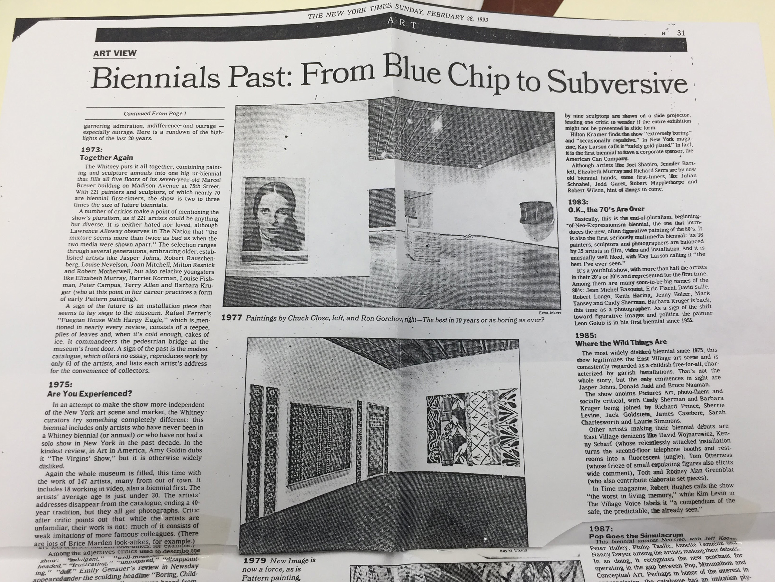 1993년에 열린 전시 자료를 찾기 위해 방문한 뉴욕 휘트니 미술관의 자료 상자에서 찾은 1993년 신문 기사 스크랩.