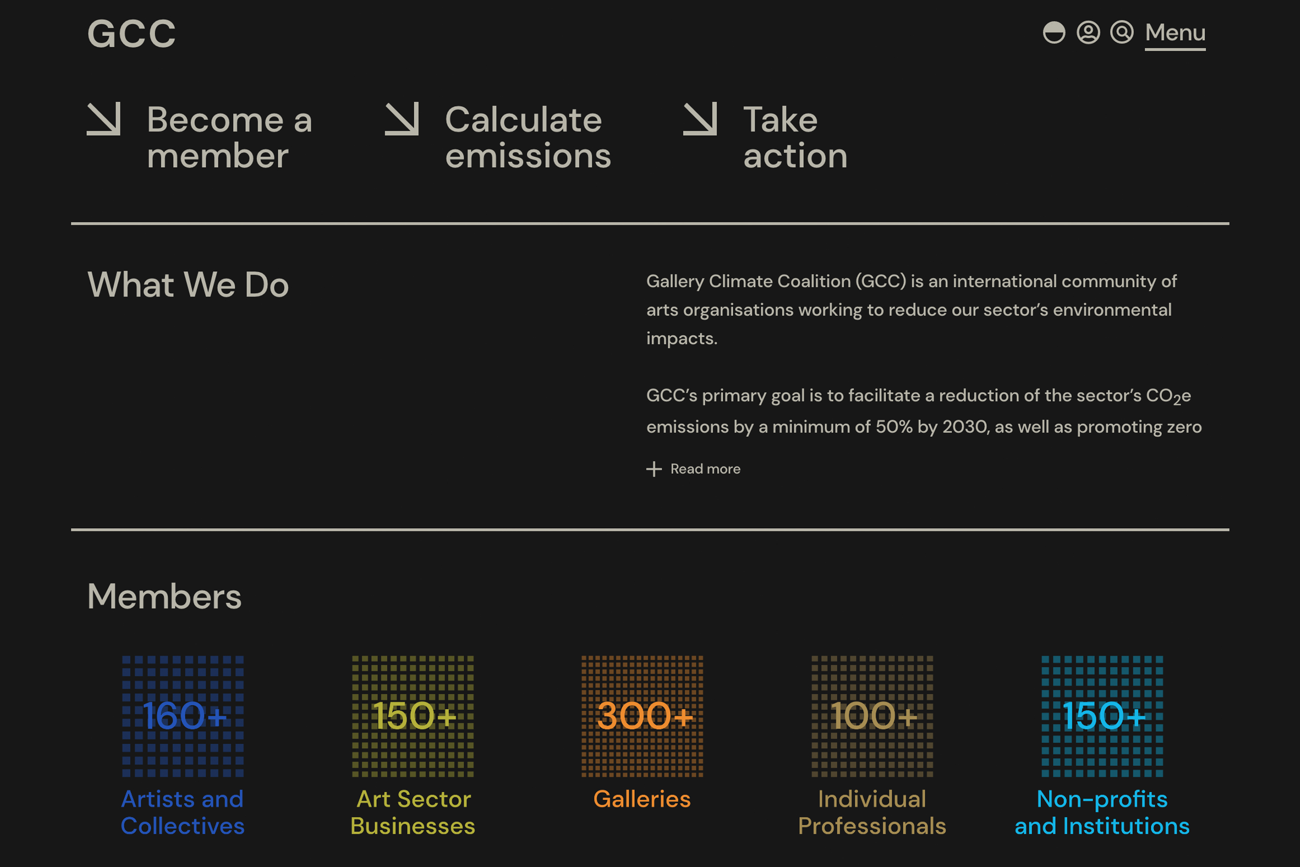 갤러리 기후 연합(Gallery Climate Coalition, GCC)은 galleryclimatecoalition.org 통해 미술 전시의 탄소 배출량을 측정하는 가이드라인, 배출량을 줄이는 방법 등을 상세하게 제공한다. ‘미술 전시 탄소 배출량 계산기’를 살펴보길 권한다. 링크: https://galleryclimatecoalition.org/carbon-calculator/