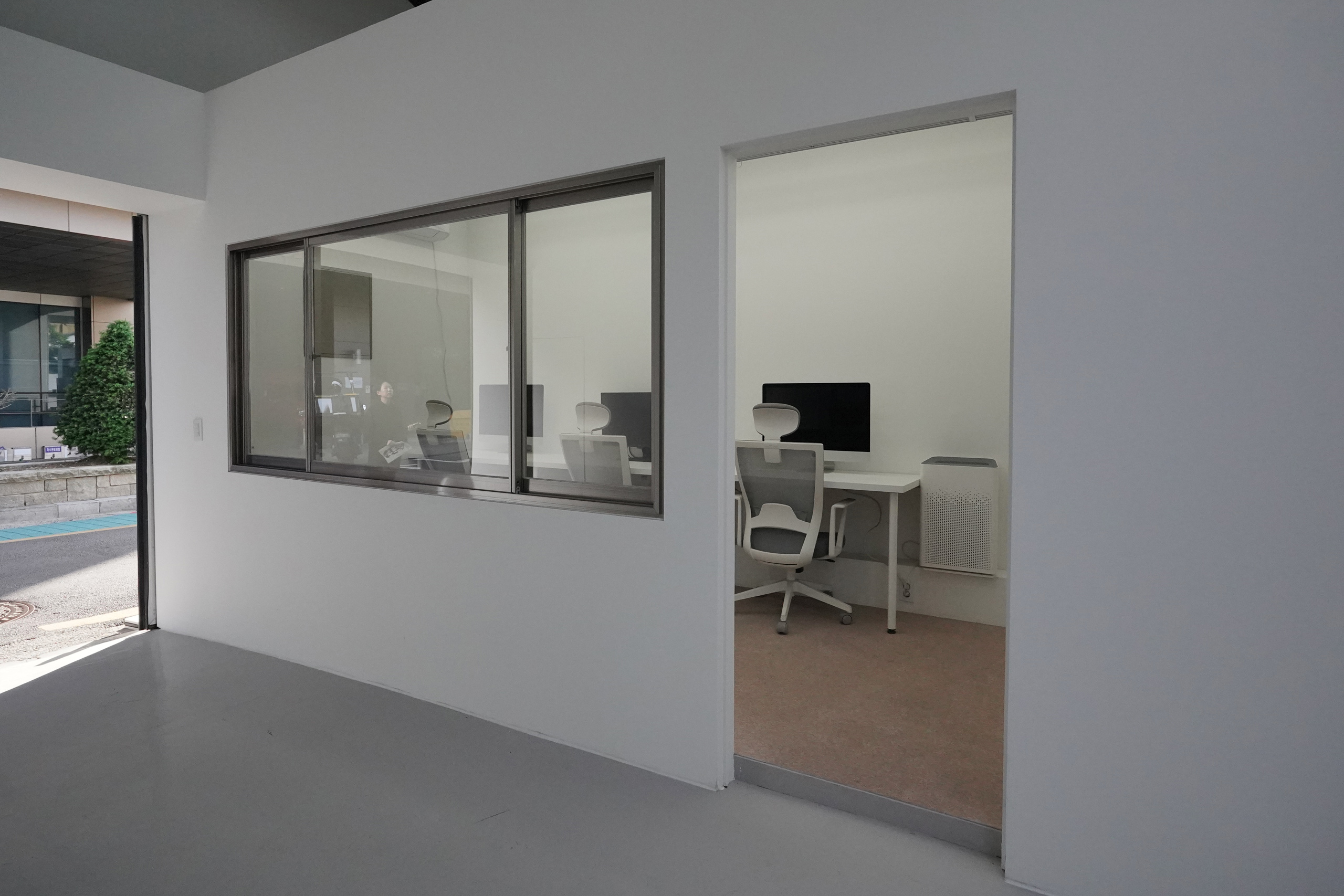 언뜻 보면 «Hall 2»는 이해하기 힘든 것투성이다. 전시 공간 ‘Hall 1’에 몇 가지 집기가 놓여 있고, 마치 3D 도면 프로그램 화면에 오류가 난 것처럼 바닥이 푹 파여 있는가 하면, 평소 사무실로 사용했다는 작은 방에는 ‘복사+붙여넣기’를 한 것처럼 똑같이 생긴 아이맥 세 대와 사무용 의자 세 개가 놓여 있다. 전시장 입구에서 관람객을 반기는 꽤 친절한 텍스트 덕분에 우리는 눈 앞에 펼쳐진 풍경이 예술 작업과 커머셜 공간 디자인 일을 병행하는 김동희 작가가 소환한 다양한 전시-공간-기억의 모음이라는 걸 알게 된다. (물론 전시-공간-기억을 실제 공간으로 소환하는 과정이 결코 순탄했을 리 없다. ‘스케치업’ 같은 프로그램 이미지를 현실에 구현하는 과정에서 의도대로 구현하지 못하는 부분이 발생하기 마련이고, 실수인지 의도인지 알기 어려운 전시 공간의 몇몇 모습은 이런 오류가 우리 눈앞에 나타난 결과니까!)