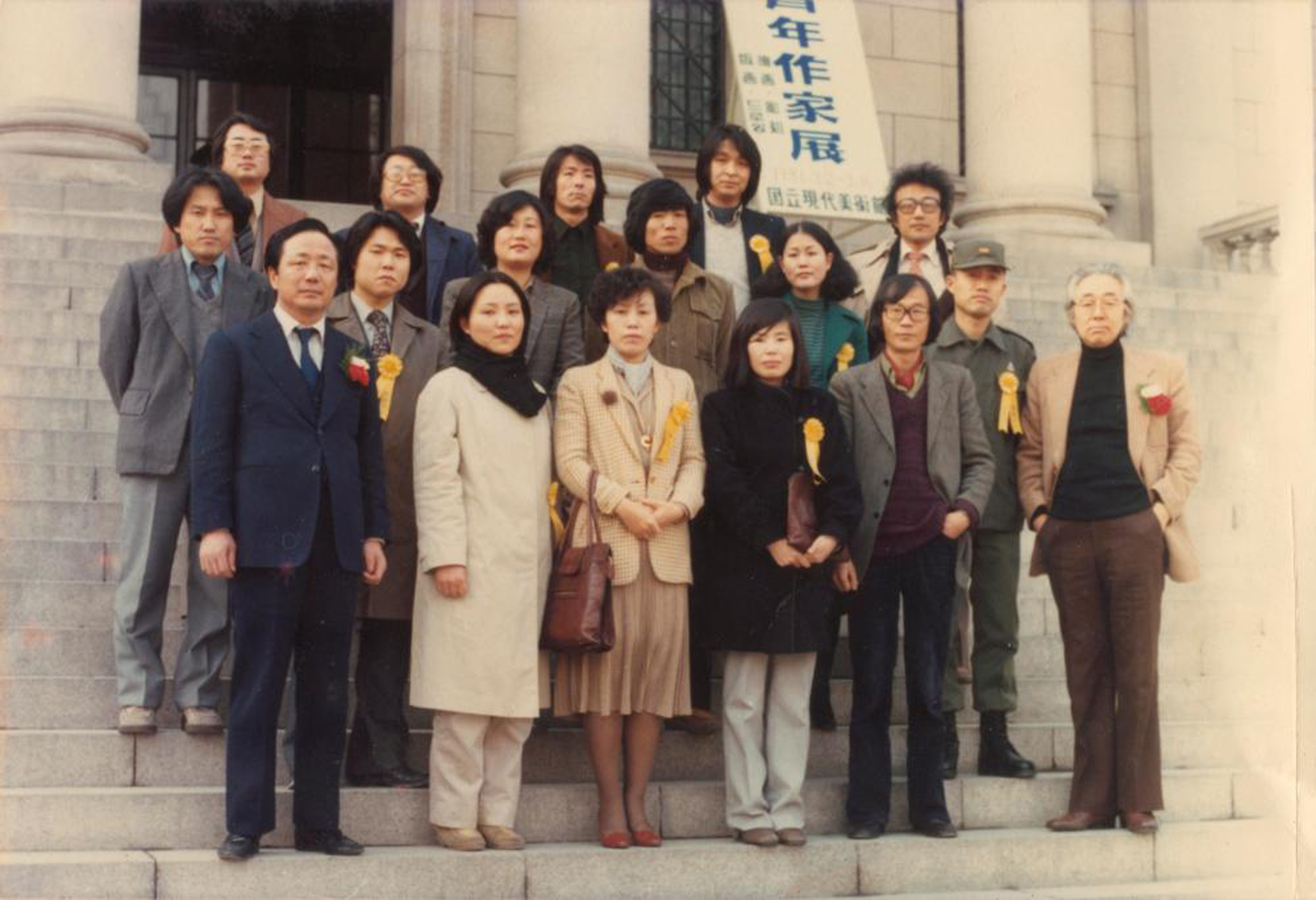 1981년 «제1회 청년작가전» 개막식 기념사진. 참여 작가와 전시 관계자는 전시를 개최한 국립현대미술관 본관(현 국립현대미술관 덕수궁) 앞에서 촬영에 임했다. (사진: 서울시립미술아카이브 CC BY-NC-ND)