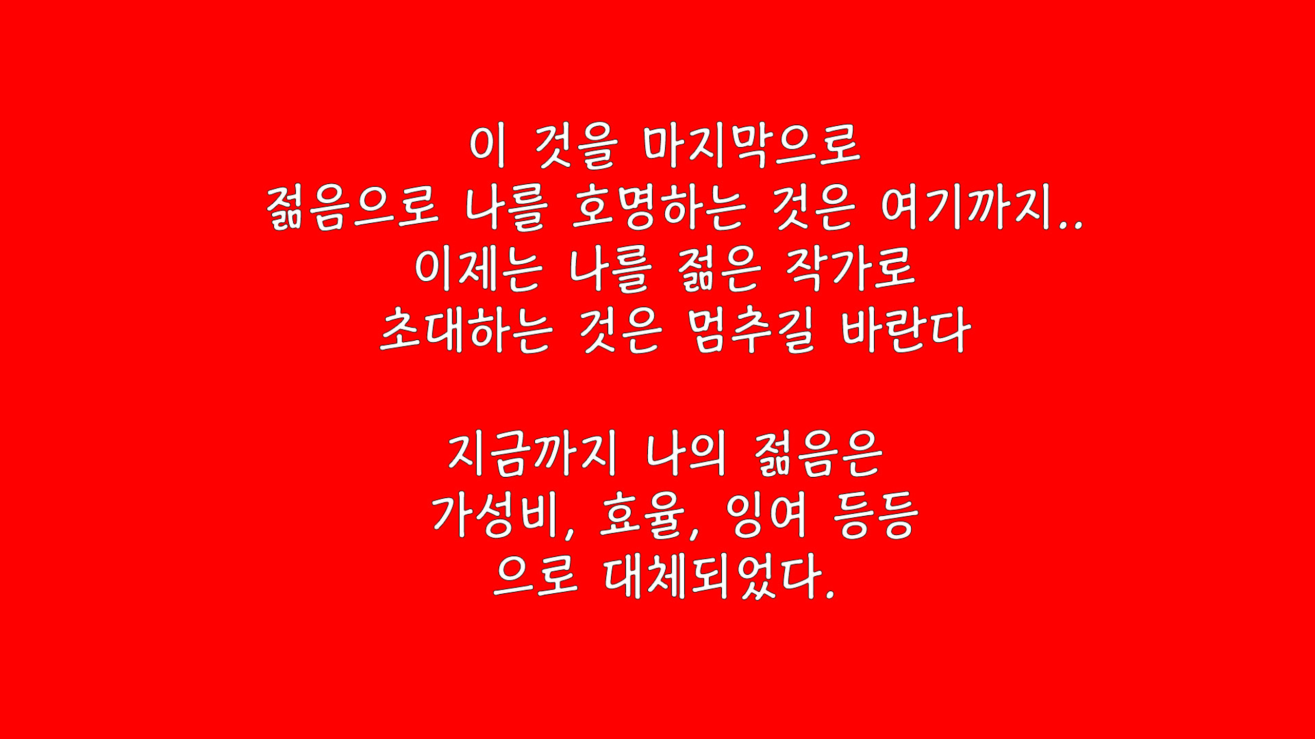 지방 소멸과 인구 고령화를 다룬 신문 기사에서 한 연구원은 이런 말을 한다. “40대는 지방 작은 마을에서 거의 막내 수준이라 보기 쉽지 않다… 아이가 없고 20~30대 젊은 층이 없는 지역은 40~50대가 청년 역할을 한다. 지역 이탈을 막기 위해선 청년으로 불리는 연령에 지원하는 것이 옳다.” 어쩌면 대한민국에서 ‘지방 작은 마을’ 정도에 해당할지도 모르는 (현대) 미술계의 미래와 겹쳐보면, 머지않아 30대는 ‘막내 작가’, 40~50대는 ‘청년 작가’로 활동하는 모습이 일상적인 상황이 올지도 모른다. 그러니 작가의 ‘젊음’이 만 45세 이하, 심지어 만 55세 이하를 기준으로 재편되는 건 예정된 수순일지도? 대체 언제까지 ‘젊은 작가’여야 하냐고 묻는다면, ‘한국의 중위 연령이 기적적으로 다시 35세 이하로 떨어지지 않는다면 영원히’라고 대답해야만 하는지도… 그런데 이게 꼭 미술계에 국한된 것일까? 결국 1980년대 이후에 태어난 대한민국 국민은 앞으로 인생의 절반 이상을 ‘젊은 OO’이라고 규정되는 상황을 공통적으로 맞이하는 운명 공동체 아닐는지.