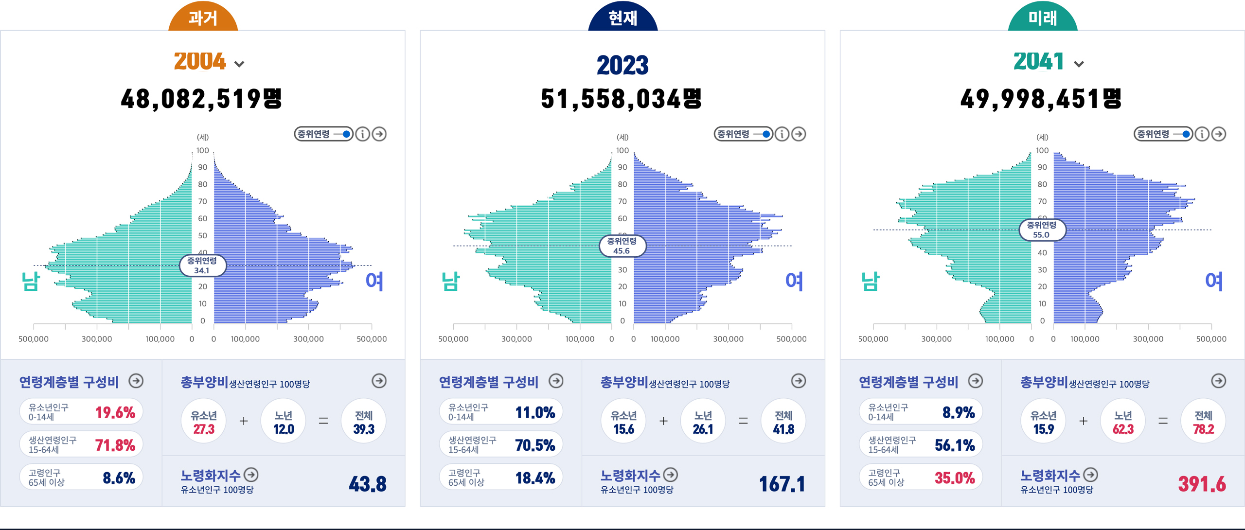 KOSIS 국가통계포털에서 열람할 수 있는 대한민국 인구상황판. 과거-현재-미래의 중위 연령을 비롯해 다양한 인구 통계를 확인할 수 있다. 다음 웹사이트를 확인하라. (KOSIS 인구로 보는 대한민국)