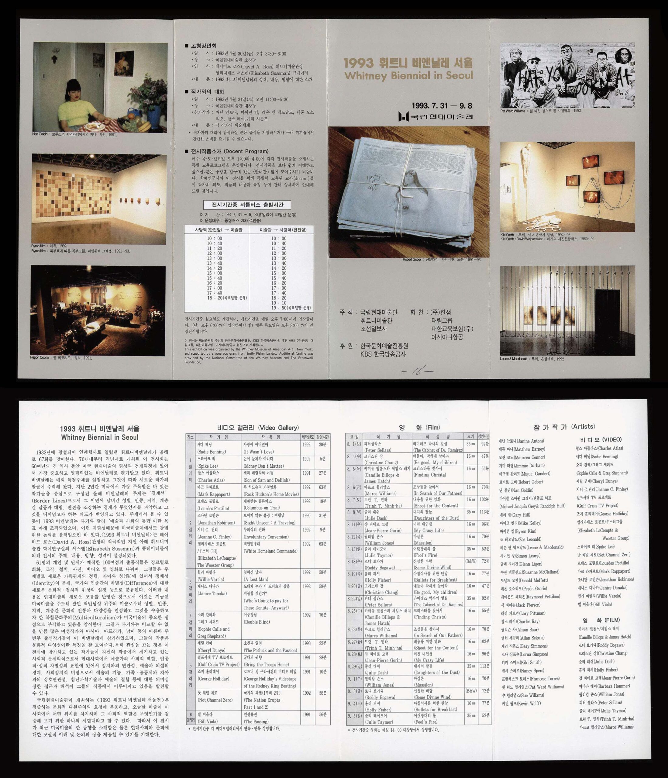 휘트니 비엔날레의 한국행은 백남준(1932-2006)의 주선으로 이뤄진 것으로 알려졌다. 언론 인터뷰에서 말한 대로 진짜 한국의 젊은 아티스트에게 “강한 이빨”을 주고 싶었던 것인지, 백남준은 총 전시 예산 65만 달러(지금 화폐 가치로 약 10억 원) 중 15만 달러를 자기가 직접 부담했다. 그럼에도 예산 확보는 쉽지 않았다. 국립현대미술관의 상위 기관인 당시 문화체육부에서 ‘전시 수입’에는 예산 지원을 할 수 없다고 선을 그었기에, 예산 대부분은 포스터에서 이름이 보이는 협찬사의 도움에 크게 기댔다. 이런 대규모 기업 후원은 1993년 당시 매우 드문 일이었다. (놀랍게도 수십 년이 지난 최근에서야 우리는 좀 더 전폭적인 기업의 미술관 전시 지원을 목격하는 중이다.) 한편, 65만 달러의 예산 중 전시를 한국으로 옮기는 데 쓰인 돈은 실제 30만 달러였다. 나머지 35만 달러는 휘트니 미술관에 지급하는 일종의 사례비로 쓰였다.
