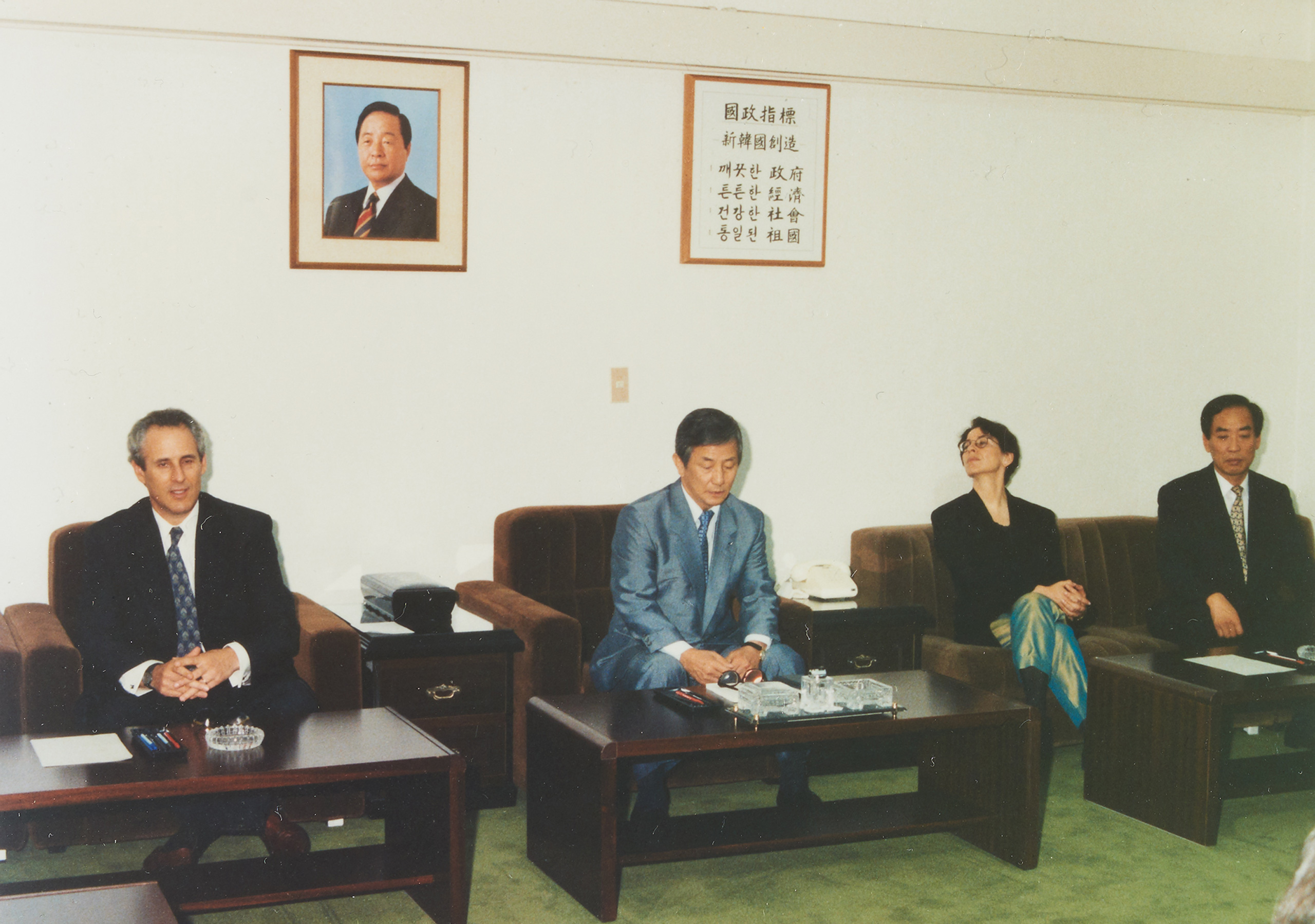 통역사로 보이는 직원과 데이비드 로스 휘트니 미술관장, 임영방 국립현대미술관장의 모습. 벽에는 김영삼 대통령 사진과 국정 과제를 액자로 만들어 걸어놓았다. 민주적인 선거로 선출한 민간인 출신 첫 번째 대통령 시대가 열렸지만, 아직 권위주의 시대의 문화가 남아있는 걸 엿볼 수 있다. © 국립현대미술관 예술연구센터
