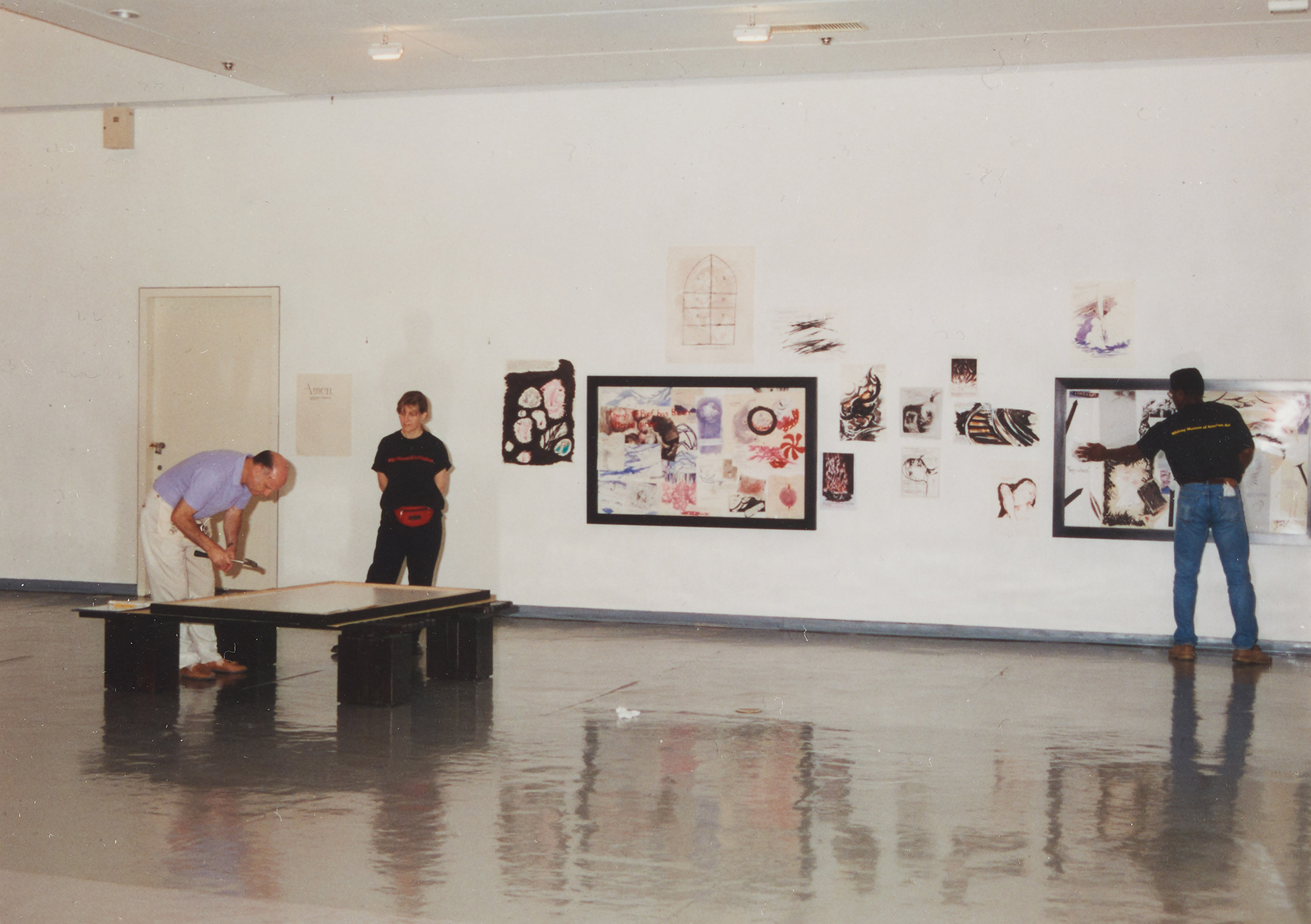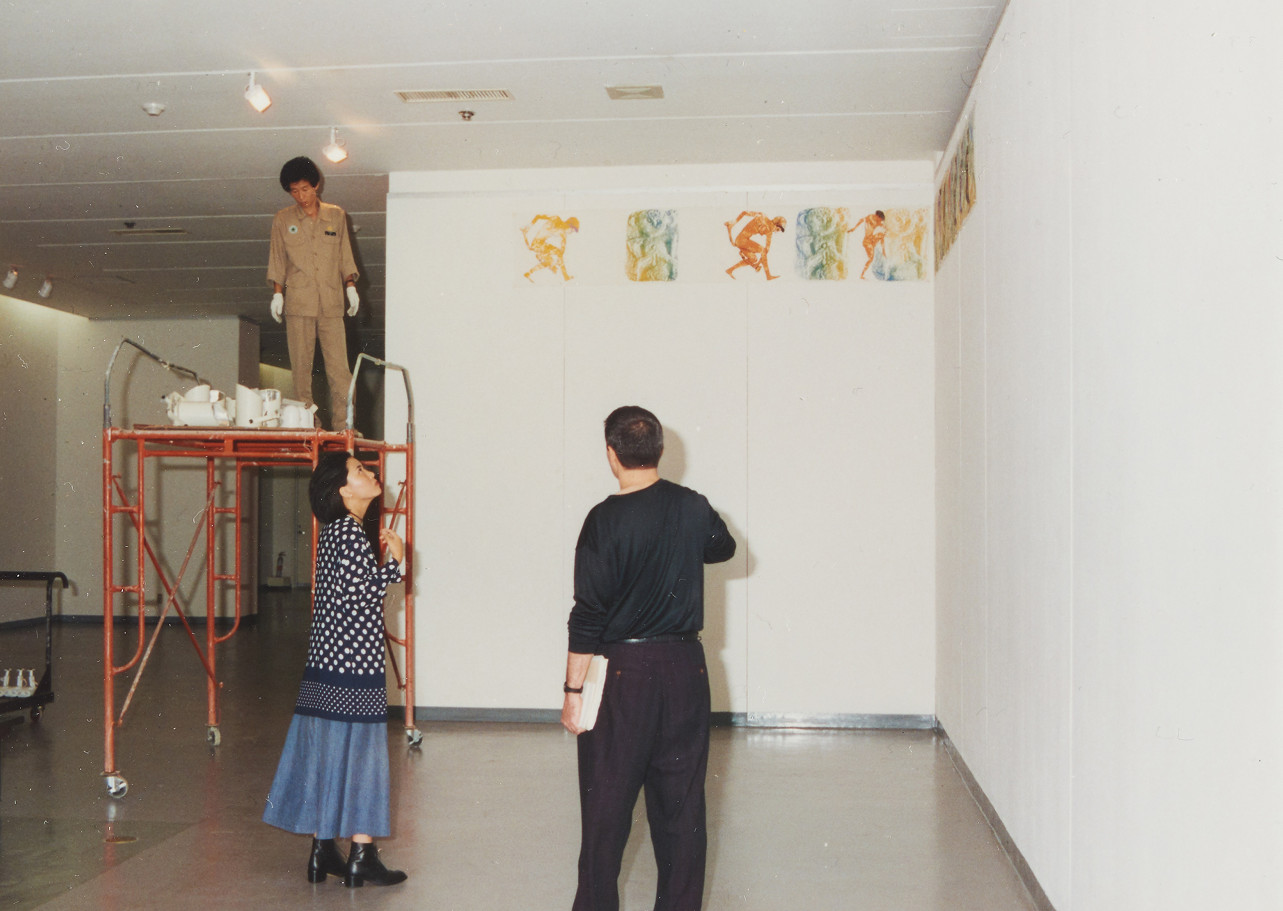 휘트니 미술관은 전시의 원본성을 유지하기 위해 한국으로 직원을 급파했다. 안전 장비 없이 비계 위에 서 있는 한국인 남성 노동자, 1990년대 옷차림의 여성 큐레이터, 휘트니 미술관 백인 남성 직원의 뒷모습이 만드는 앙상블이 절묘하다. © 국립현대미술관 예술연구센터