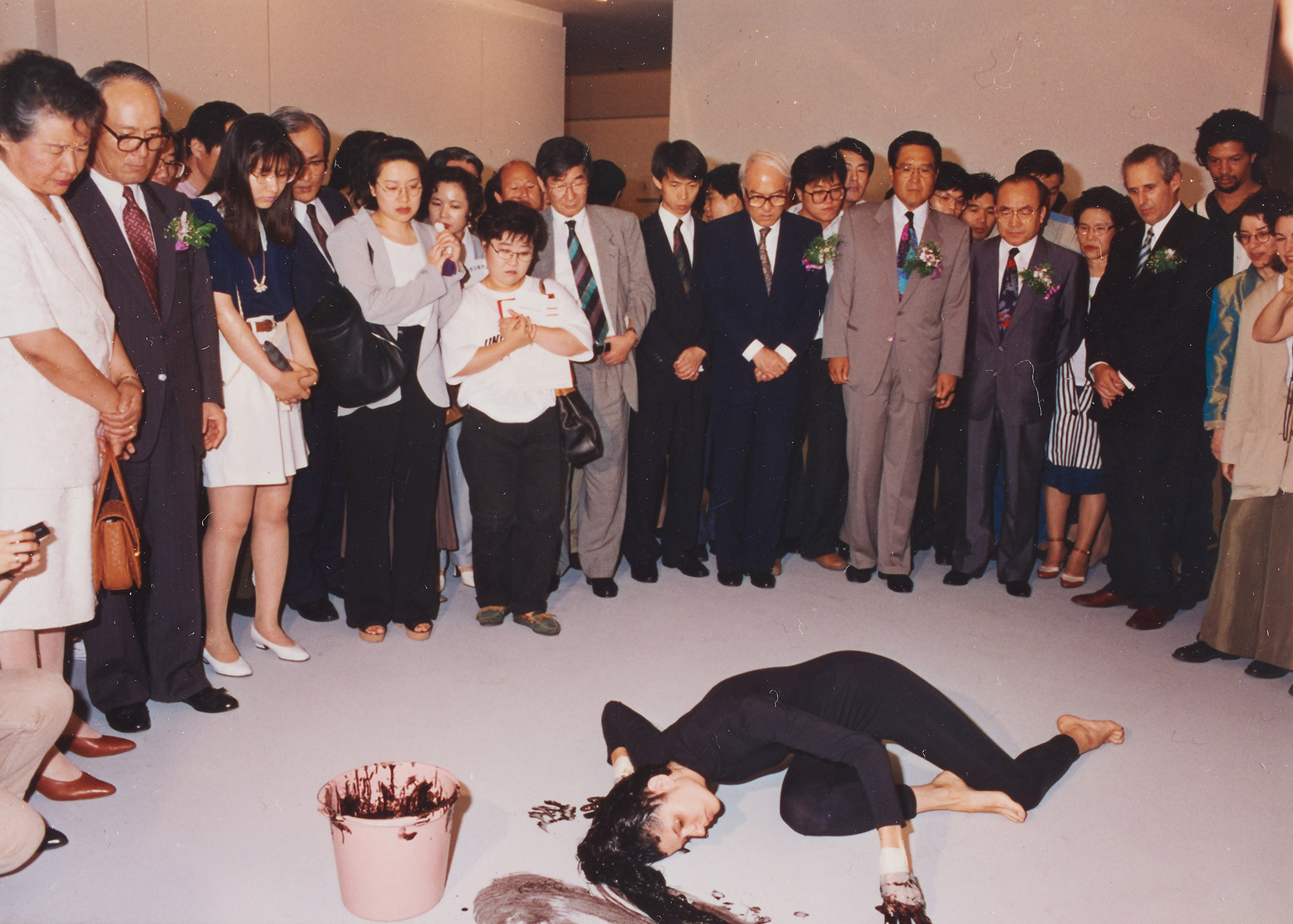 재닌 안토니Janine Antoni의 퍼포먼스 ‹사람의 보살핌(Loving Care)›(1992)를 관람하는 오프닝 방문객들. 30년이 지난 오늘날에도 퍼포먼스 관람객의 모습은 그리 다를 바 없는 것 같지만, 두 손을 모으고 관람할 정도로 다들 어떻게 반응해야 할지 모르는 듯 보인다. © 국립현대미술관 예술연구센터