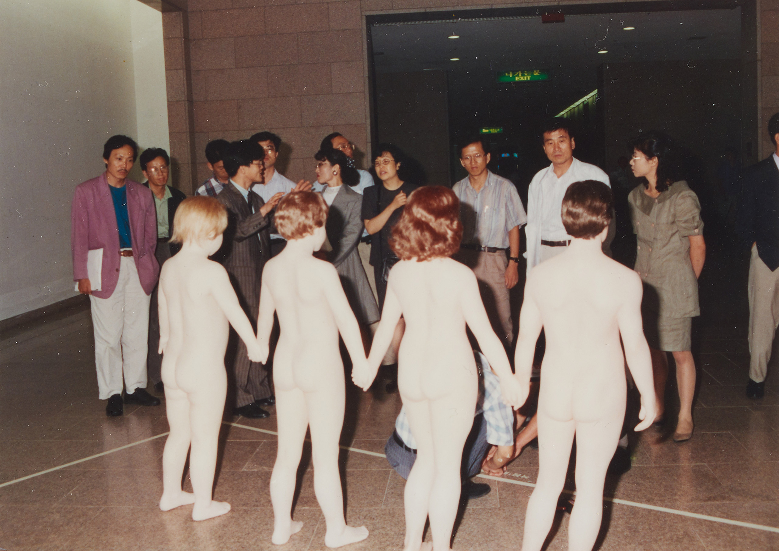 대중에 전시를 공개하기 바로 전날, 나체 상태로 성기를 노출한 마네킹 작업을 고개를 갸우뚱하게 기울인 채 바라보는 오프닝 참석자들의 모습. 특히 왼쪽과 오른쪽 끝에 선 남성 관객의 혼란스러운 표정에 주목해보자. © 국립현대미술관 예술연구센터