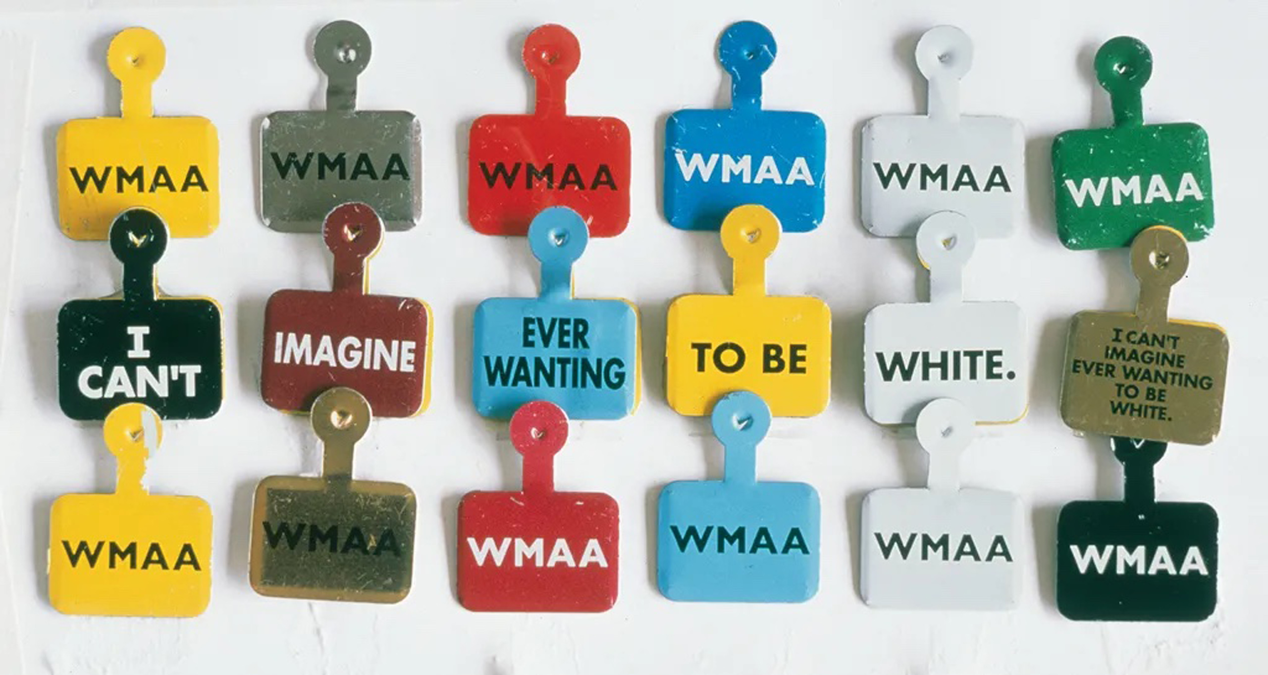 다니엘 마르티네즈Daniel J. Martinez는 ‹뮤지엄 태그Museum Tag›라는 제목으로 휘트니 미술관 입장 배지를 만들었다. 관람객은 백인이 되고 싶다고는 상상조차 할 수 없다(I CAN T IMAGINE EVER WANTING TO BE WHITE) 는 문장을 달고 미술관을 활보했다. 미술관을 찾는 관람객이 이런 작품을 봐야 할 만큼 아프리카계 미국인의 권리에 대해 무지하지는 않다며 불쾌함을 표하는 이들이 없지 않았다. Courtesy of the artist and Robert Projects, Los Angeles.