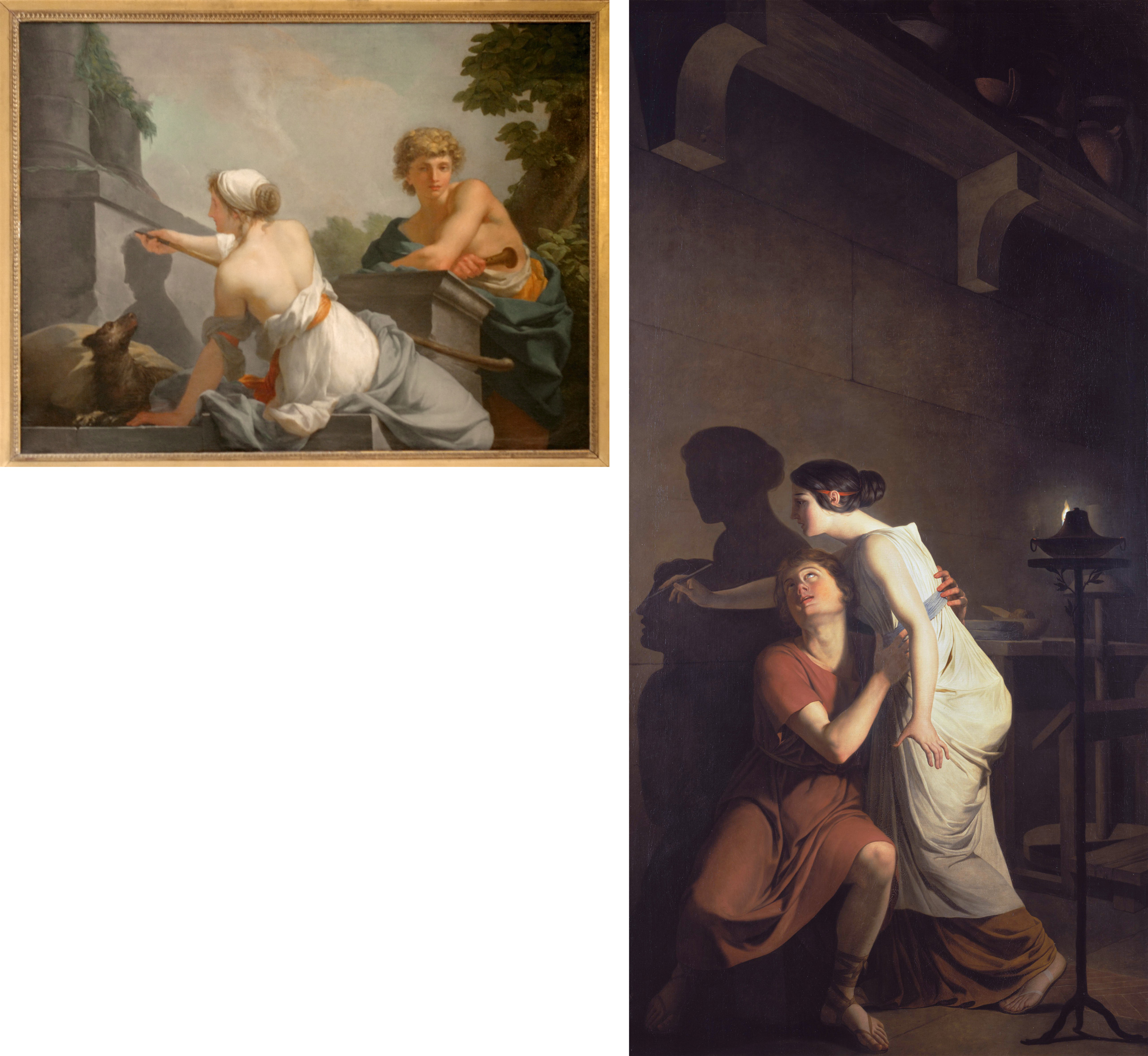 노순택 작가가 던진 질문에 답하는 그림이 있다면 아마 ‹회화의 기원The Origin of Painting› 같은 작품 류가 아닐까 싶다. 장 밥티스트 레뇨Jean-Baptiste Regnault, 조제프 브누아 쉬베Joseph-Benoît Suvée 같은 18~19세기 화가가 그리스 신화를 재해석한 산물이다.