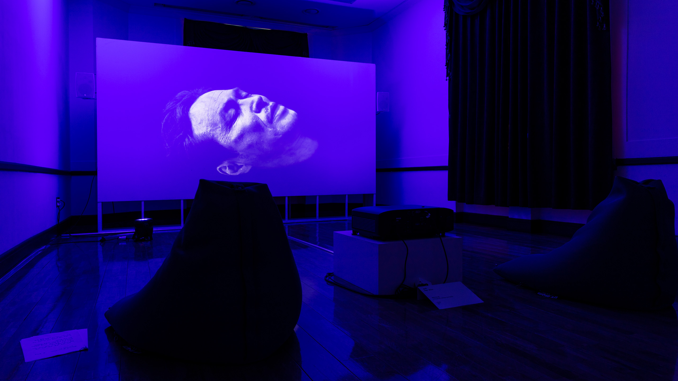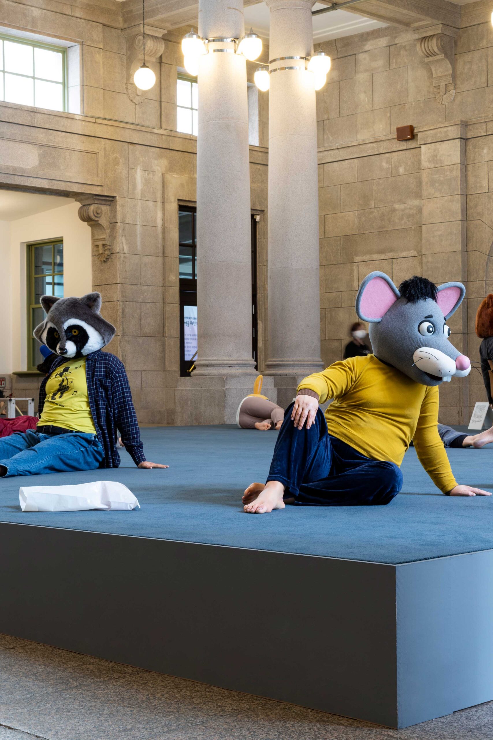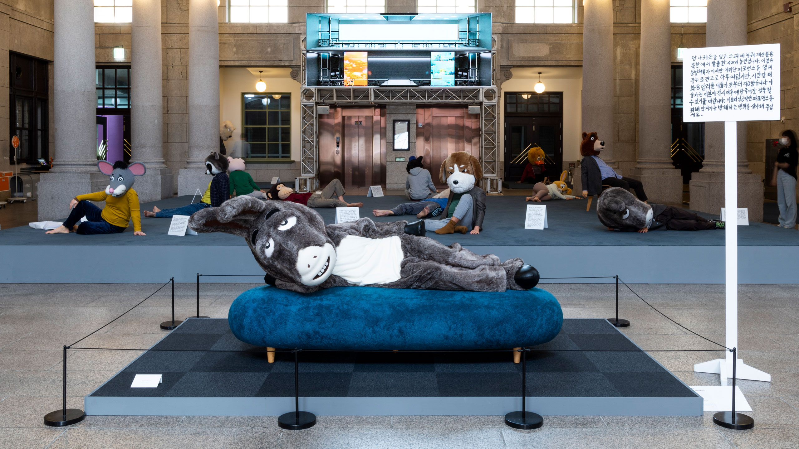 작품들은 하루 동안의 시간대를 기준 삼아 총 일곱 가지 흐름으로 나뉜다. 하지만 이는 전시 공간에서 차례대로 구현되지 않는다. 마치 규칙화하기 힘든 잠의 단계처럼 공간 곳곳에 무질서하게 흩어져 있다. 거대한 흐름과 작품의 상관관계는 오직 리플렛에 표시한 컬러 코드를 통해 구별할 뿐이다. 그만큼 작품을 바라보는 재미는 다양해진다. 1층 중앙홀에 들어서면 동물 탈을 쓰고 다채로운 포즈로 누운 군상이 보인다. 김홍석의 ‹침묵의 공동체›다. 다양한 직업군에 종사하는 등장인물은 자신만의 잠을 준비하는 듯하다. 잠드는 것인지, 쉬는 것인지, 깨어있는 것인지 알 수 없는 모습은 거대한 중앙홀을 지배하며 잠을 대하는 우리의 모호한 태도를 부각한다. 2층 귀빈실에 자리 잡은 우정수의 ‹미래는 당신을 기다려주지 않는다›도 흥미롭다. 서양 고전 신화와 다양한 문학 원전을 기반으로 상징과 기호를 사용해 고전적인 회화 작법을 다루는 작가는 이번에 19세기 판화를 인용해 페인팅과 벽지로 공간을 가득 채웠다. 과거 귀빈실로 사용하던 화려한 공간은 과거, 현재, 미래를 넘나드는 꿈처럼 시공간을 넘어 시간이 멈춘 듯하다.