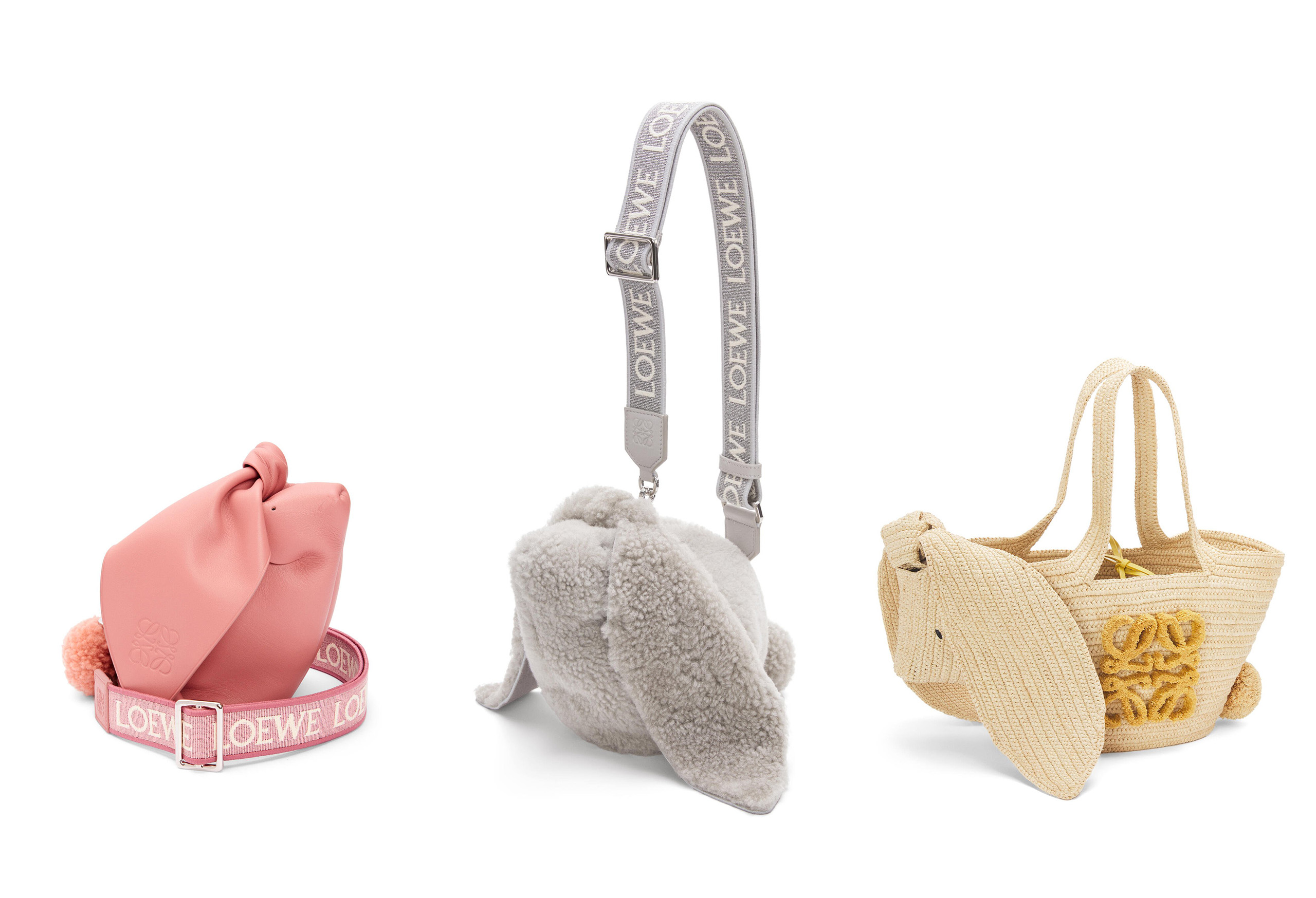 로에베는 토끼해를 맞이해 토끼의 커다란 두 귀를 매듭 모양으로 묶은 귀여운 가방을 만들었어요. 얼굴과 앙증맞은 꼬리까지 달아놓으니 깜찍한 토끼 그 자체입니다. 평범한 룩에 귀여움을 더하는 필살기가 필요할 때 버니백을 강력 추천해요. 각기 다른 세 가지 소재 중 취향에 맞는 아이로 골라보아요.