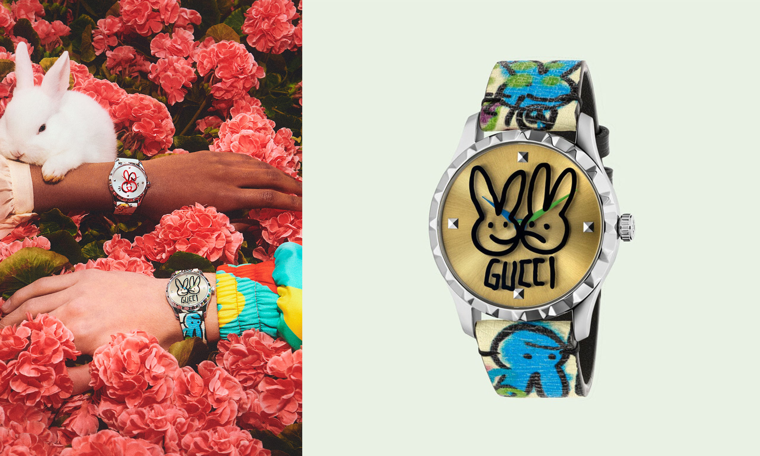 ‘구찌 래빗’ 컬렉션의 캠페인에서는 토끼와 사람이 꽃밭에서 뛰놀고 있어요. 마치 동물과 인간이 옹기종기 모여 사는 어느 동화 속 한 장면 같습니다. 특히 자유분방한 그라피티 디자인의 시계가 눈에 띄어요. 토끼 한 마리와 두 마리 중 다이얼을 고를 수 있답니다. 그나저나 캠페인에 출연한 흰색 토끼가 정말 신스틸러네요. 어질어질할 정도로 귀여워요.