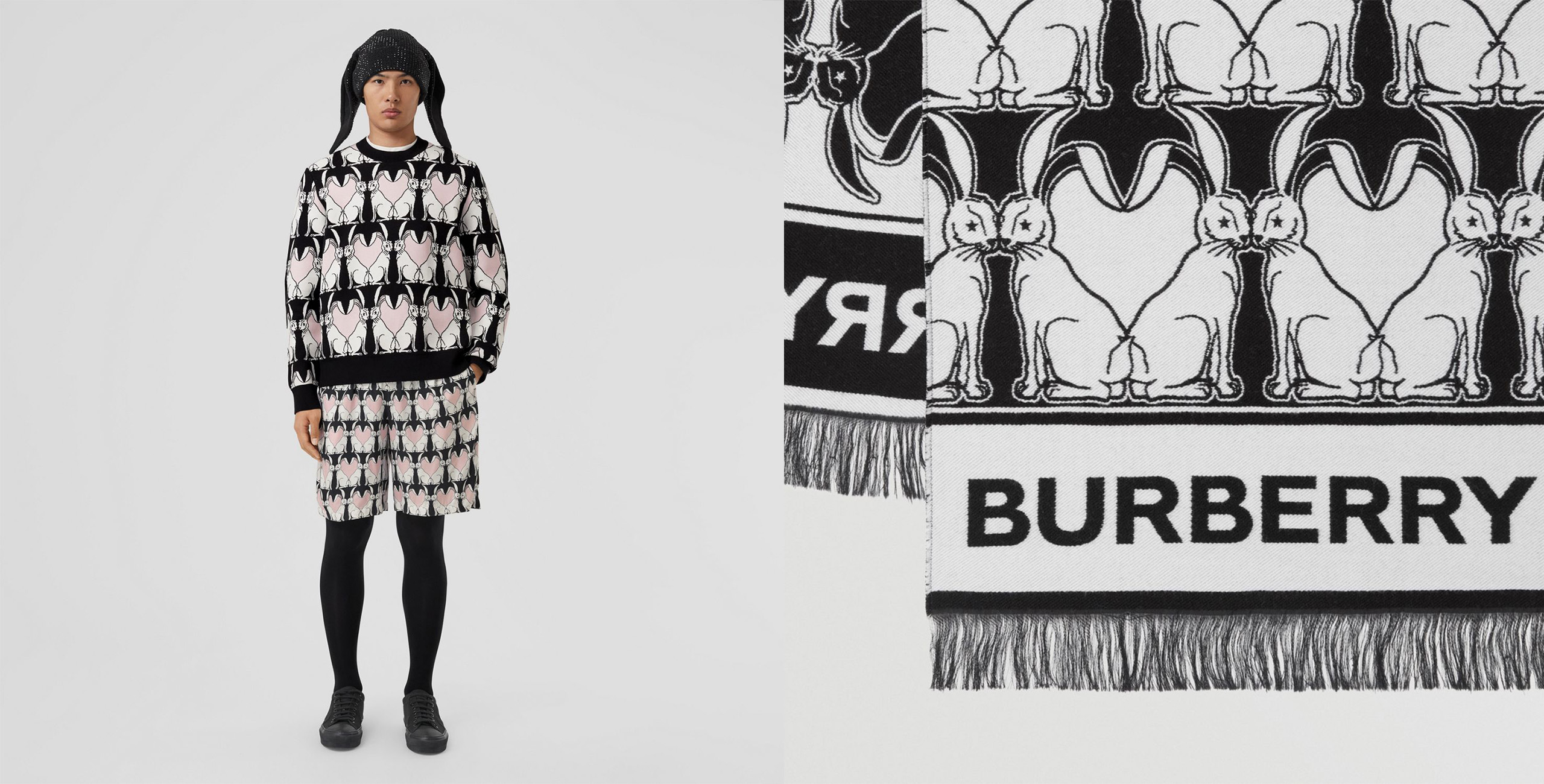 버버리는 올해 토끼에 진심인 듯해요. 유명 토끼가 아니라 자기만의 토끼를 떼로 소환했네요. 스웨트 셔츠부터 쇼츠, 스카프 등 온갖 아이템을 토끼 두 마리가 만드는 하트 패턴으로 도배한 덕분에 어디를 봐도 토끼토끼토끼입니다. 눈은 좀 아프지만, 12년마다 돌아오는 토끼의 해니까 과해도 괜찮을지도?