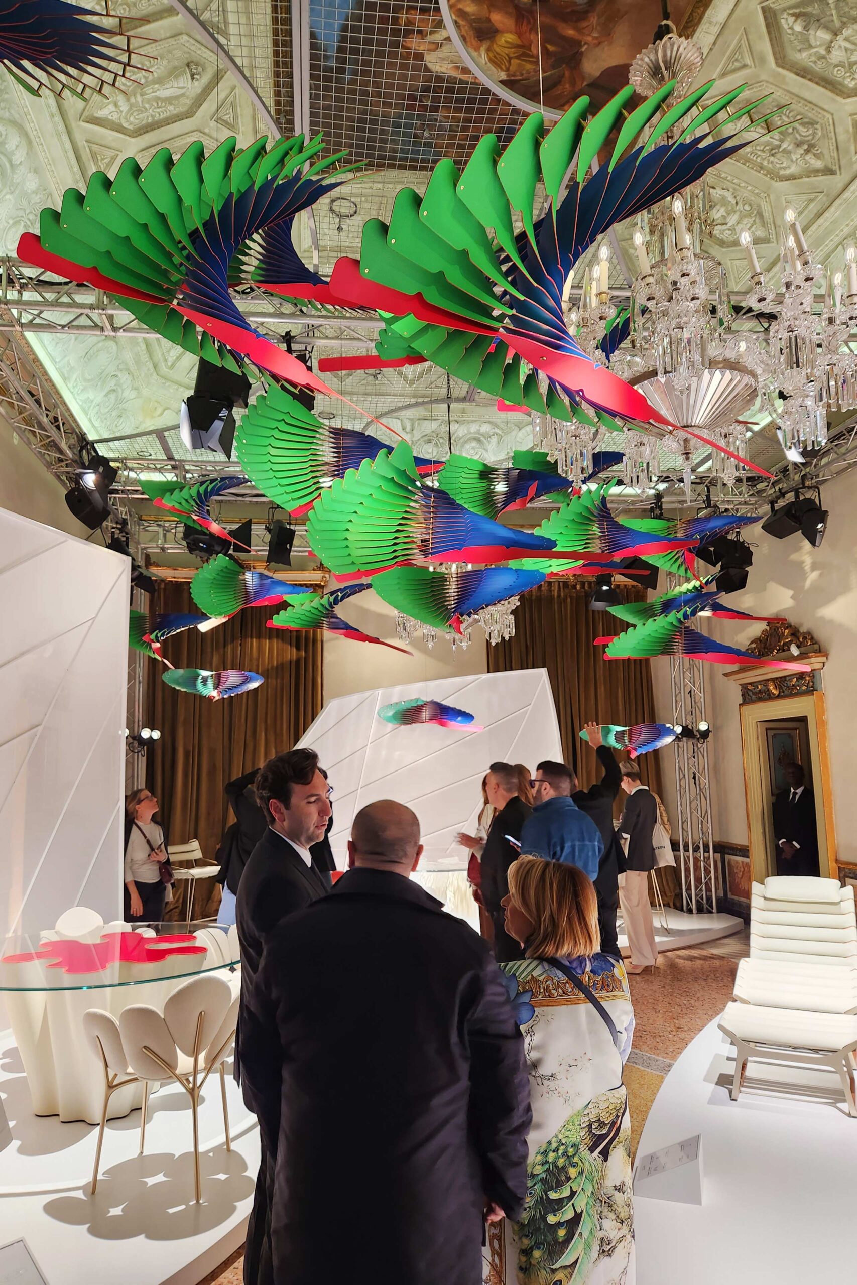 순간 말문이 막혔다. 그래, 그는 사람들이 작업을 건드리지 않는지 확인하는 ‘경비원 2’일 거야. 그런데 이게 캄파냐 형제의 특별판이라는 사실은 도대체 어떻게 알 수 있는 거지? 패널에는 디자이너 이름과 작업 명뿐이고, 주변에 이 사람 말고 다른 스태프도 없잖아. 설마 루이 비통 가구 전시를 찾는 사람에게 예습을 기대하는 건 아닐 테니, 그냥 눈 호강만 하고 가라는 깊은 뜻인가? 머리가 갑자기 복잡해졌다. 눈앞에 있는 전시에 집중하자고 구호를 외치며 내부로 들어가니 화려한 인테리어를 배경으로 오브제 노마드 컬렉션이 구석구석 자리를 차지하며 동선을 계속 이어 나갔다. 참으로 환상적으로 보기 좋은 풍경이었다. 스마트폰으로 마구 사진을 찍다가 그중 천장에 걸린 작업을 보고 깜짝 놀랐다. 빨간색, 녹색, 파란색의 조화가 강렬하면서도 마치 날아갈 것만 같은 우아한 형태로 깃털이 반복되는 모습이 분명 아틀리에 오이Atelier Oï의 작업이었다. 어떻게 확신하냐고? 지난 16일 로사나 올란디 갤러리에서 비슷한 작업을 봤기 때문이다. 갤러리 버전은 색을 칠하지 않은 내추럴한 모습이었지만 디자인 어휘가 워낙 일치했다. 기억하지 못하면 건강에 큰 문제가 없는지 확인이 필요할 정도였다.