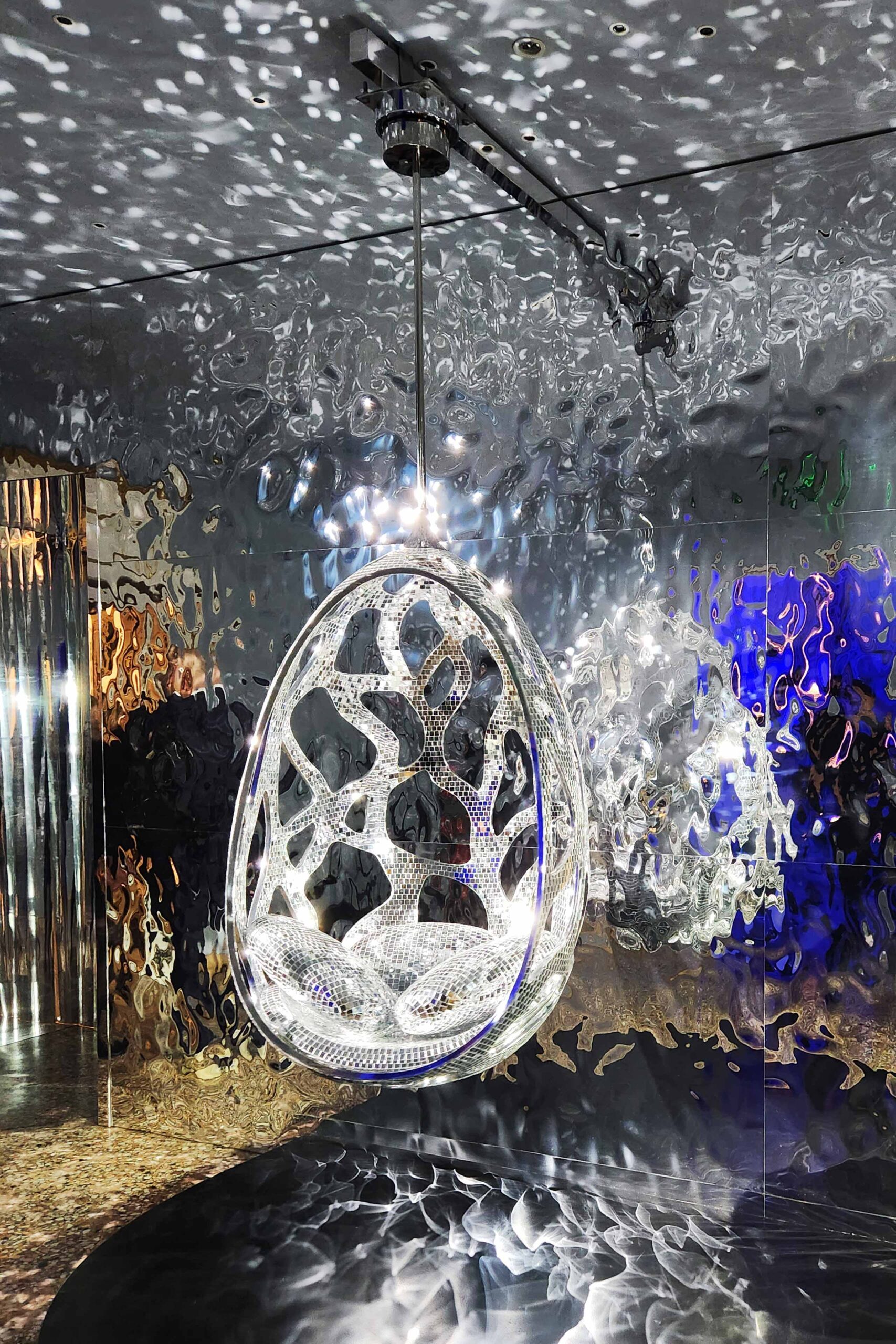 미러볼처럼 화려하게 겉면을 처리한 후 계속 제자리에서 돌며 반짝이던 코쿤 체어 특별판. (하)