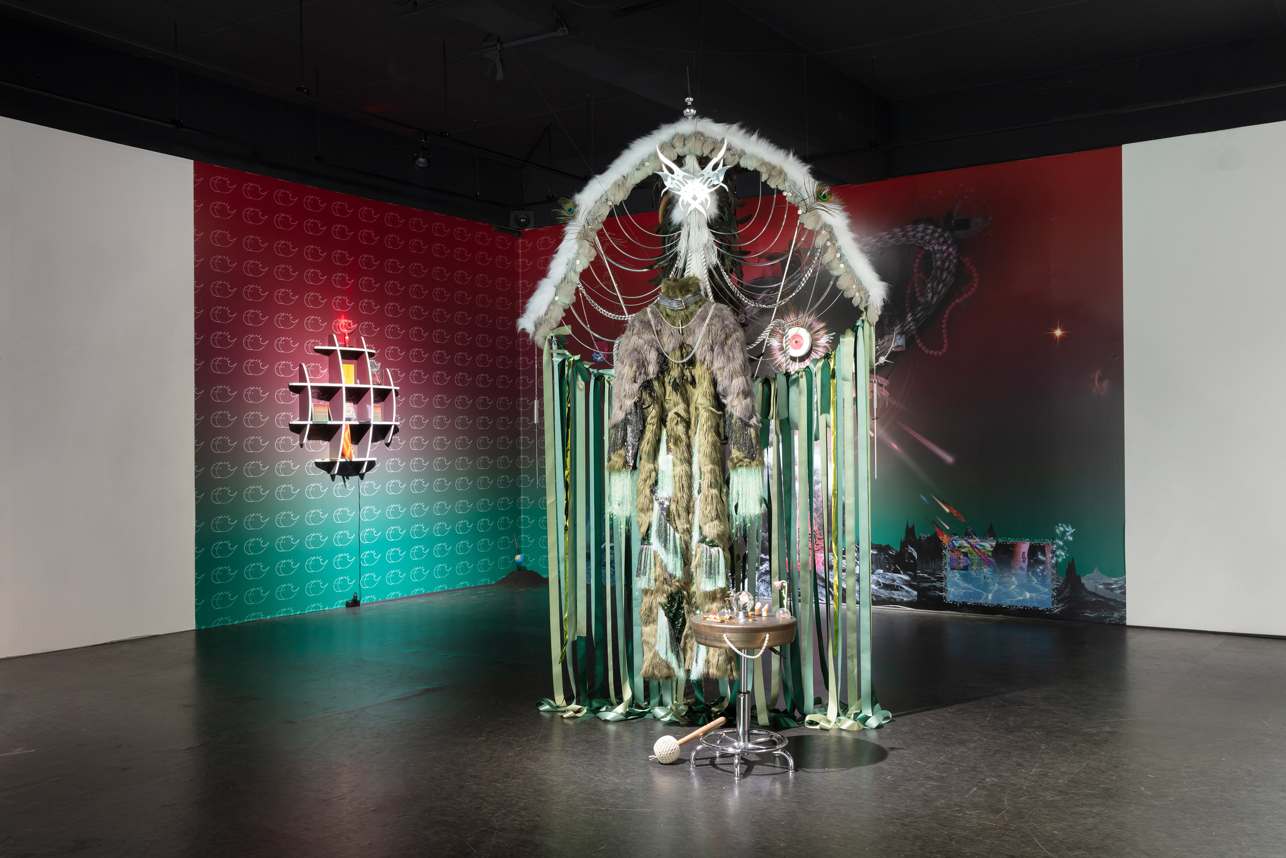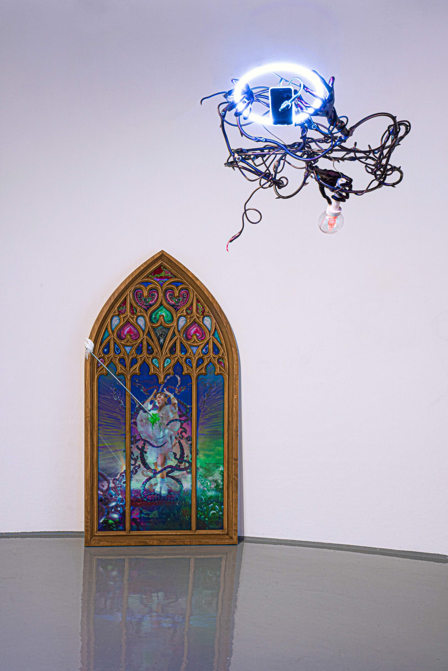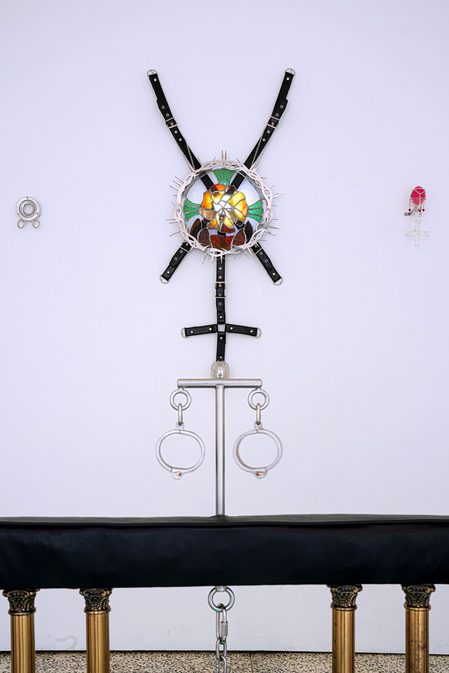 ‹When the Water Blushed›, 2020, a prayer chair, imitation leather, handcuffs, ankle cuffs, egg topper, stained glass, mixed media, dimensions variable