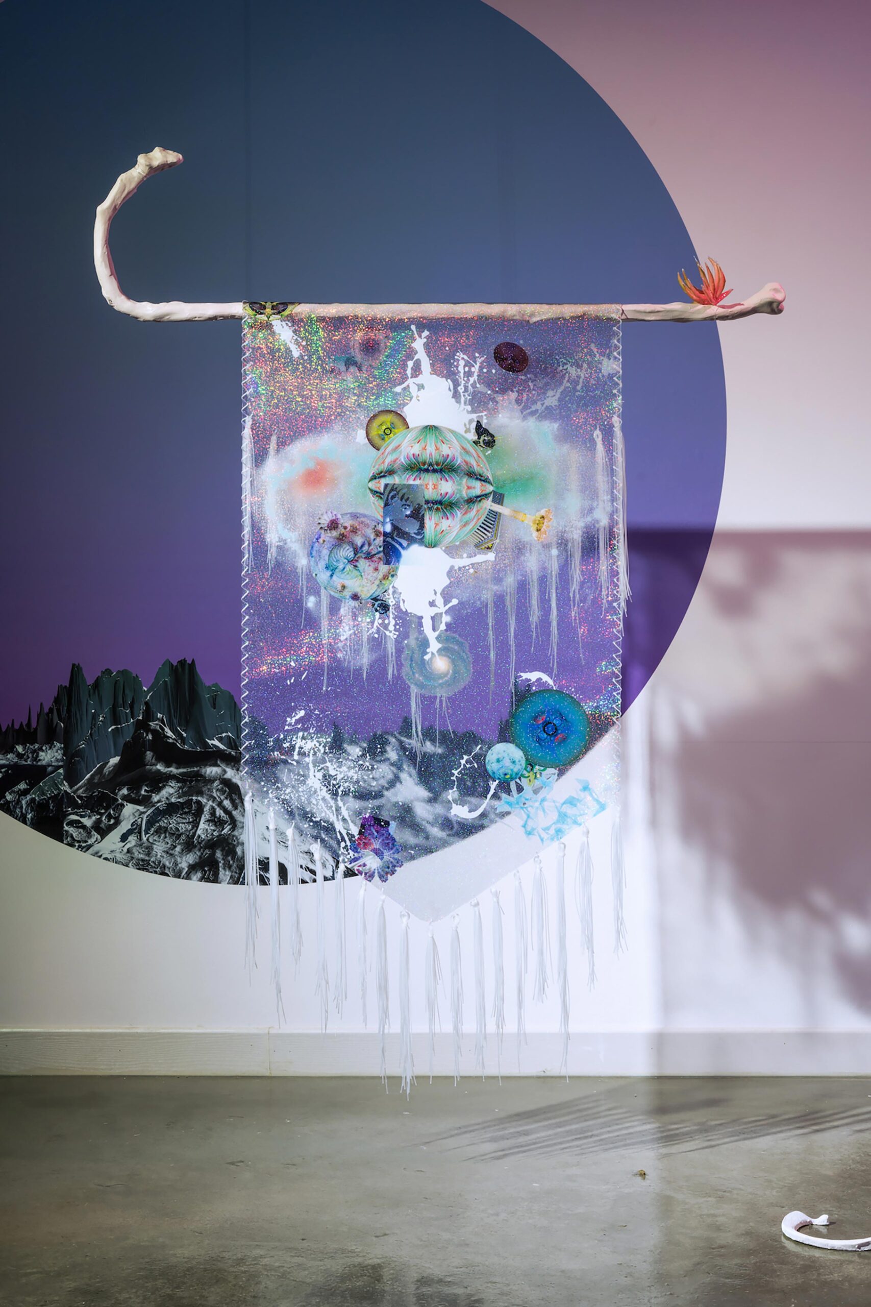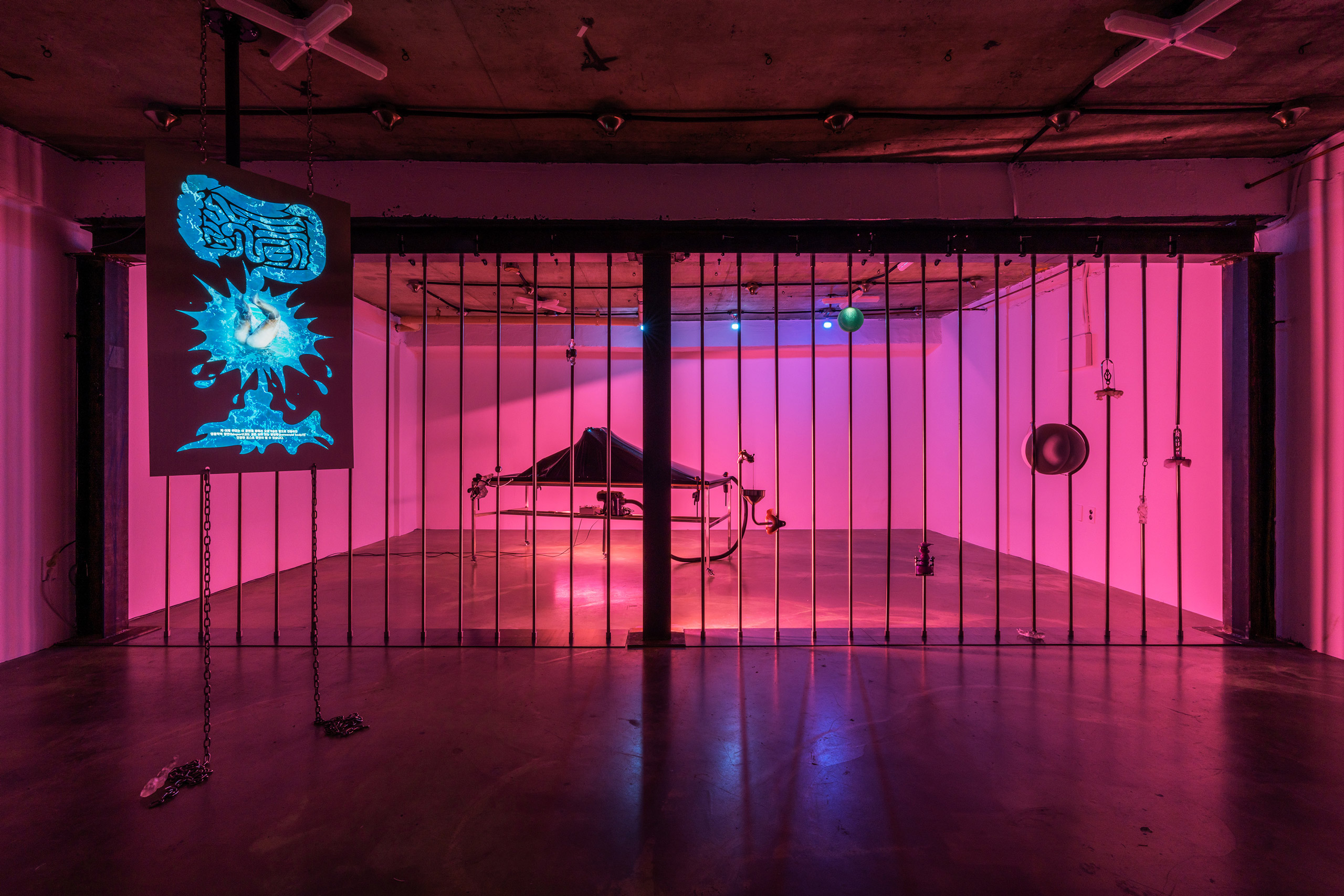 ‹Faster than a Kiss›, 2018, digital printing on polyvinyl chloride, silicone tubes, mixed media_dimensions variable