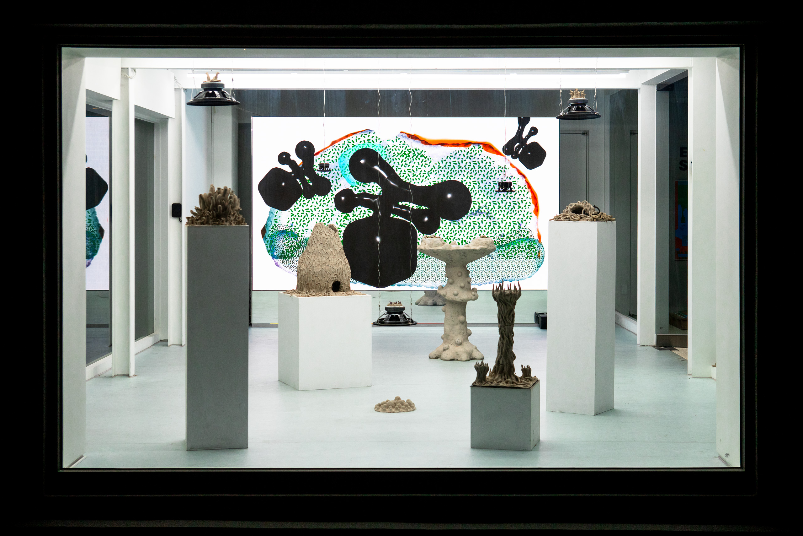 사운드 아티스트 김익명 씨와 함께 ‘코-테크닠Qootechniq’이라는 이름으로 활동하면서 작년 하반기에 전시를 진행했습니다. PCS를 운영하는 유승한 작가와 협업해 «나의 이웃집 K씨 – 기묘한 그 정원»이라는 전시를 서울 엘리펀트 스페이스에서 열었죠  2021년 쯤에 NFT, 메타버스 등 테크놀로지와 연계된 개념 및 콘셉트에 대한 담론으로 세상이 시끌벅적했는데요. 이때 사람들 반응이 참 재밌었어요. 시대에 발맞춰 새로운 시장에 빠르게 접근하는 사람도 있고, 그저 흐름에 질질 끌려가는 사람도 있고, 새로 듣는 콘셉트라며 질겁하는 사람도 있고… 기술의 발전은 늘 우리 곁에 있는데 생각보다 여전히 어렵고 불편하고 두려운 형태를 띠는 점이 흥미로웠죠. 그래서 ‘기술’이라는 개념 자체를 몬스터화했어요. 그리고 이 몬스터를 마주쳤을 때의 군상을 픽션으로 풀어보자고 마음먹은 게 전시를 기획하게 된 이유였죠. 전시 기획부터 제작, 참여 및 진행 모두 저와 익명 씨 두 사람이 맡았어요. 그래서 굉장히 (힘들고) 흥미로웠답니다. 공간 선택부터 심혈을 기울였어요. 창작한 픽션에 어울릴 법한 이질적인 분위기를 뽐내는 장소를 찾으려고 노력했죠. 그래서 연남동 가정집과 아기자기한 카페가 있는 골목에 덩그러니 존재하는, 삼면이 통유리인 전시 공간 엘리펀트 스페이스를 선택했어요.