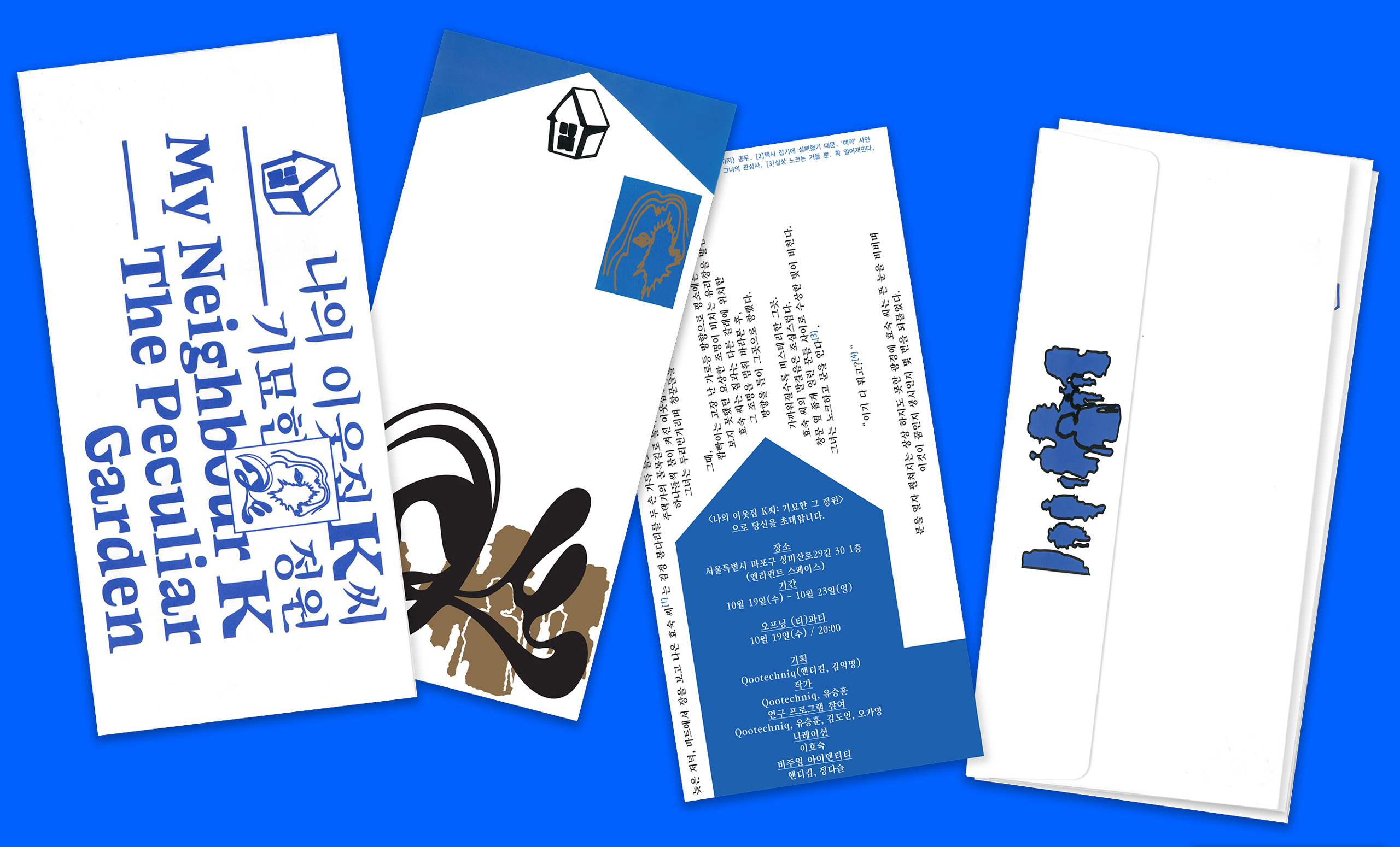 전시는 갑작스럽게 신기술을 맞닥뜨리게 된 사람, 즉 K씨가 주인공인데요. 이 공간을 경험하는 사람들을 모두 각기 다른 K씨라 가정하고, 그가 경험하는 기술들의 군집 ‘기묘한 정원’이 가진 내러티브에 집중했어요. 전시를 경험하는 모두가 기묘한 정원을 체험하기를 바라며 초대장을 제작해 주변 사람에게 전했어요. 이름은 알고 있지만, 뚜렷한 친분은 없는 분에게도 보냈답니다. 카드를 받는 행위 역시 알쏭달쏭하게 느꼈으면 좋겠다고 생각했죠. 그런 알쏭달쏭함을 담기 위해 초청장에는 저의 아이덴티티가 많이 드러내지 않으려고 노력했어요. 그래서 평소에 선망하던 정다슬 디자이너와 협업했습니다. 다슬 씨 목소리와 제 목소리를 한 데 섞어 더욱 희한한 예쁨을 가진 결과물을 도출할 수 있었어요. 전시 포스터는 “사람들이 경험했으면 하는 것이 무엇인가요?”라는 물음에 대한 답을 담아냈어요. 포스터 실물은 한국 주택 옥상의 초록 페인트 색을 활용했는데요. 디지털상에서 포스터의 매력 포인트가 잘 드러나지 않아 아쉬울 따름입니다. 포스터 색의 합과 이미지의 찌글찌글한 아웃라인이 디지털 공간에서는 엄청난 픽셀화를 일으키는 게 큰 골칫거리이자 동시에 작업의 매력 포인트라고 느껴요.