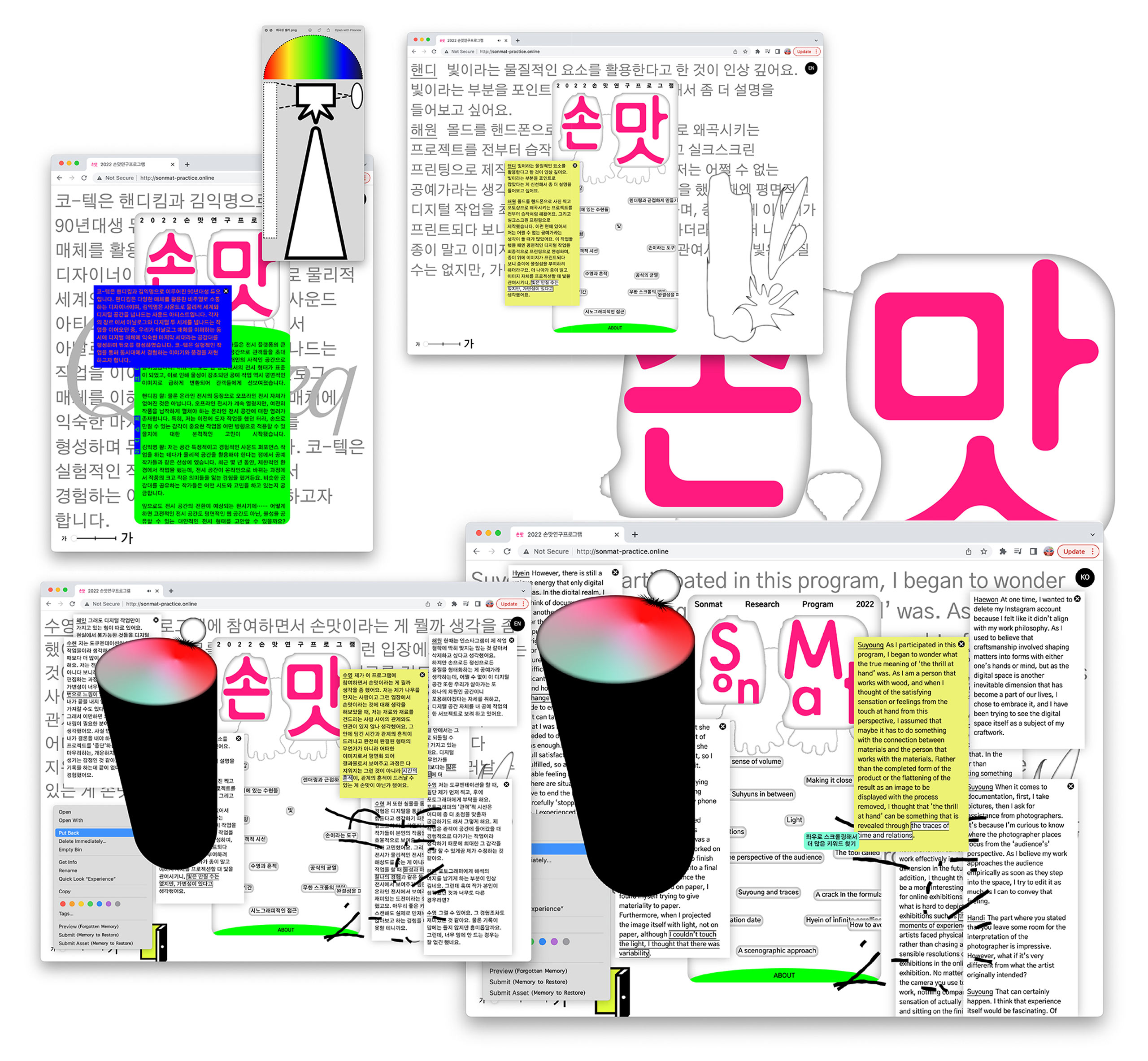 웹진 «손맛연구프로젝트»의 전반적인 디자인에서는 색을 최대한 빼려고 했던 것 같아요. 포스트잇이 덕지덕지 붙어서 ‘공부한 것만 같은’ 스크랩북처럼 만들고 싶었거든요. 대신 대화를 하며 짜릿하게 느껴지던 단어와 문장에는 사운드 이펙트와 비주얼 조각을 삽입했어요. 아주 하얗다 못해 못생긴 흰색 A4 용지가 못생겨 보이지 않도록, 형광펜으로 군데군데 마킹을 한 듯한 비주얼을 연출했어요. 올 상반기에는 ‘손맛연구프로그램 워크샵’에서 나온 내용을 다시 정리해 두 번째 프로토타입 전시를 제시했어요. 첫 번째 전시는 텍스트 기반의 웹진이었다면, 두 번째 전시는 아날로그 아이템을 활용해 공간을 구성했습니다. 전시를 한 번으로 끝내지 않고, 꼬리에 꼬리를 물듯 발전하고 있어서 마치 해당 전시가 스스로 진화하는 기분이 들어요.