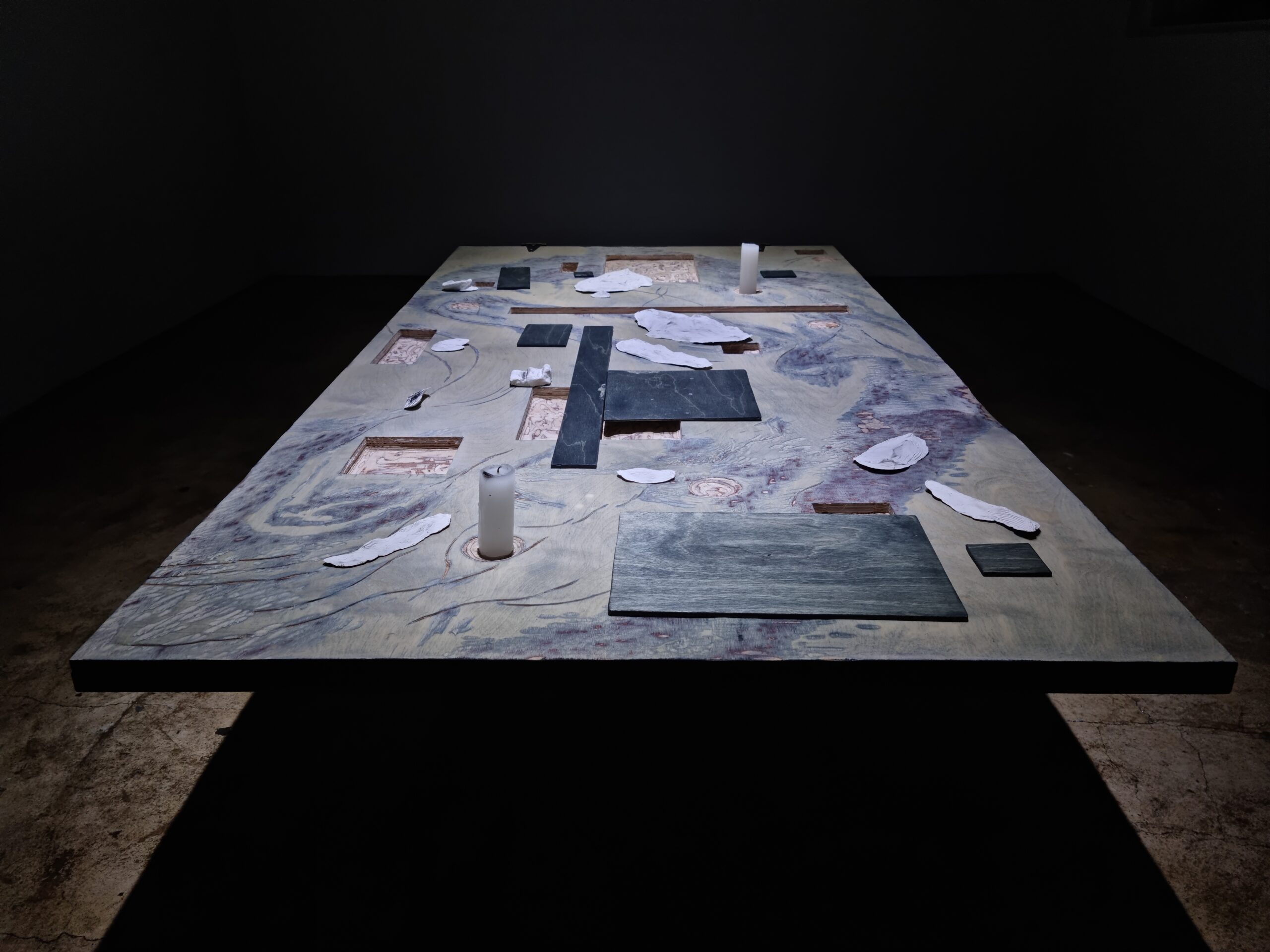 작업 과정에서 저는 작업이 놓일 공간을 미리 상정합니다. 여기서 말하는 공간은 전시장이 아니라 무언의 영역을 의미합니다. 그 안에서 작업이 작업자, 타인들과 어떻게 관계를 맺을 수 있을지 상상합니다. 제가 상정한 곳을 ‘무대’라고 칭하며 진행하는데, 이는 재현을 위한 공간이라기보다 대상과 나 사이에 관통되는 경유지로 생각합니다. 붙잡힌 시간과 흐르는 시간이 충돌하며 생기는 틈이 일어나는 지점이기도 합니다.