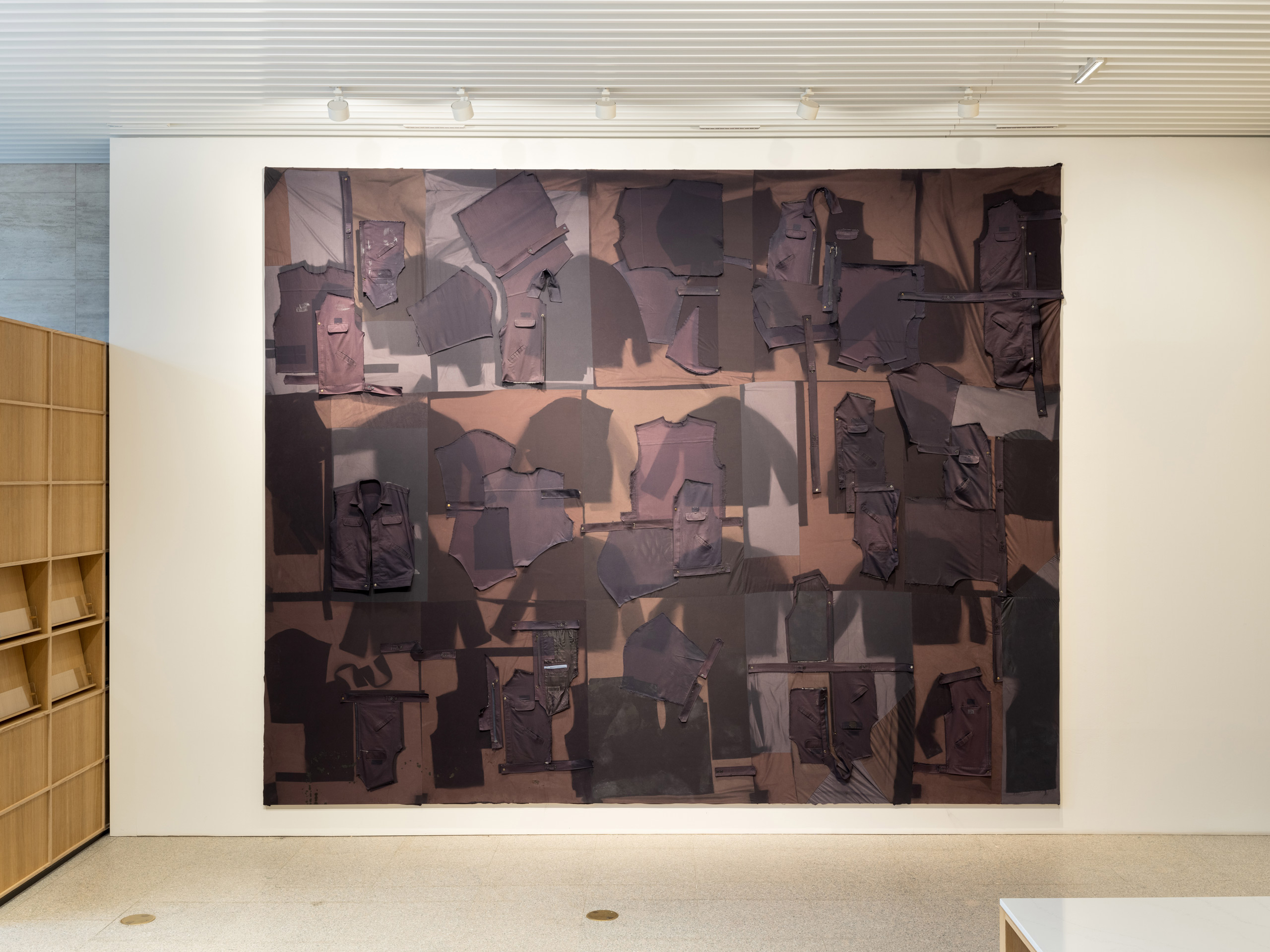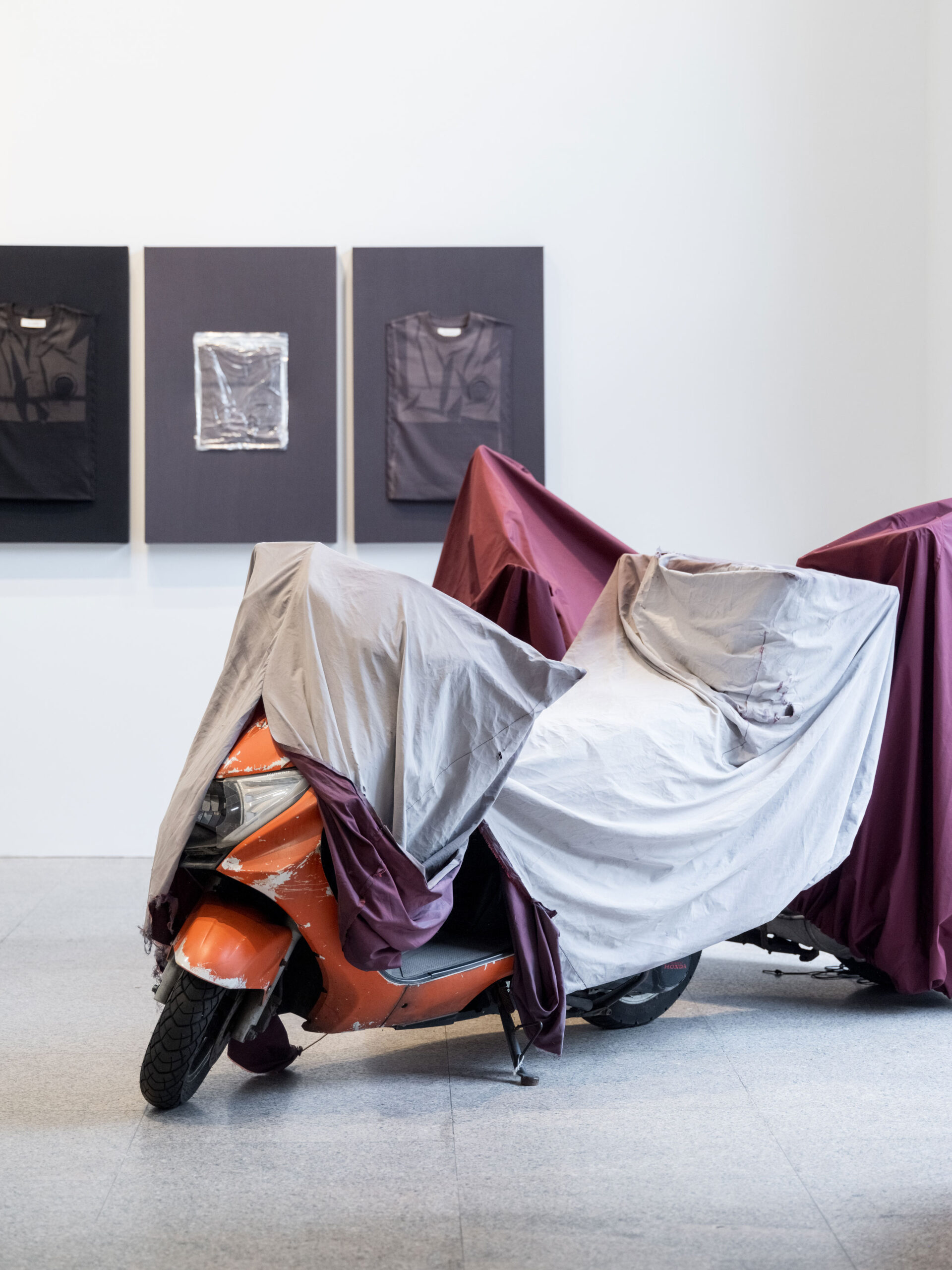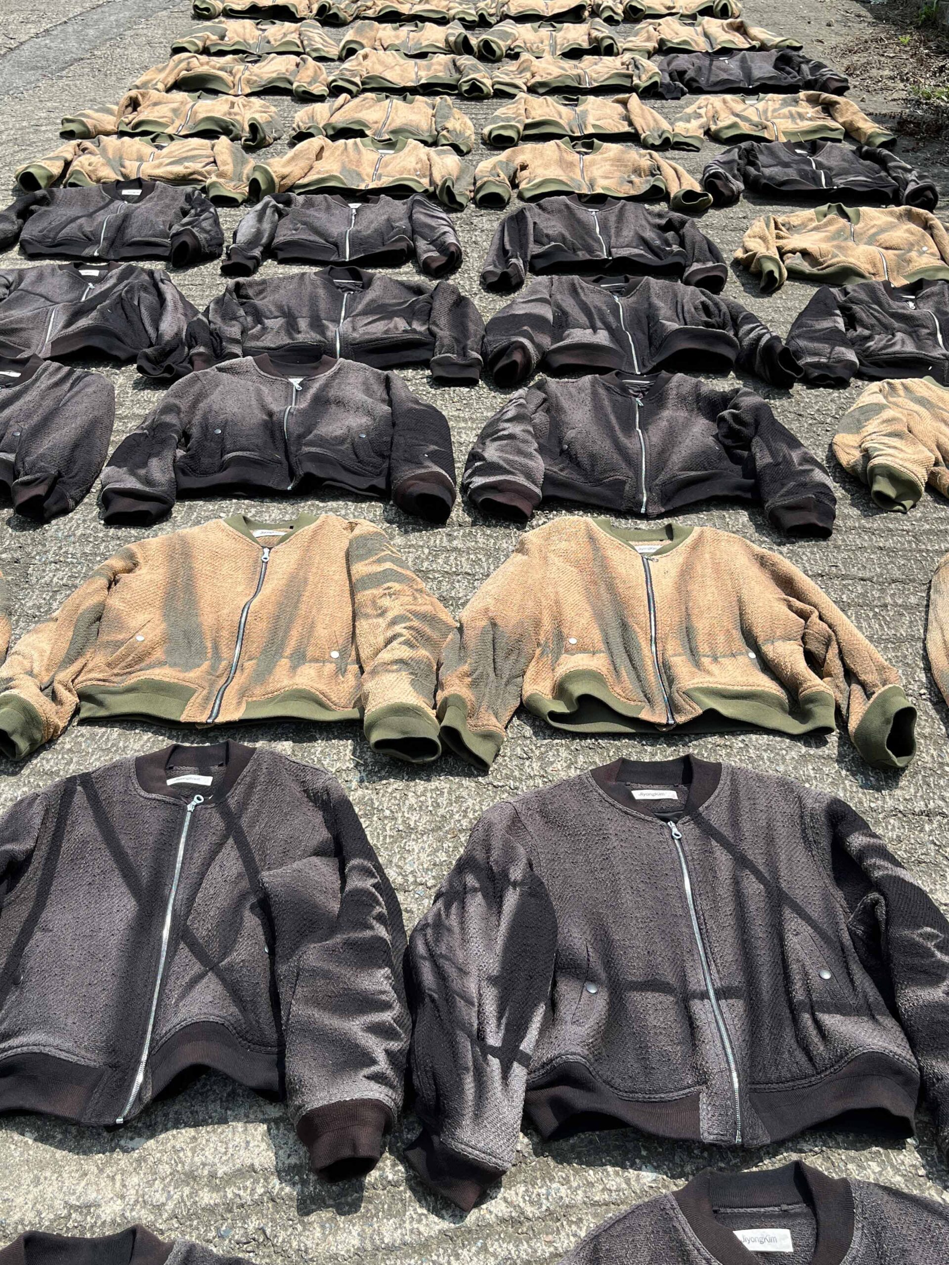 스페이스 이수에서 진행 중인 전시를 소개하고 싶어요. 전시장에는 지용킴이라는 브랜드를 시작하는 데 도움을 준 영감과 레퍼런스를 그대로 옮겨놨습니다. 예를 들어, 전시장 한쪽에 빛바랜 마네킹을 놓았는데요. 브랜드를 준비하던 4년 전 사진으로만 기록해 두고 영감을 얻었던 대상이에요. 이번에는 이를 직접 전시장에 배치하고 제가 영감받은 대상을 관객에게 소개하고 싶었어요. 고장 난 오토바이를 덮고 있던 새하얗게 빛바랜 천도 영감의 대상 중 하나인데, 길을 걷다 마주친 모습 그대로 옮겨놨어요. 가장 최근 발표한 컬렉션의 티셔츠와 제작 당시 큰 영감을 준 패킹 티셔츠를 함께 전시하면서 그 옆에는 다른 인상의 스타일을 풍기는 지용킴의 셔츠를 걸어놓기도 했고요. 더불어 이번 전시를 위해서 대형 작업을 진행했는데요. 버려진 유니폼을 분해하고 결합해 대형 캔버스로 만든 후 그 위에 선 블리치 기법으로 만든 유니폼을 다시 올려서 완성했습니다.