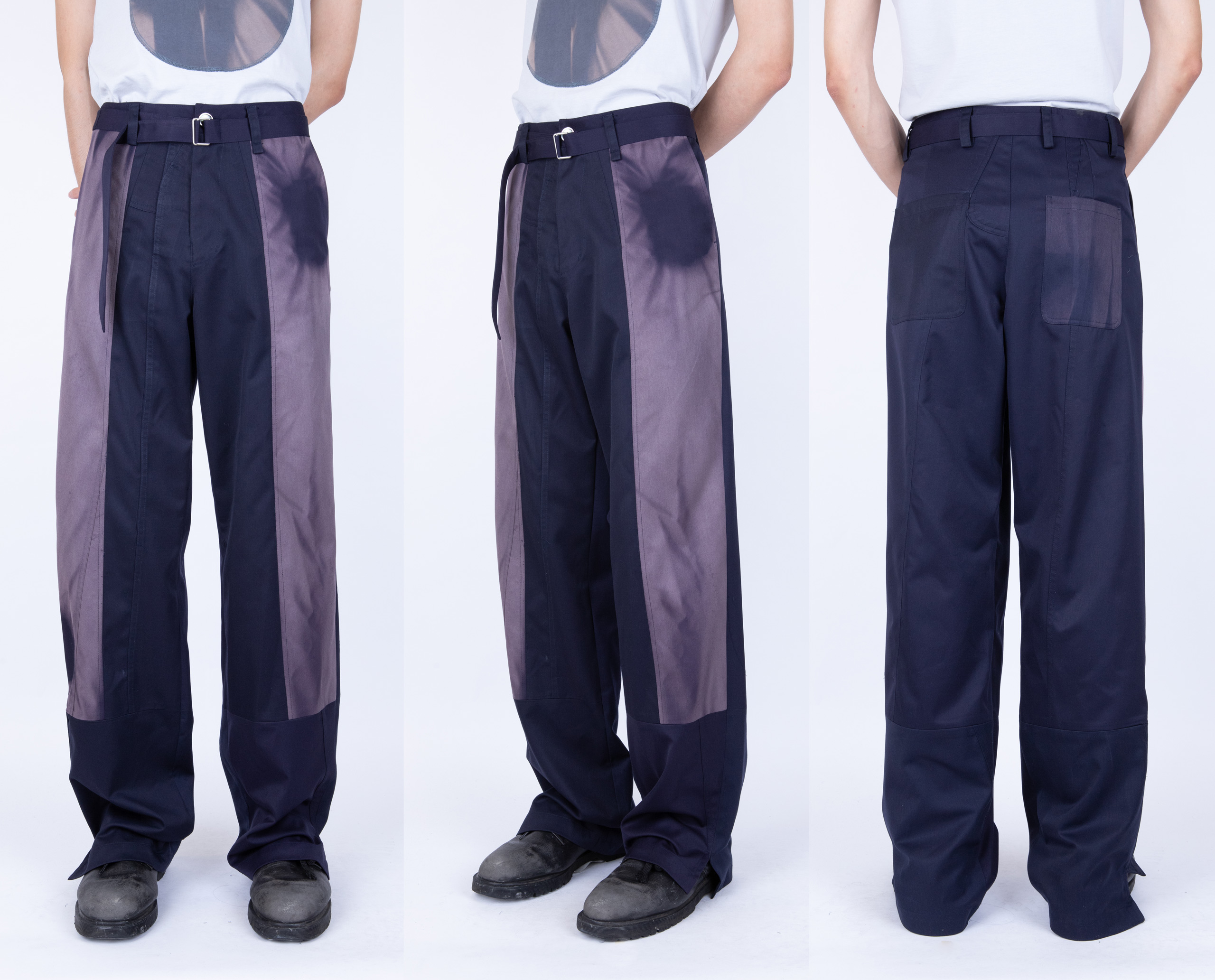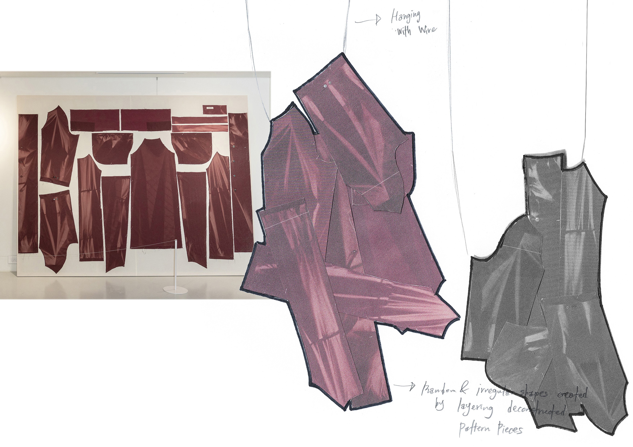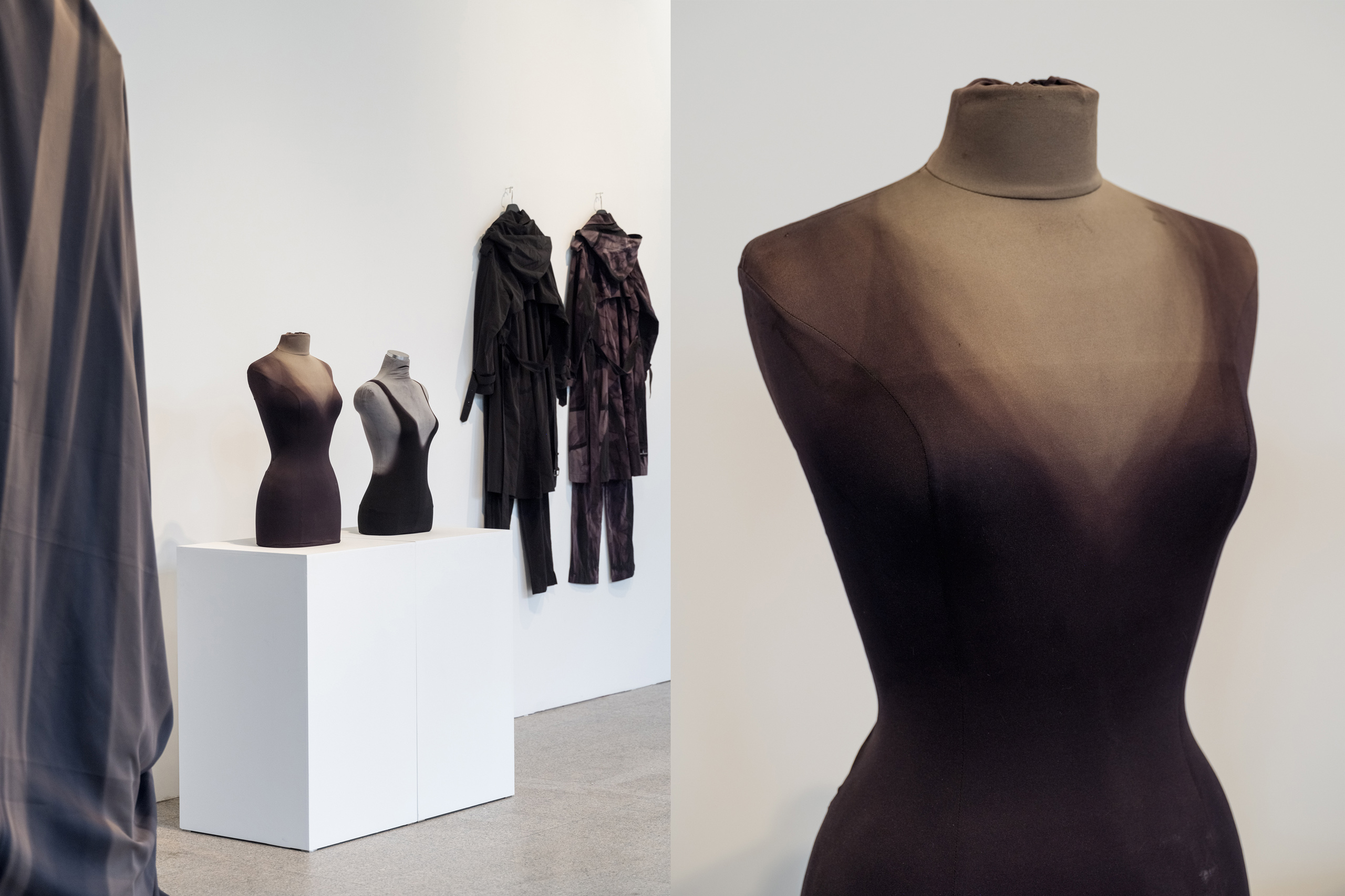 스페이스 이수에서 진행 중인 전시를 소개하고 싶어요. 전시장에는 지용킴이라는 브랜드를 시작하는 데 도움을 준 영감과 레퍼런스를 그대로 옮겨놨습니다. 예를 들어, 전시장 한쪽에 빛바랜 마네킹을 놓았는데요. 브랜드를 준비하던 4년 전 사진으로만 기록해 두고 영감을 얻었던 대상이에요. 이번에는 이를 직접 전시장에 배치하고 제가 영감받은 대상을 관객에게 소개하고 싶었어요. 고장 난 오토바이를 덮고 있던 새하얗게 빛바랜 천도 영감의 대상 중 하나인데, 길을 걷다 마주친 모습 그대로 옮겨놨어요. 가장 최근 발표한 컬렉션의 티셔츠와 제작 당시 큰 영감을 준 패킹 티셔츠를 함께 전시하면서 그 옆에는 다른 인상의 스타일을 풍기는 지용킴의 셔츠를 걸어놓기도 했고요. 더불어 이번 전시를 위해서 대형 작업을 진행했는데요. 버려진 유니폼을 분해하고 결합해 대형 캔버스로 만든 후 그 위에 선 블리치 기법으로 만든 유니폼을 다시 올려서 완성했습니다.