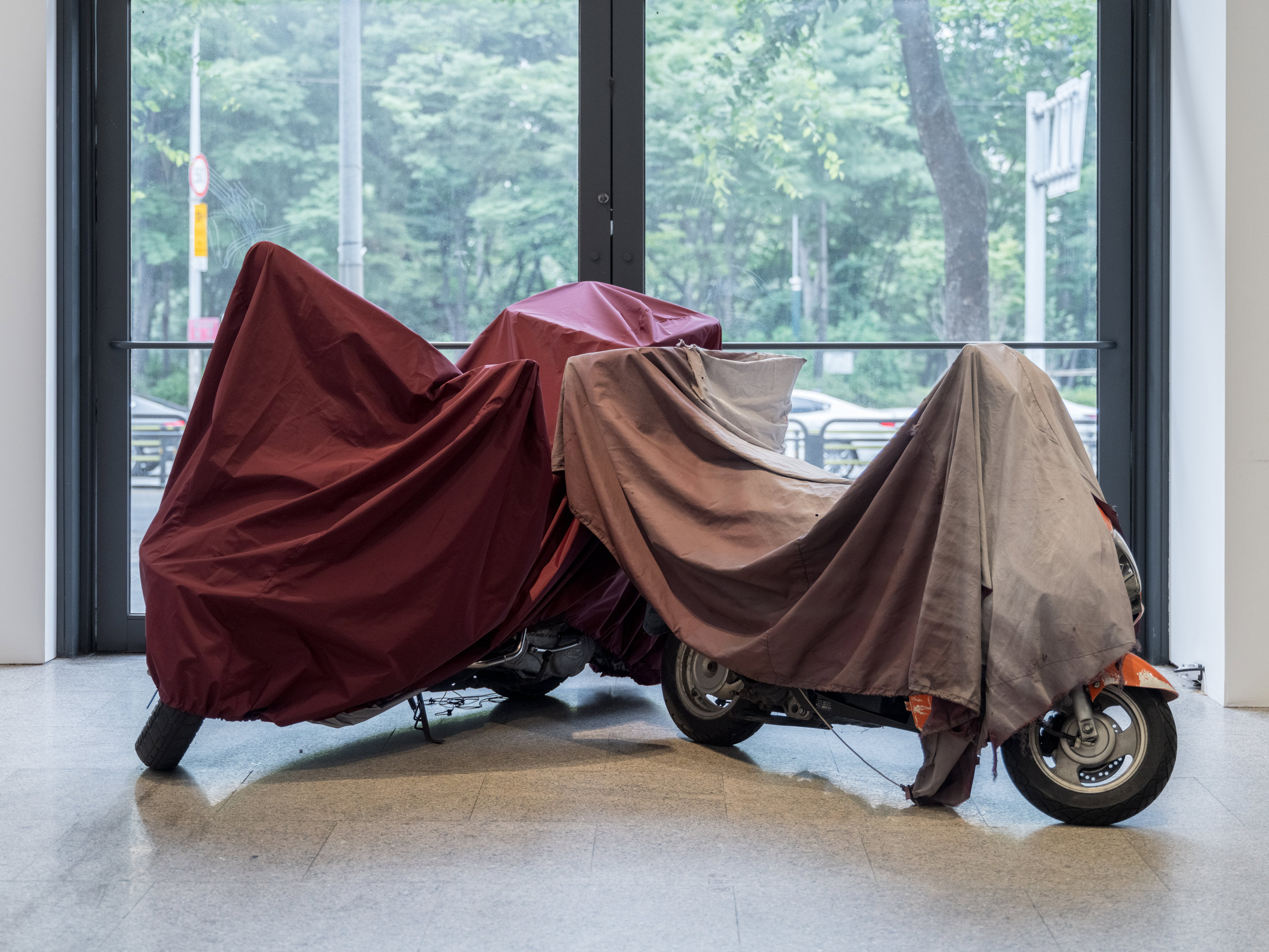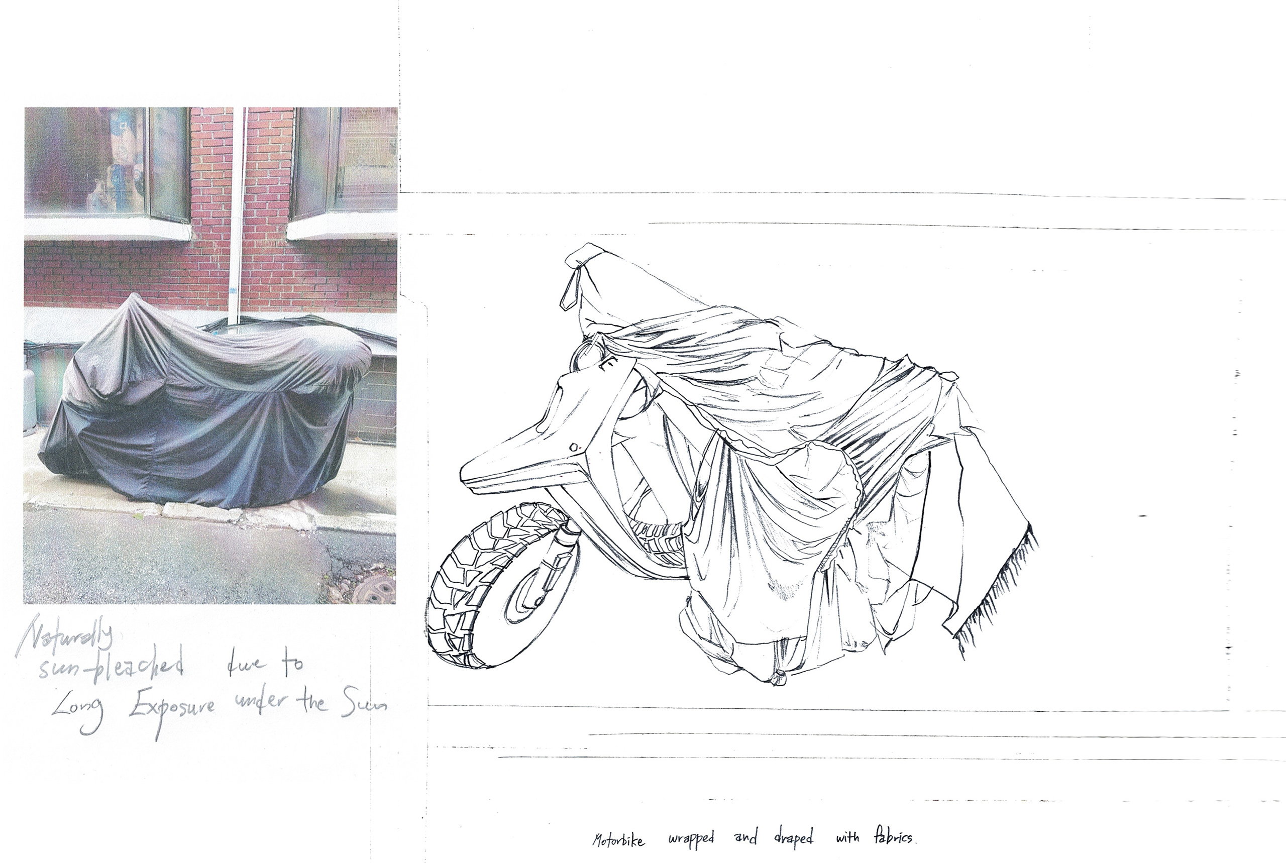 지용킴은 사람들이 가치 없다고 여기는 것에서 영감받아 시작한 브랜드예요. 의도적으로 만든 대상보다 자연스럽고 우연에 따라 구축된 풍경과 물건이 제게 영감을 줍니다. 방치된 채 새하얗게 변한 오토바이 커버, 혹은 비바람에서 보호하기 위해 물건 위에 덮은 천의 실루엣 등이 좋은 예가 되겠네요. 여기에 제 경험이나 상상을 덧대어 작업을 시작하는 편입니다.