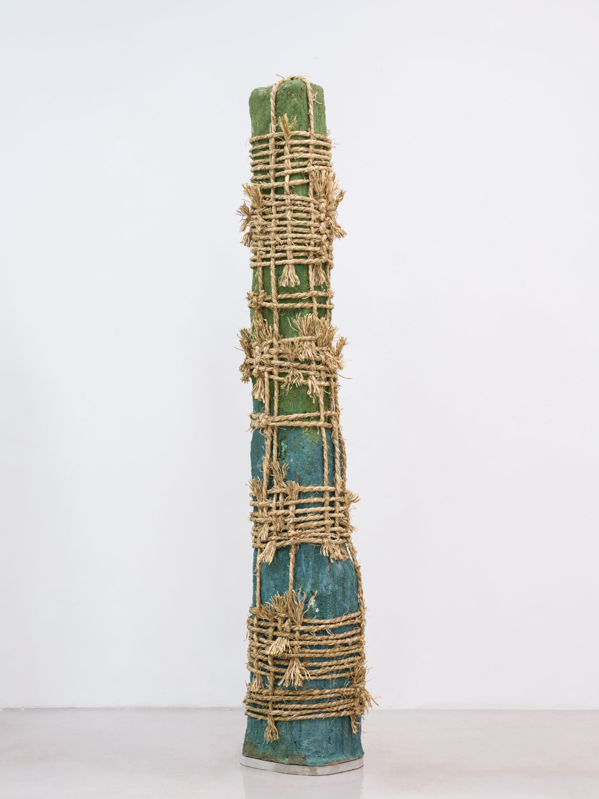 ‹손돌 구름 가리개›, 2024, 시멘트 위에 생활 폐기물 위에 철망 위에 흙 혼합물(흙, 석회, 산화철, 천연 안료) 위에 새끼줄, 220×33×30cm, 사진 홍철기