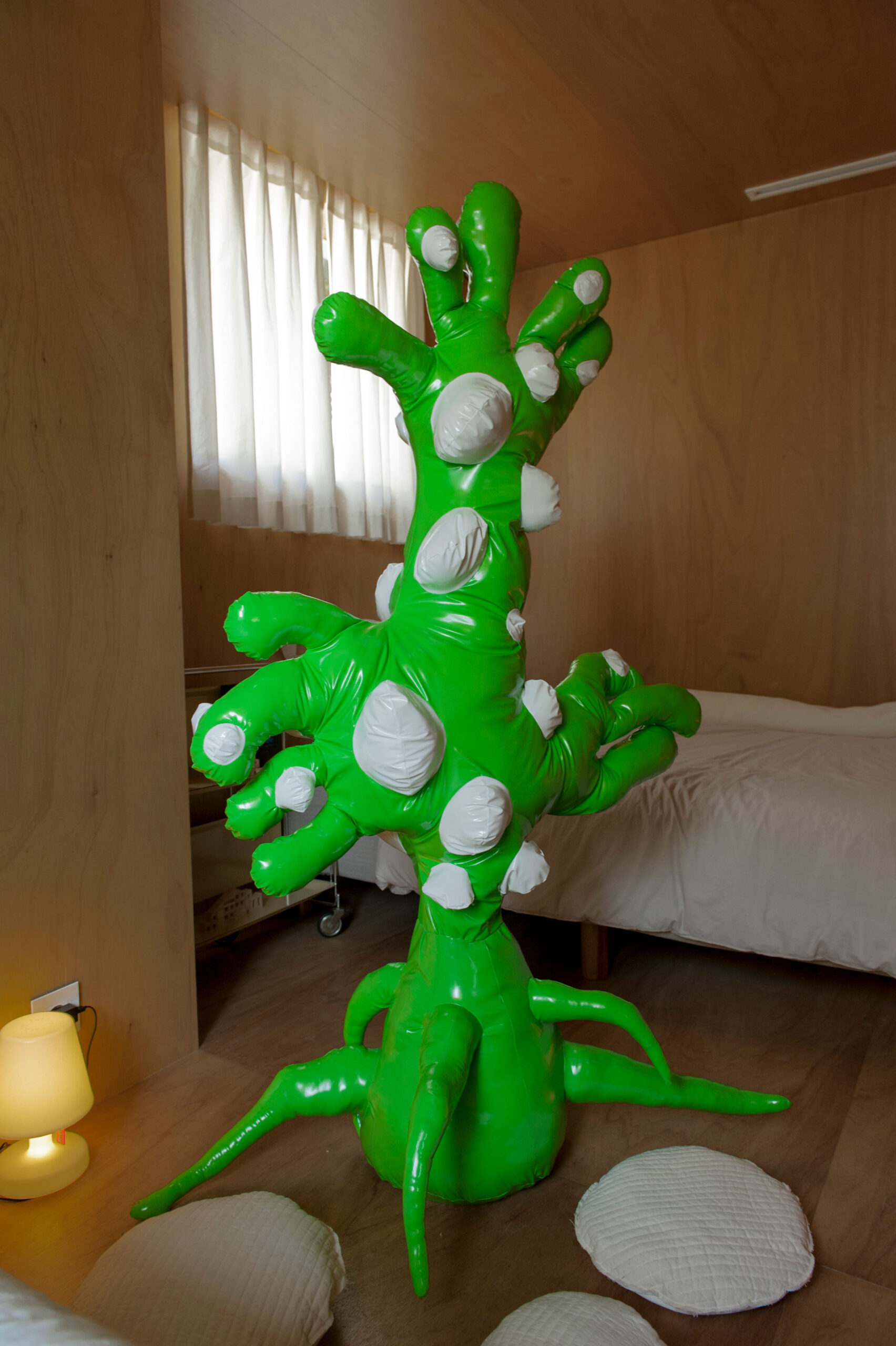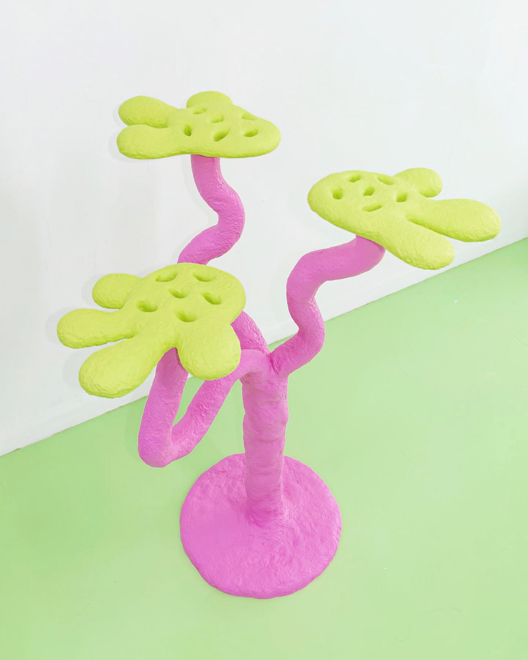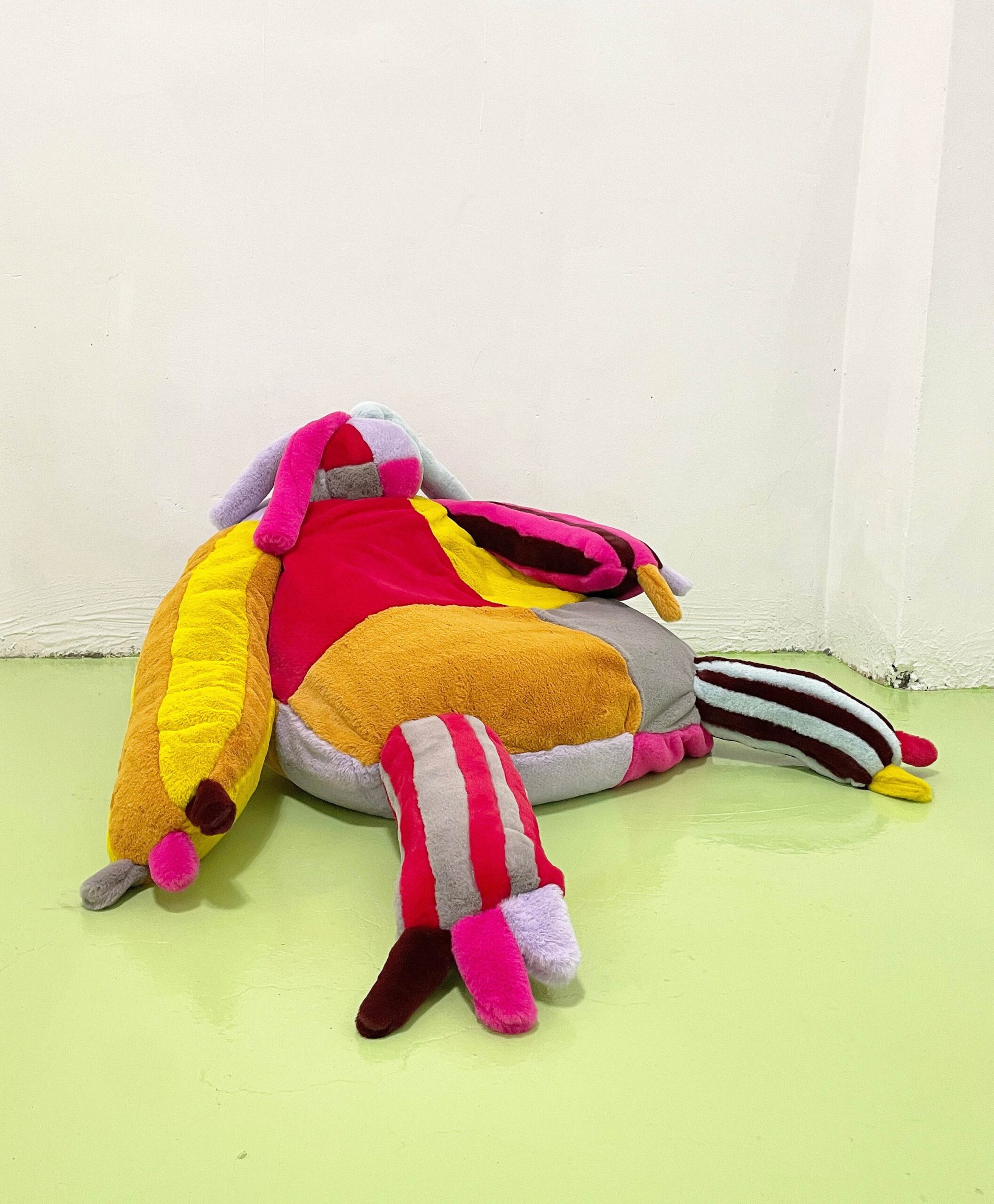최근 다른 매체를 활용하는 분들과 협업 작업을 자주 진행했어요. 올해 3월에는 용산구에 있는 다이닝 쇼룸 ‘레벨제로Level:0’와 협업해 인공 나무 조형 작업 ‹Amo Tree›를 제작했습니다. 어릴 때 나무에서 열매를 따 먹던 기억을 떠올리며, 자연과 어우러져 식문화를 즐길 수 있는 작품을 설계했어요. 나무의 잎사귀 부분에는 제벨제로에서 제 시그니처 캐릭터 ‘아모Amo’ 형태를 본떠 자연 재료로 만든 ‘Olive- Amo’, ‘Tomat Amo’, ‘Ses Amo’를 열매처럼 놓았는데요. 방문객이 음료와 함께 곁들여 먹을 수 있었죠. 아모를 다양한 맛으로 느낄 수 있도록 만들어주신 덕분에 재미있는 식경험을 설계할 수 있었던 기회였어요. 그리고 올해 4월부터 6월까지는 문화역서울284에서 열린 공예기획전 «다시, 자연에게 보내는 편지»에 참여했어요. 저는 게임 제작팀 ISVN과 협업해 ‘PYU’ 빈백을 제작하고 ‘P.O.G 게임’ 속 디지털 작업을 관람하실 수 있도록 준비했어요. PYU 빈백은 캐릭터 아모가 ‘퓨-우’하고 안도의 숨을 내쉬는 모습을 모티브로 삼아 제작한 빈백이에요. 모니터와 키보드가 놓인 책상 앞에 아모가 앉아있는 장면을 연출했고, 관람객은 아모 위에 앉아 포그 게임을 즐길 수 있도록 했답니다.