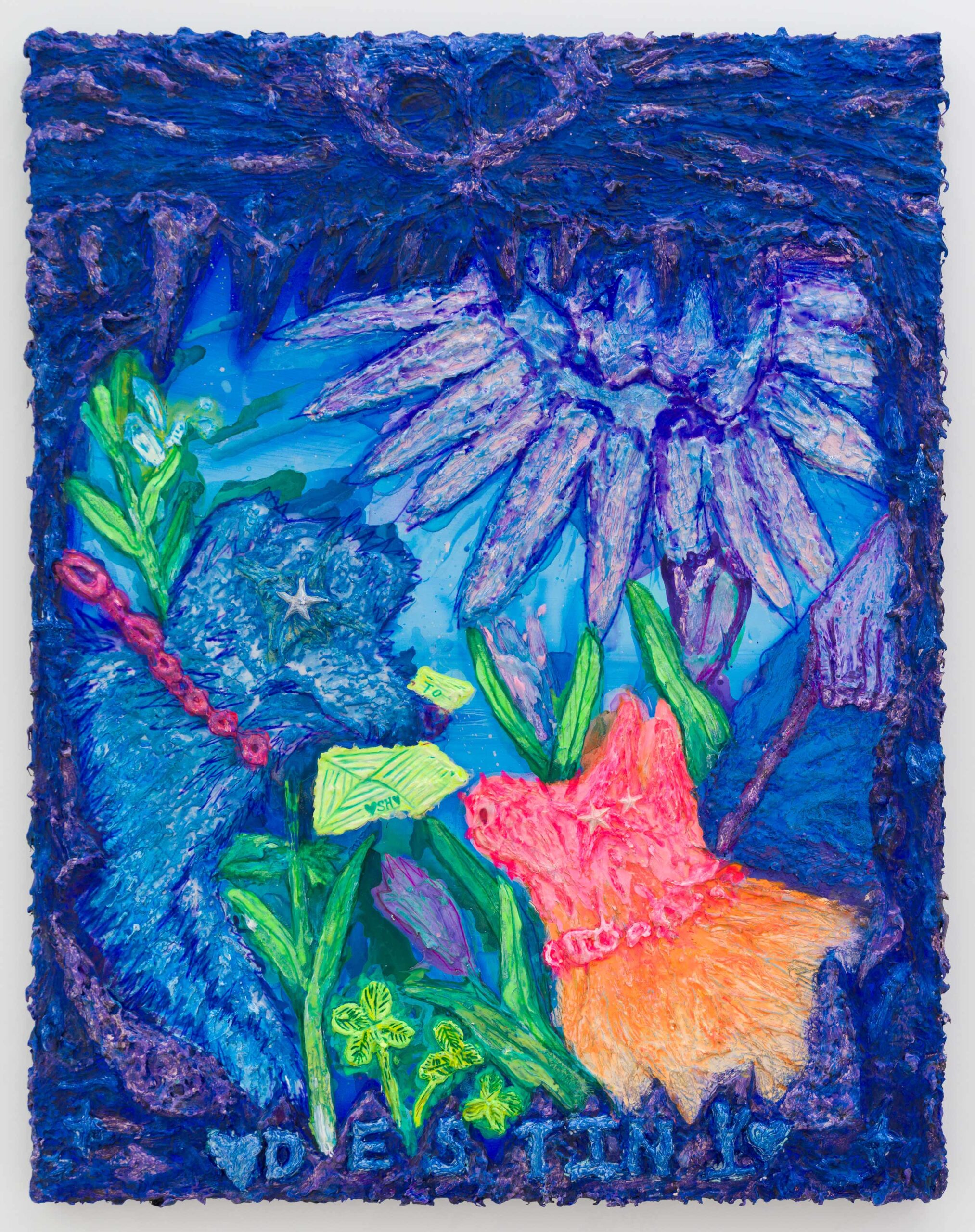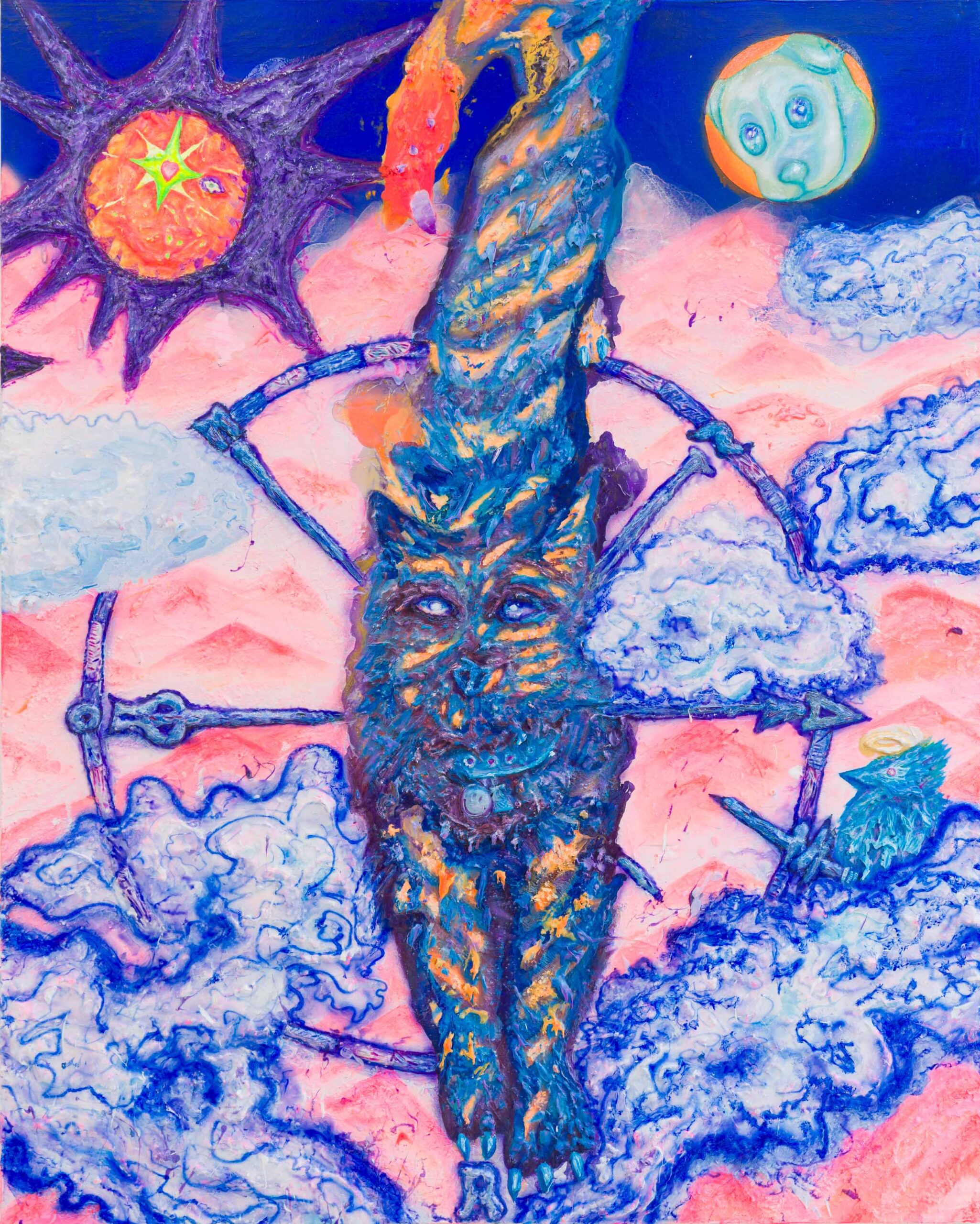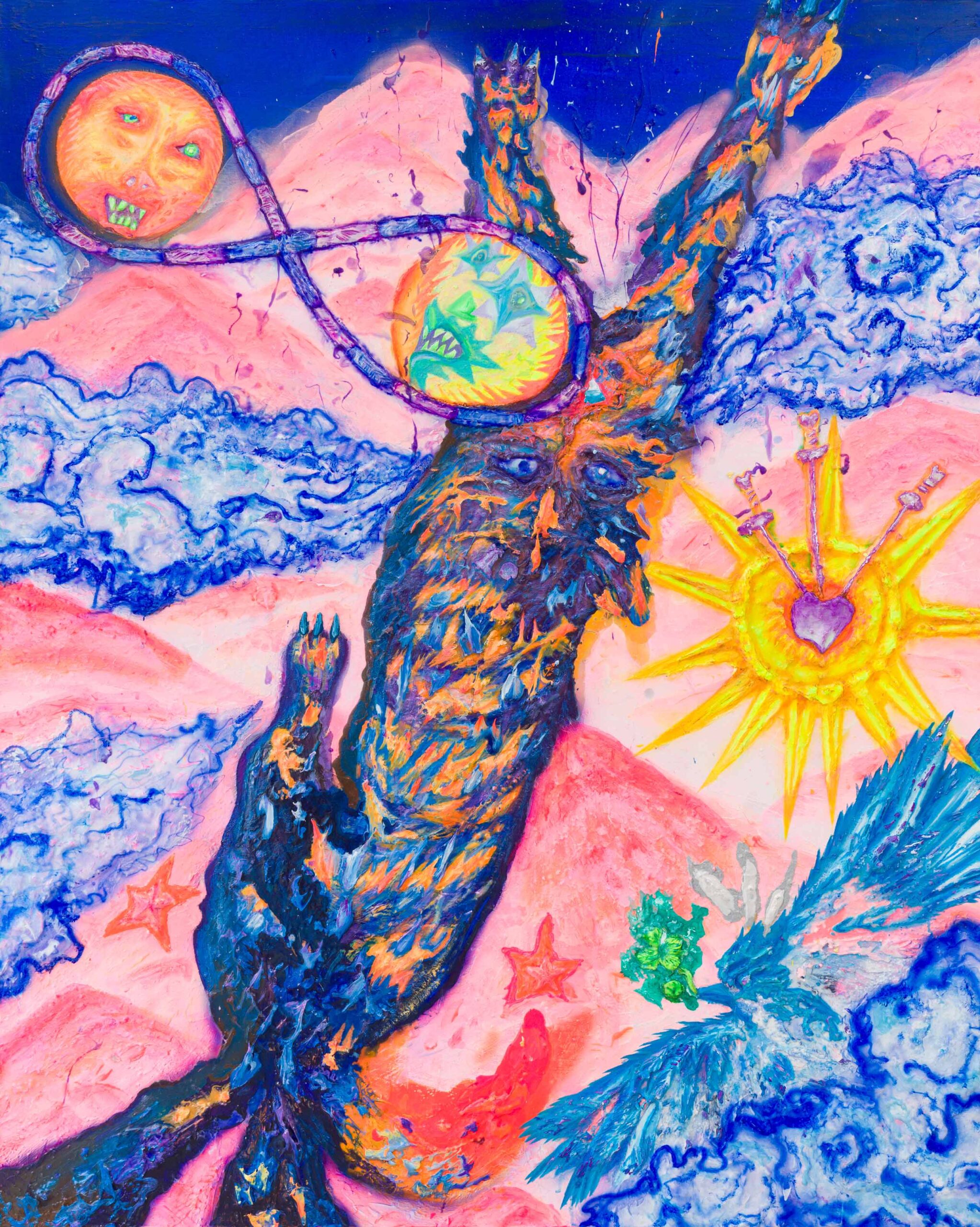‹Destiny›, 2023, acrylic, acrylic medium, water based marker and pigment powder on canvas, 117×92 cm