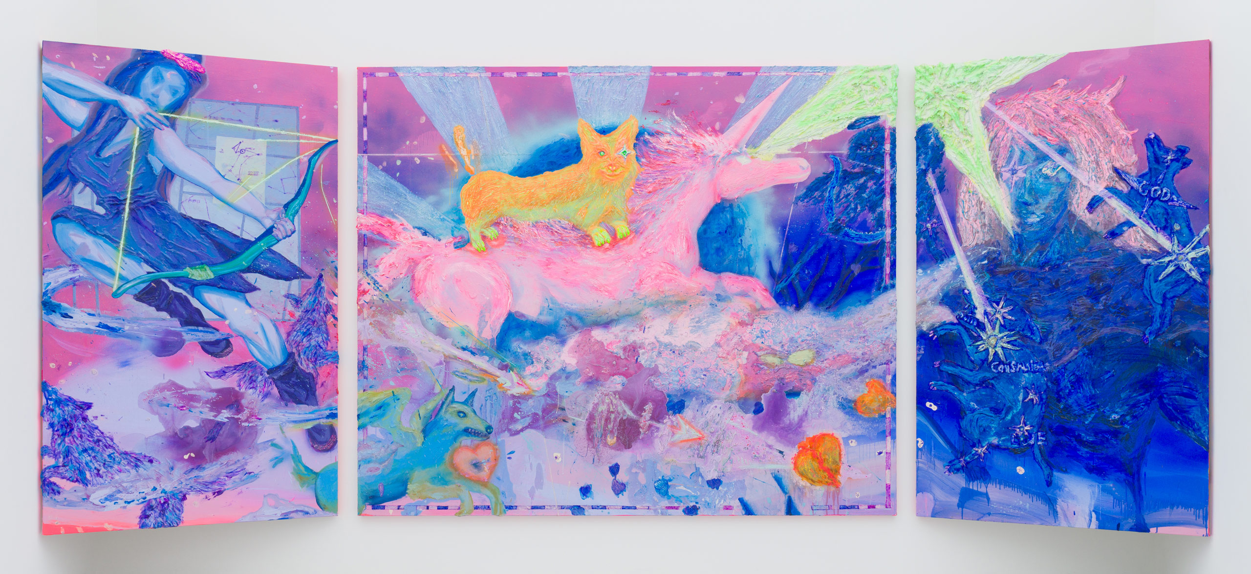 ‹End of Summer›에는 앞서 설명해 드린 시리우스 자리가 한 여름날에 밝게 빛나며 펼쳐지는 일을 담아냈습니다. 세 폭의 화면에는 달의 여신 아르테미스Artemis와 그녀를 수호하는 개들, 아르테미스를 은밀하게 탐하다가 사슴으로 변해 그가 키우던 사냥개에게 물려 죽는 인간 악타이온Actaeon, 그리고 사랑했던 연인 아르테미스에 의해 예상치 못한 죽음을 맞는 비극적인 운명의 오리온Orion과 그의 충견 시리우스의 이야기가 얽혀있는데요. 화면 중앙에는 유니콘을 타고 떠나는 개를 그려 넣었어요. 여름의 끝을 향한 모험을 꿈꾸는 개의 모습을 새로운 시작을 암시하는 장치로 활용했습니다.