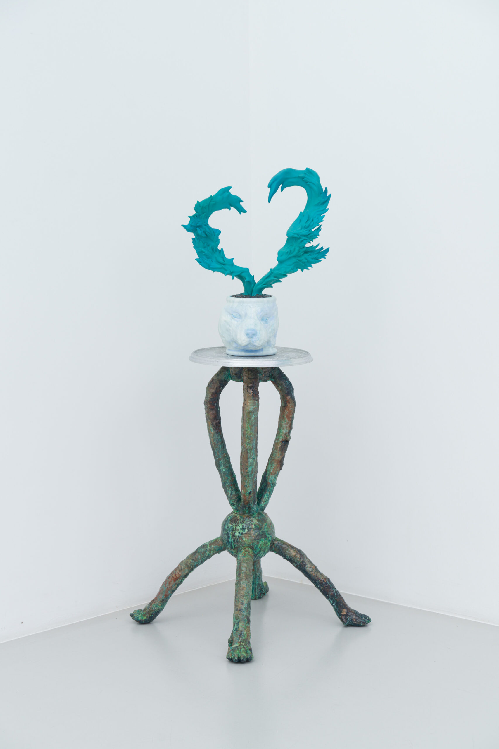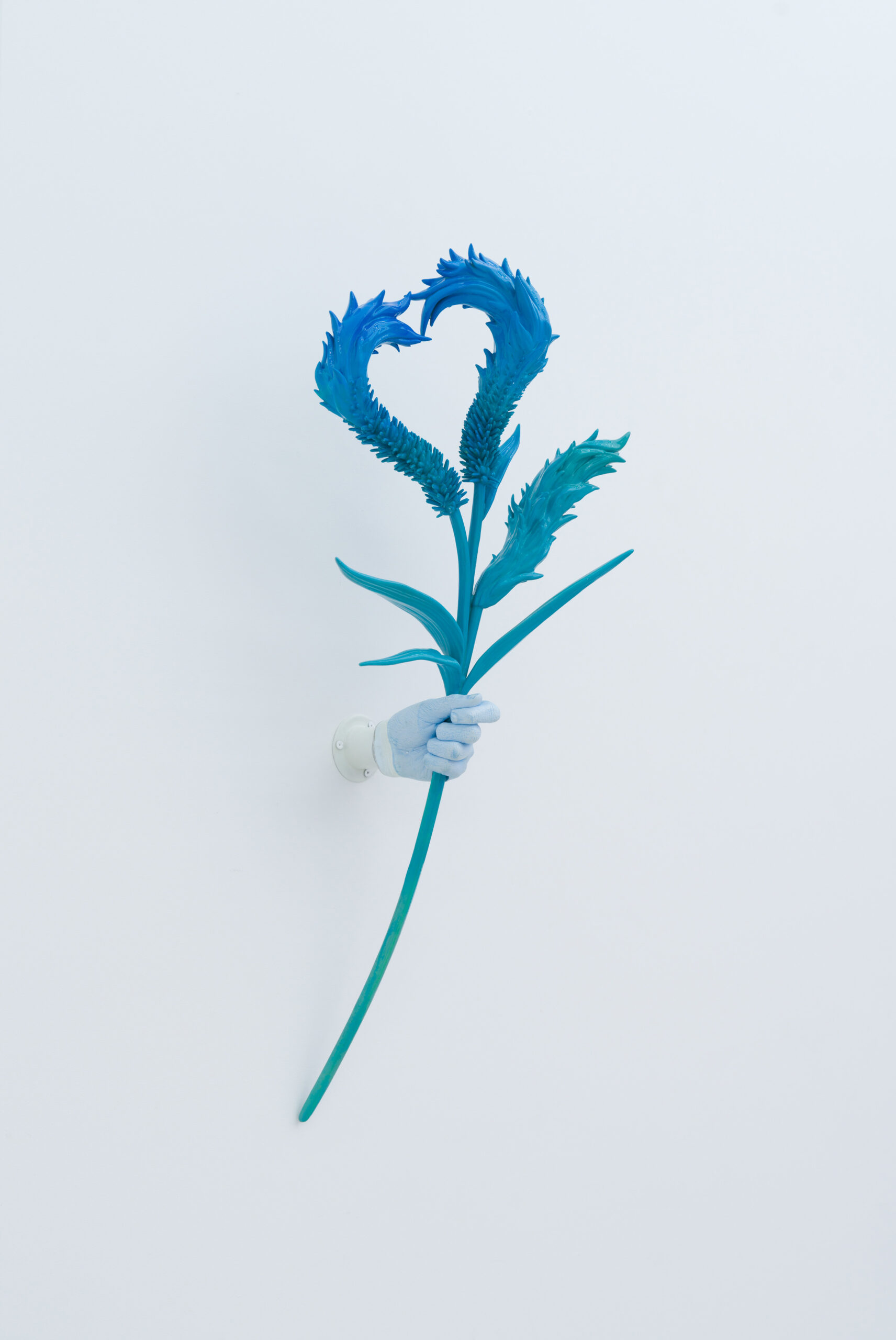 ‹천국의 신화›는 다양한 문화권에서 관찰되는 개의 신비로운 속성에서 시작한 3D 입체 작업이에요. 동양화의 난에서 알 수 있는 전통문화와 철학, 그리고 전설적인 이야기의 상징을 개의 머리에서 솟아나는 난초의 형태로 묘사해 각 요소 간의 다중적인 관계를 그려냈습니다. 3D로 만든 상상 속 대상의 표면에는 다양한 회화적 매체를 운용해 실사적인 구현을 시도하기도 했죠. 또한 개의 머리 모양 화분은 개의 다리 모양을 본뜬 테이블이 받쳐주고 있는데요. 여러 문화권에서 개의 다리를 본뜬 가구는 개가 품은 ‘수호성’을 뜻하더라고요. 이런 서사를 바탕으로 영험한 기운을 지닌 신화적 토템을 완성했습니다. ‹강아지풀›은 빠르게 흔들리는 개의 꼬리에서 인간과 소통가능한 언어적 신호를 포착한 것을 계기 삼아 작업했어요. 강아지풀의 형태를 활용해 다정히 꽃을 건네는 듯한 모습으로 전환했습니다.