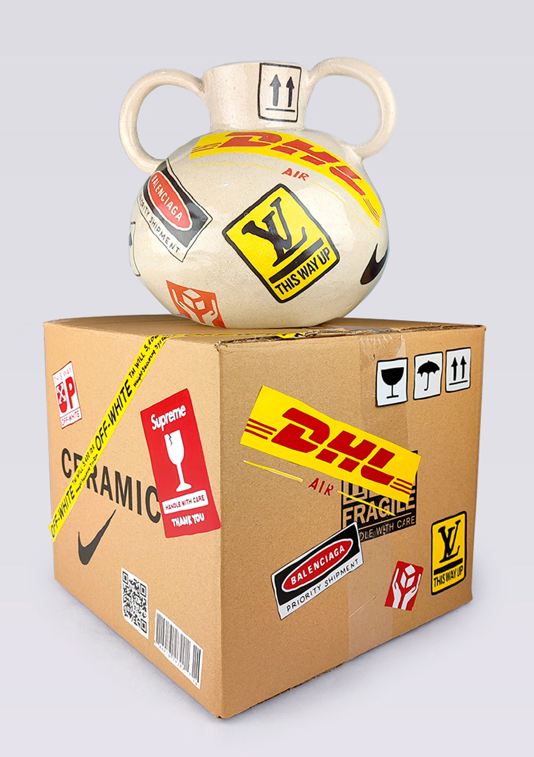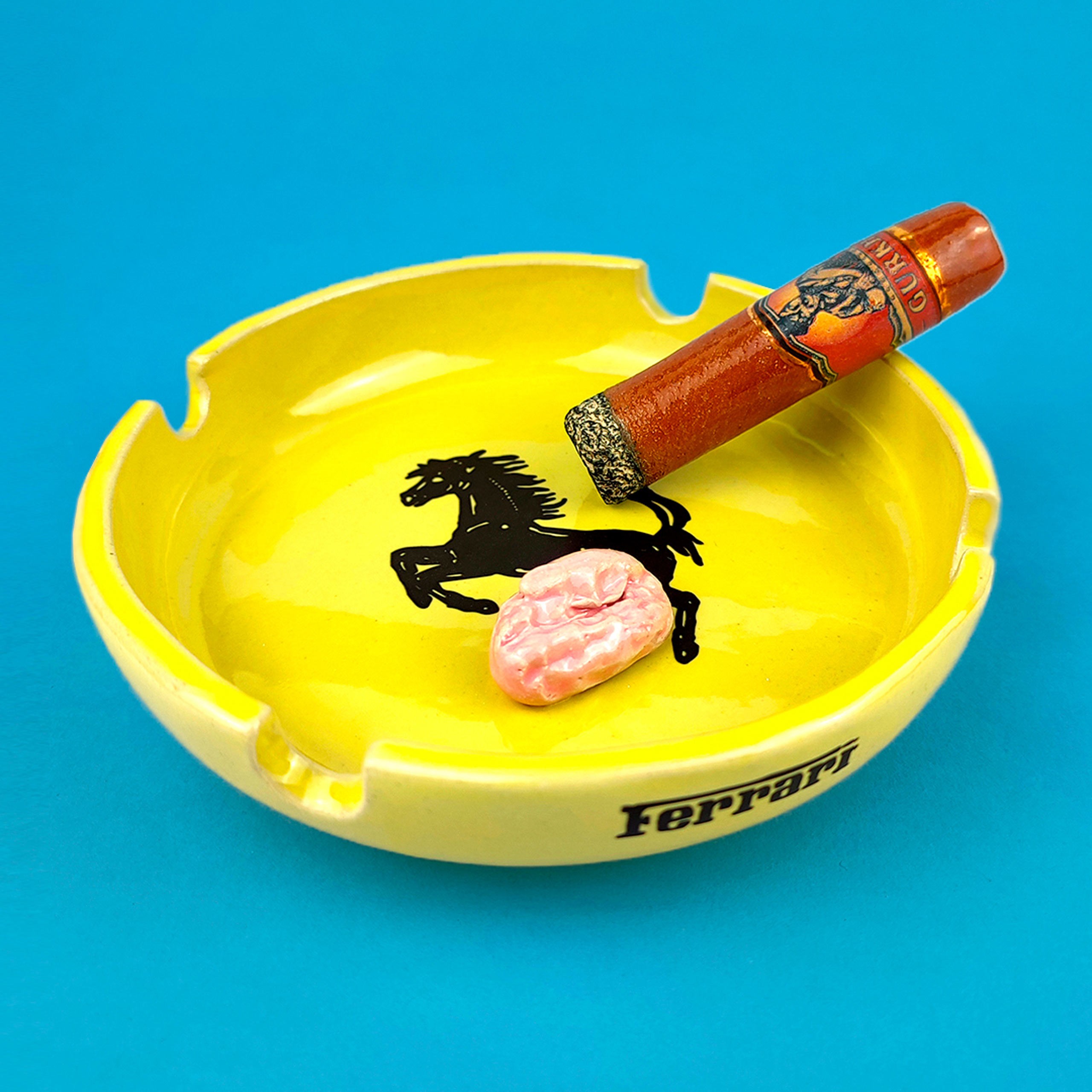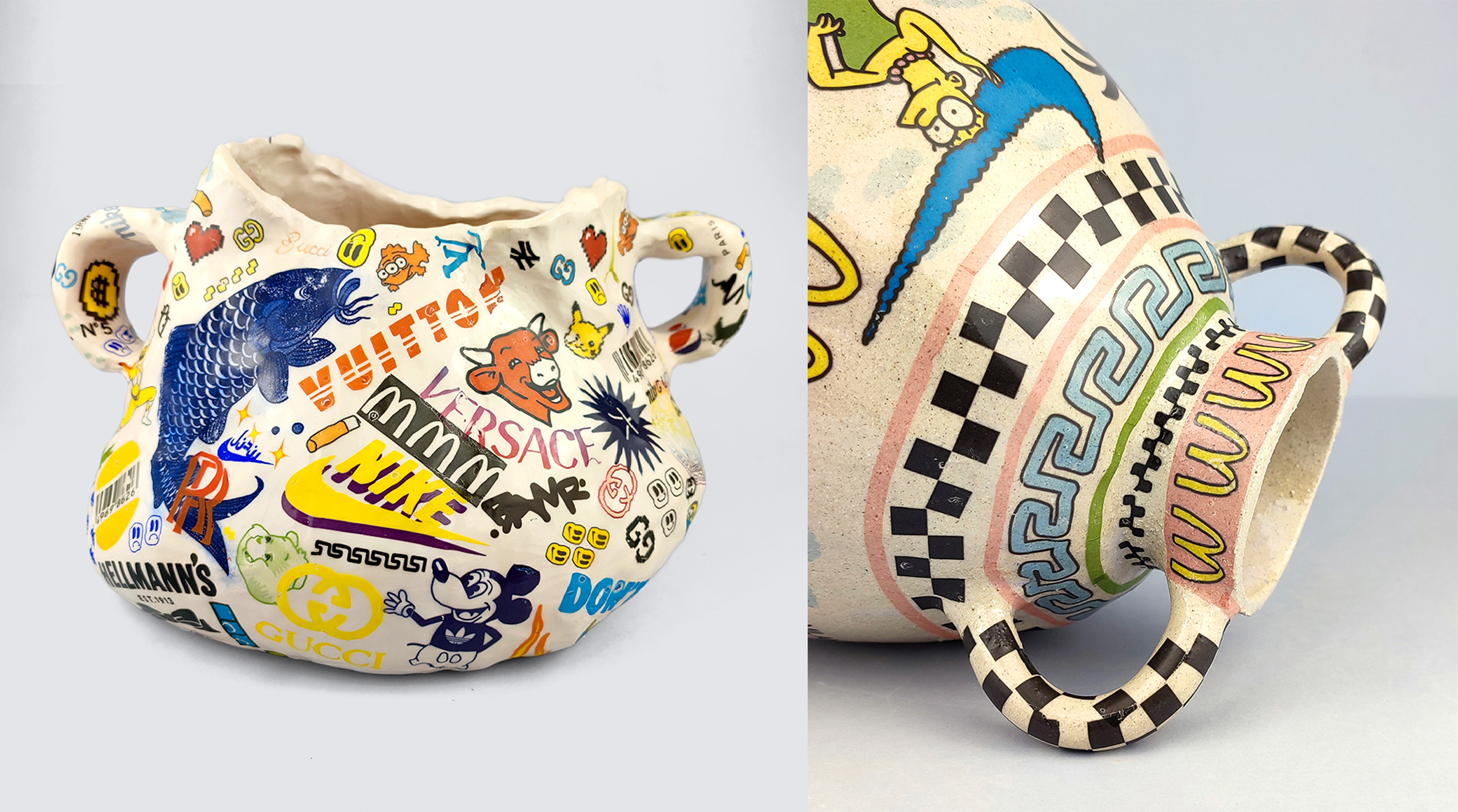 저희는 현시대의 담론을 기반 삼아 오래전에 사용하던 세라믹 오브제의 형태를 차용하고 있어요. 예를 들어 형태만 보면 고대 유물 느낌이 물씬 흐르지만 그 위에는 신자유주의, 소비주의, 세계화를 암시하는 인물이나 상징을 그려내는 거죠. ‹Ferrari ashtray›가 대표적인 예시일 것 같네요. ‘페라리’ 로고가 박힌 재떨이를 보면 뭔가 되게 럭셔리하잖아요. 사람들이 쉽게 접근하기 어려운 사회적 지위를 암시하죠. 저희는 여기에 씹다 버린 껌, 피다 만 담배, 다 써버린 지하철 티켓이나 작은 동전을 올려두며 상황을 전복시켜요. ‘가치 있는 쓰레기’를 만들기 위해 노력하고 있달까요. (웃음)