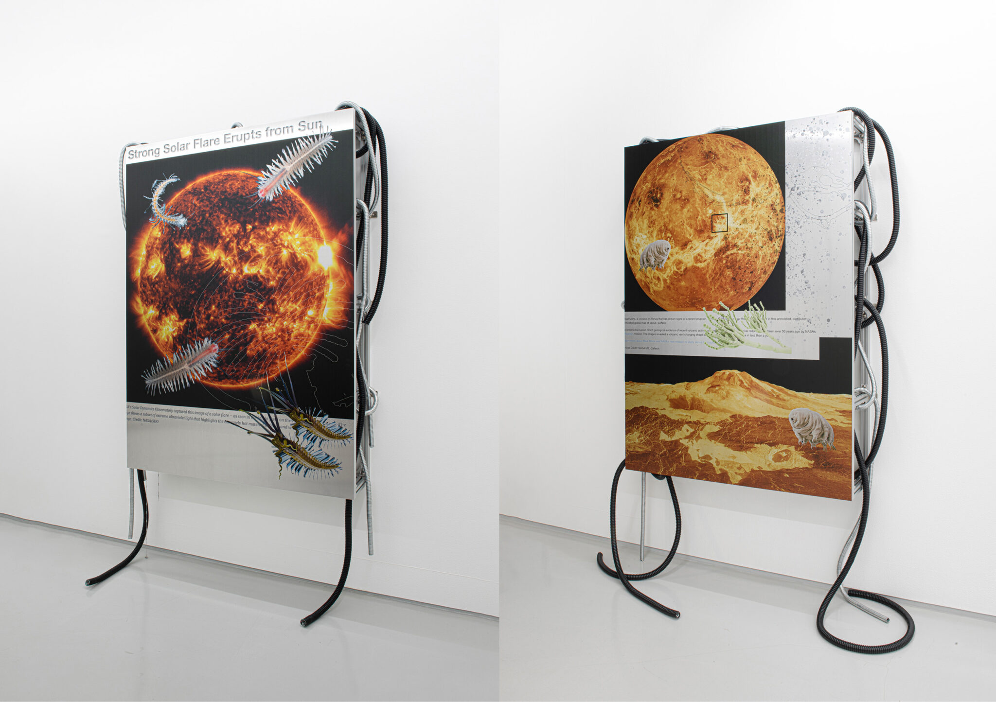 당시 실린더1에서 전시한 작품 중 ‹Survivor (on the horizon)›, ‹Dune›, ‹The Sun (a system of friction)› 은 알루미늄판에 인터넷 기사에 실린 우주 행성, 미생물, 해저 생물, 곰팡이 균 이미지 일부를 콜라주한 결과인데요. 알루미늄 프로필 프레임에 전선 케이블을 얽히게 했어요. 서로 다른 위치와 거리, 스케일의 존재가 인간의 감각으로 인지할 수 없는 영역에서 언제나 연결성을 지닌 채 상관관계를 이루고 있다는 걸 이야기하고 싶었습니다. 인간이 지구의 한 부분으로서, 끊임없이 이루어졌던 지구 표면적 침투, 변형, 인간 중심적 관점에서 벗어난 그 너머의 영역에 대해 인간이 지금껏 통제하고 이해하려고 했던 지구 표면적인 스케일과 그 너머에서 끊임없이 현재를 구성하는 것에 대해 표현하려고 했어요. 더불어 끊임없이 발전하는 기술이 인간의 통제가능한 영역 이상까지 침범하는 상황에서 우리가 직면한 지구에서의 삶의 위기와 인간과 인간 아닌 존재의 조화, 다가올 미래를 위한 삶의 방향성, 관계에 대해 생각해 보려는 의도로 작업에 임했습니다.
