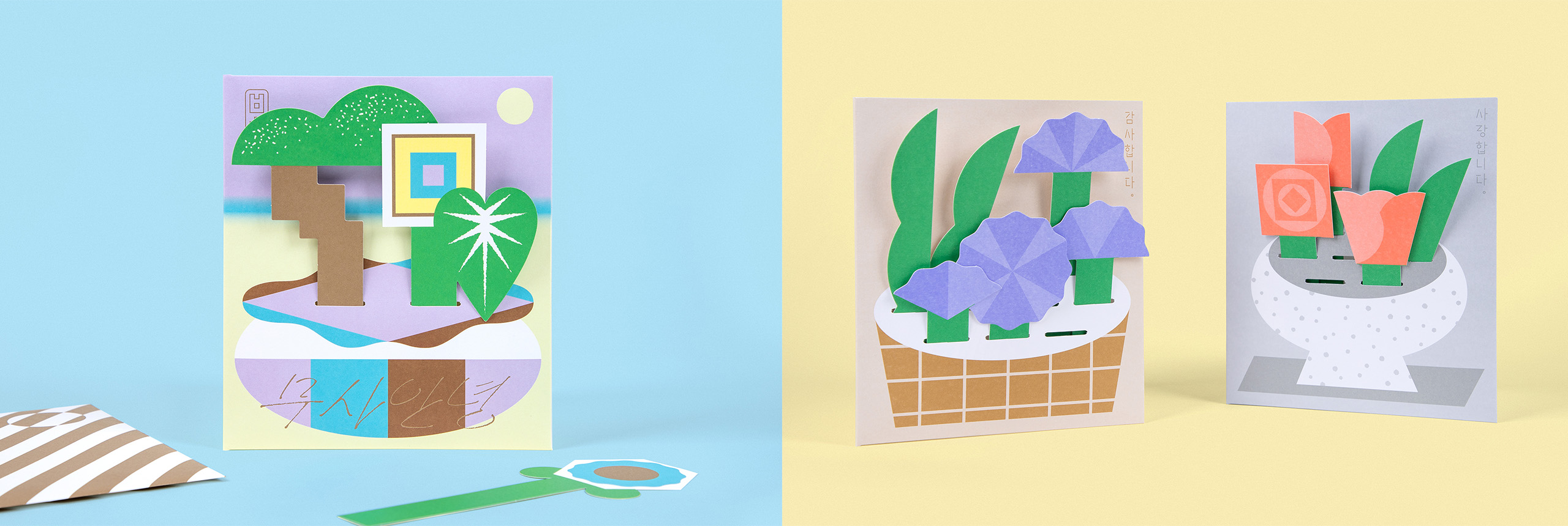 새해에는 주변 사람들의 평안과 행복을 기원하는 카드 ‹LOVE & pieces — 무사안녕›을 만들었습니다. 카드에 세 가지 종이꽃을 두어서 사람들이 직접 꽃꽂이해보고 감상할 수 있도록 했어요. 세 가지 꽃은 한 해의 시작을 맞이하며 각자의 마음속에 피어났으면 하는 ‘사랑’과 ‘희망’, 그리고 ‘청정함’을 뜻한답니다. 카드 앞면에는 직접 레터링한 글자 ‘무사안녕’도 적어서 다사다난한 시대에 모두의 건강과 평안을 기원하는 마음을 담았죠. 특히 꽃꽂이는 제가 지속적으로 탐구하고 있는 주제 중 하나인데요. 몇 년 전 마음이 힘들 때 수강한 꽃꽂이 수업이 계기가 되었어요. 꽃꽂이가 마음의 평화와 집중을 유도하는 정신적 효과를 가지고 있다는 사실을 알게 되었거든요. 단순한 장식의 목적을 넘어, 직접 식물을 만지고 느끼면서 조화로운 배치를 찾아나가는 행위를 통해서 말이죠. 제가 만든 이미지와 사물을 통해 간접적으로나마 동일한 경험을 할 수 있기를 바라며 여러 작업을 시도하고 있습니다.