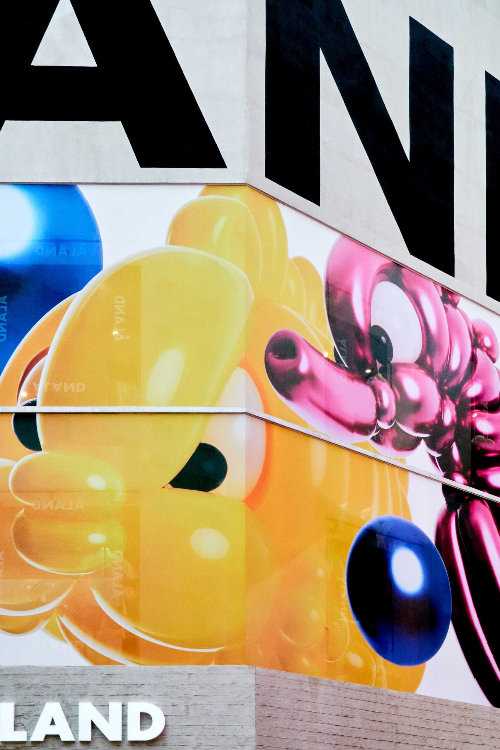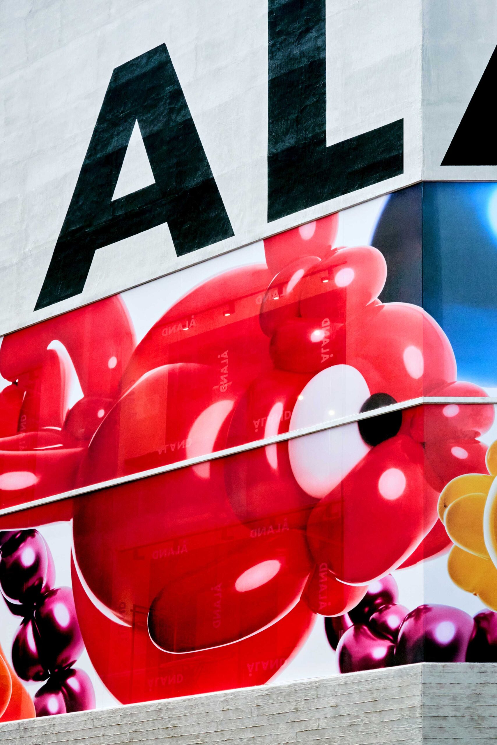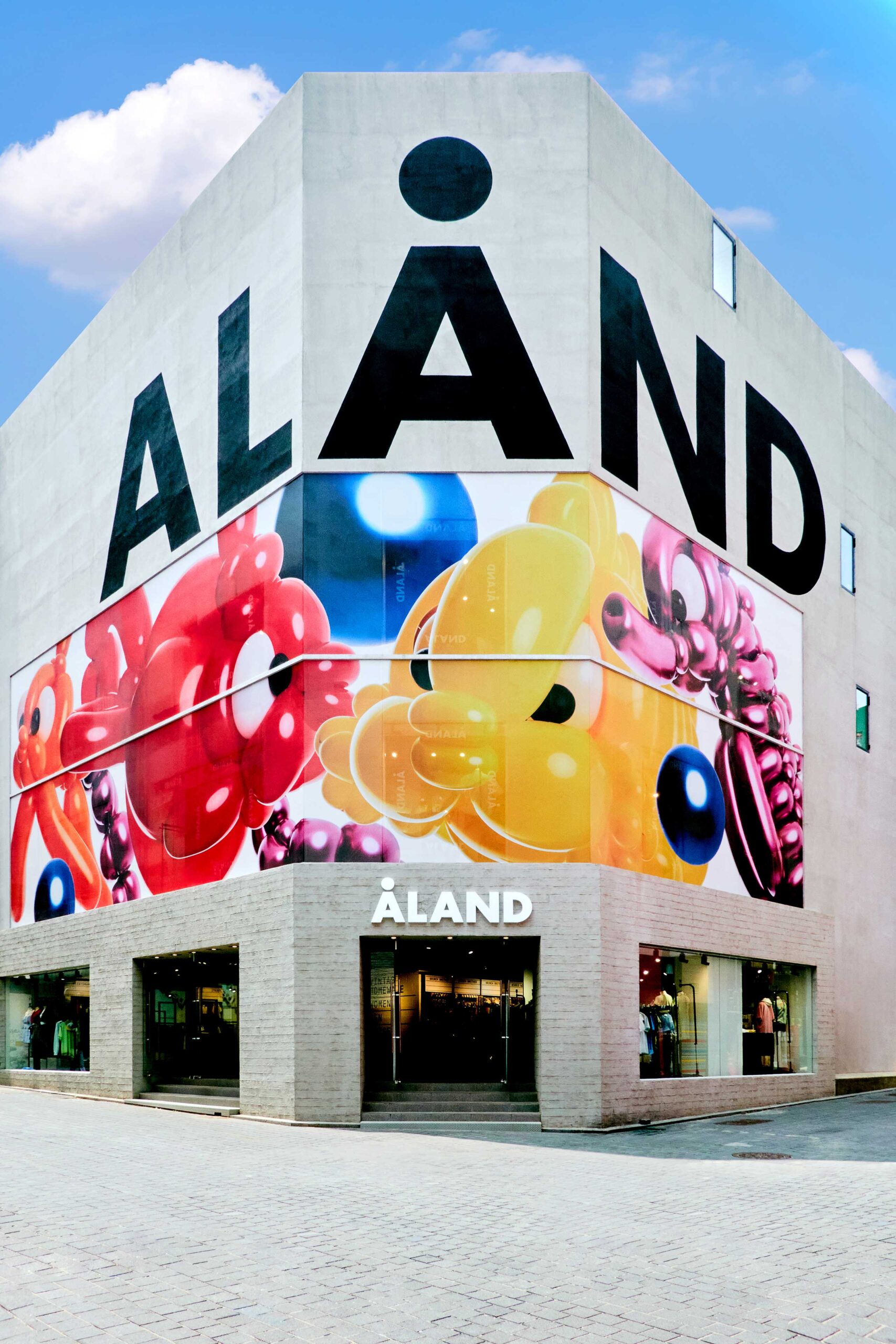 지난 5월에는 에이랜드 명동 본점 비주얼 작업을 했어요. 명동에 에이랜드 매장이 새로 오픈하면서 외벽에 걸리는 비주얼 작업을 의뢰받았죠. 어떤 작업을 할까 고민하던 중, 에이랜드 로고의 A 위에 찍힌 원을 보고 막연하게 파란 풍선으로 만들면 좋겠다고 생각했어요. 그래서 풍선 아티스트 김태윤 님을 섭외해 에이랜드 심볼에 사용한 물고기가 연상되는 다양한 물고기를 파란 구 형태의 풍선으로 만들었죠. 건물의 세 면을 감싸는 외벽 구조물이라 모든 각도에서 쾌적하게 보이도록 레이아웃 구성과 배치에 신경을 많이 썼어요.
